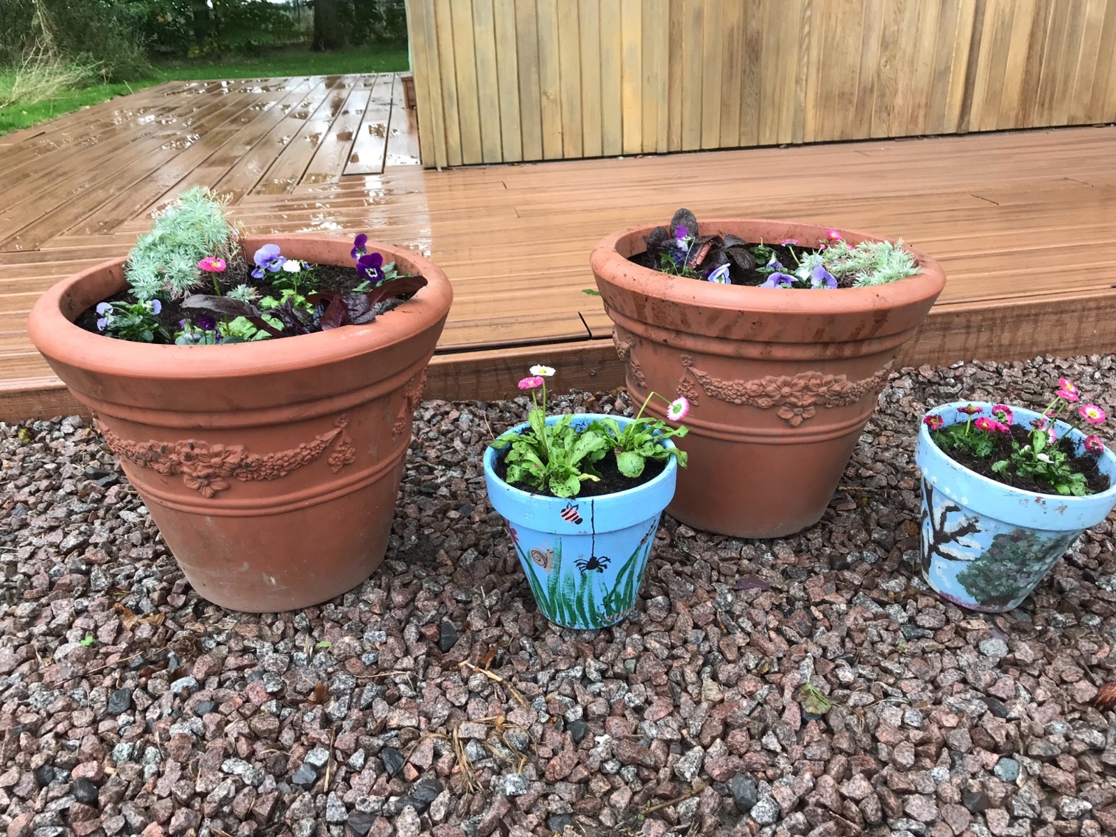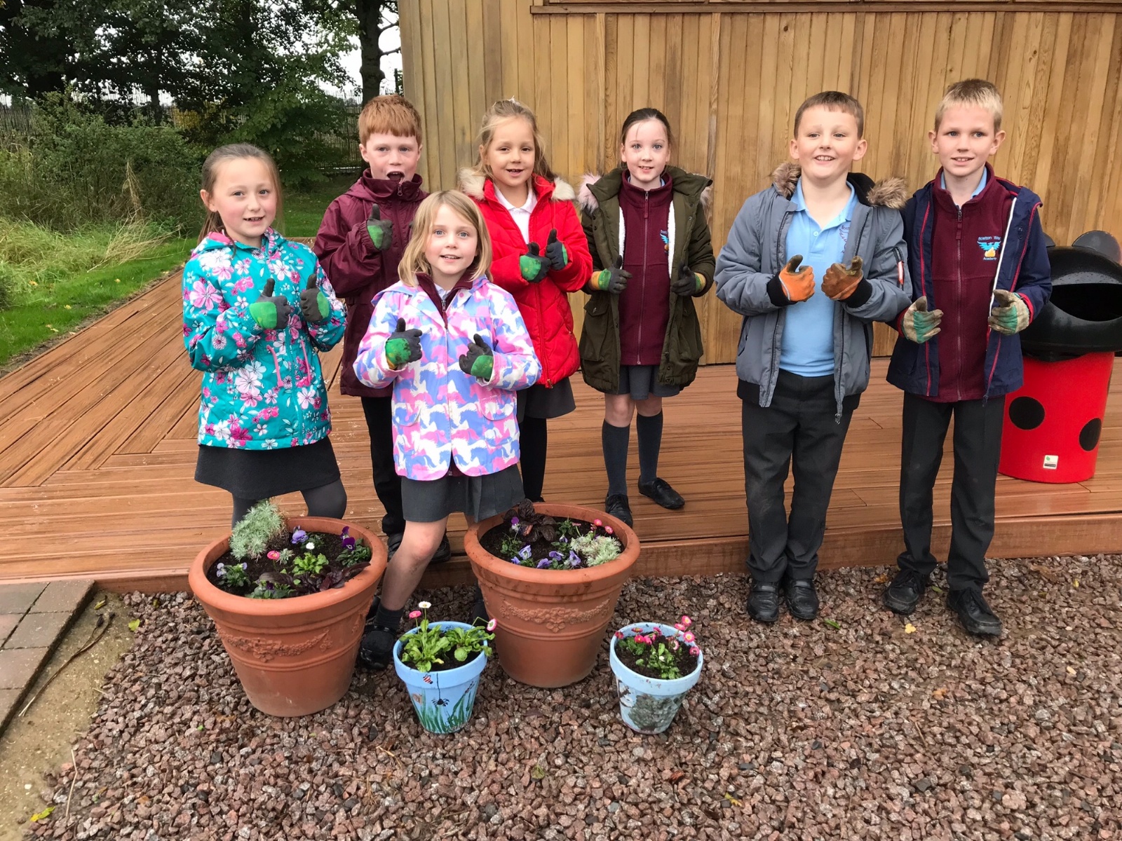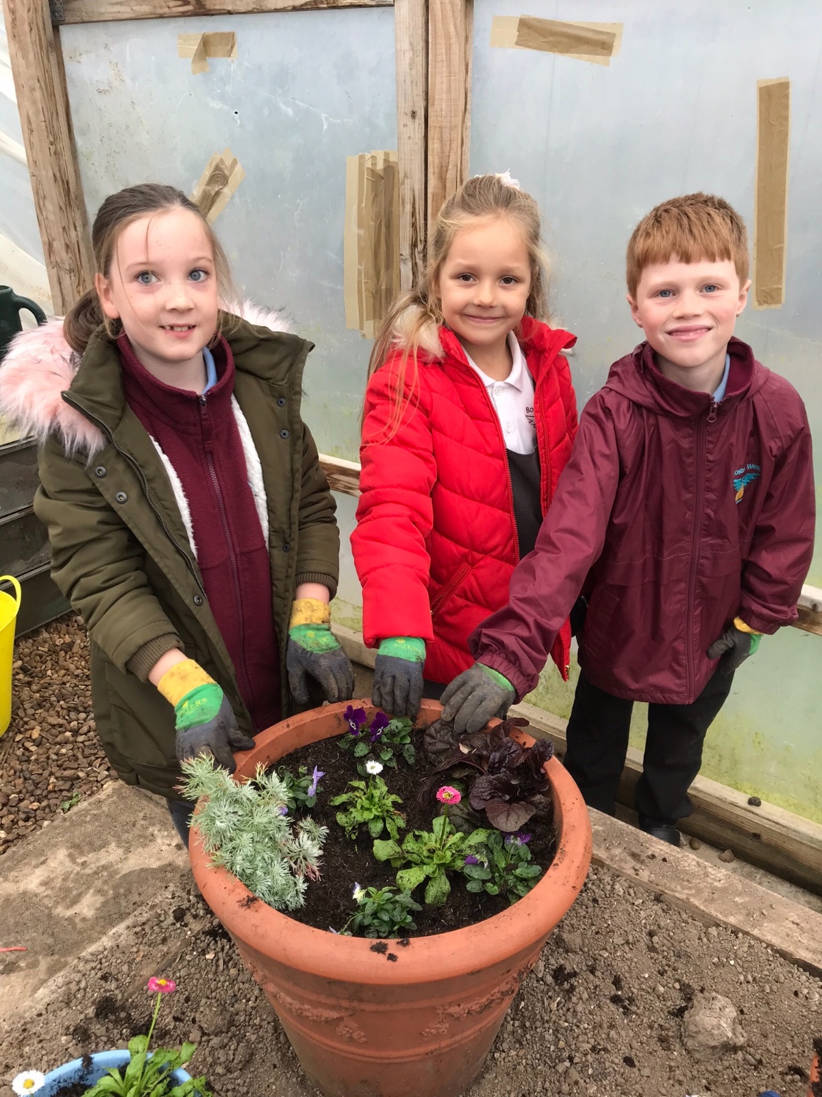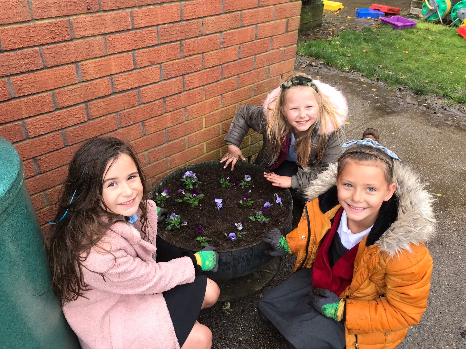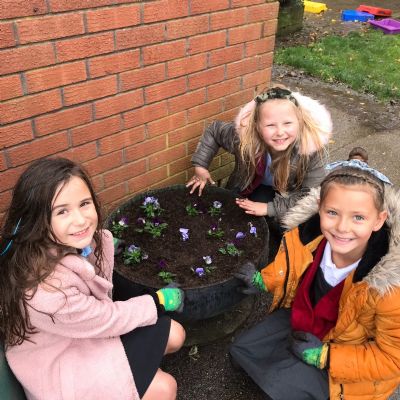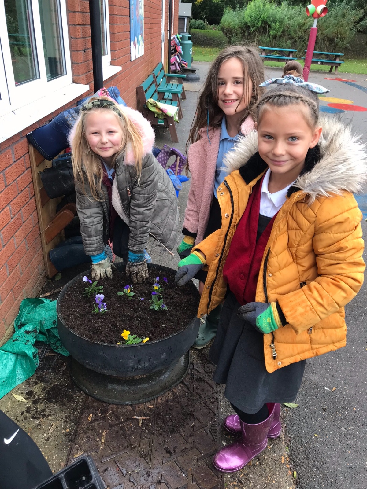 The year 3 and year 4 gardeners refilled our tyre gardens with fresh compost and planted them up with colourful violas and spring bulbs.  They also planted up some pots for in front of the Hive with winter bedding and bulbs.