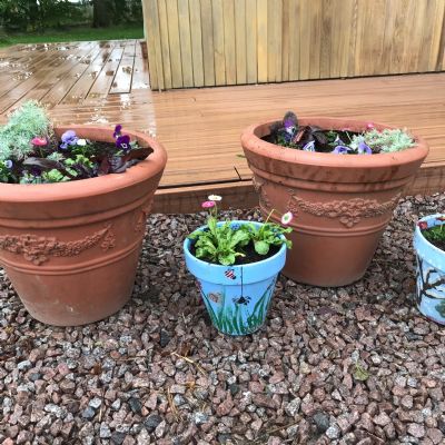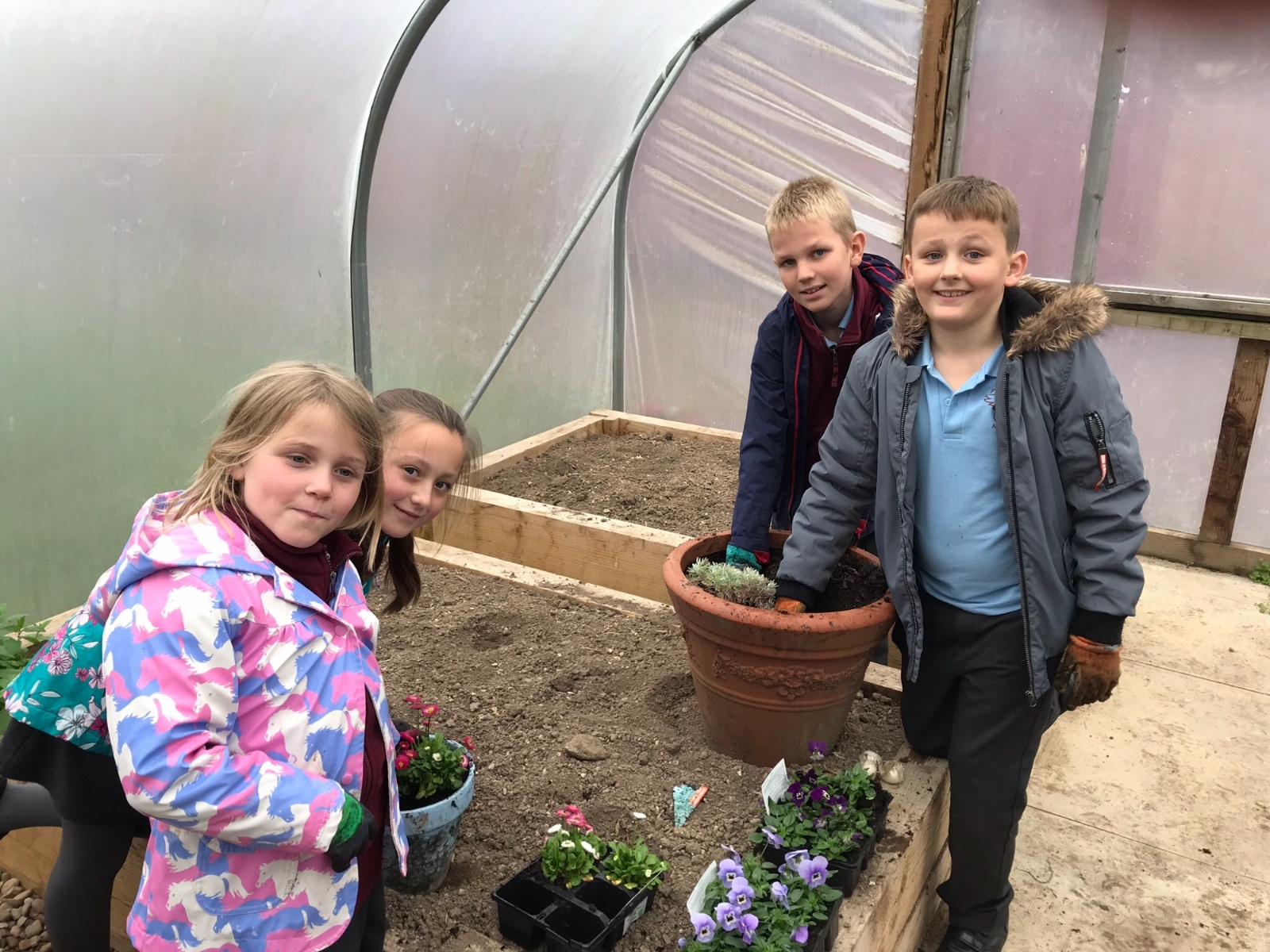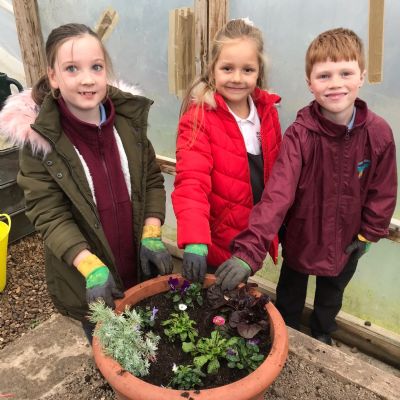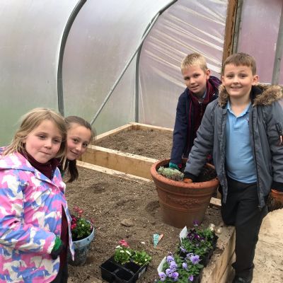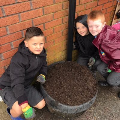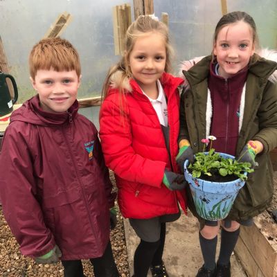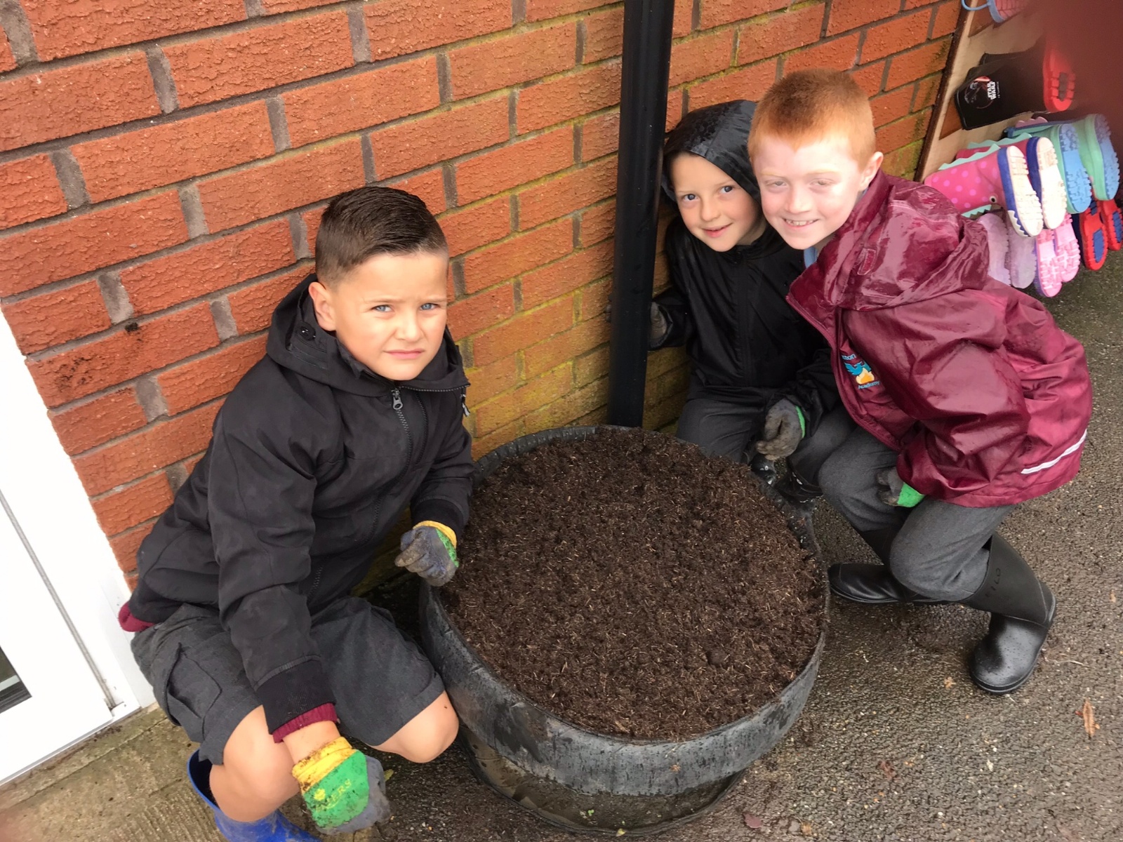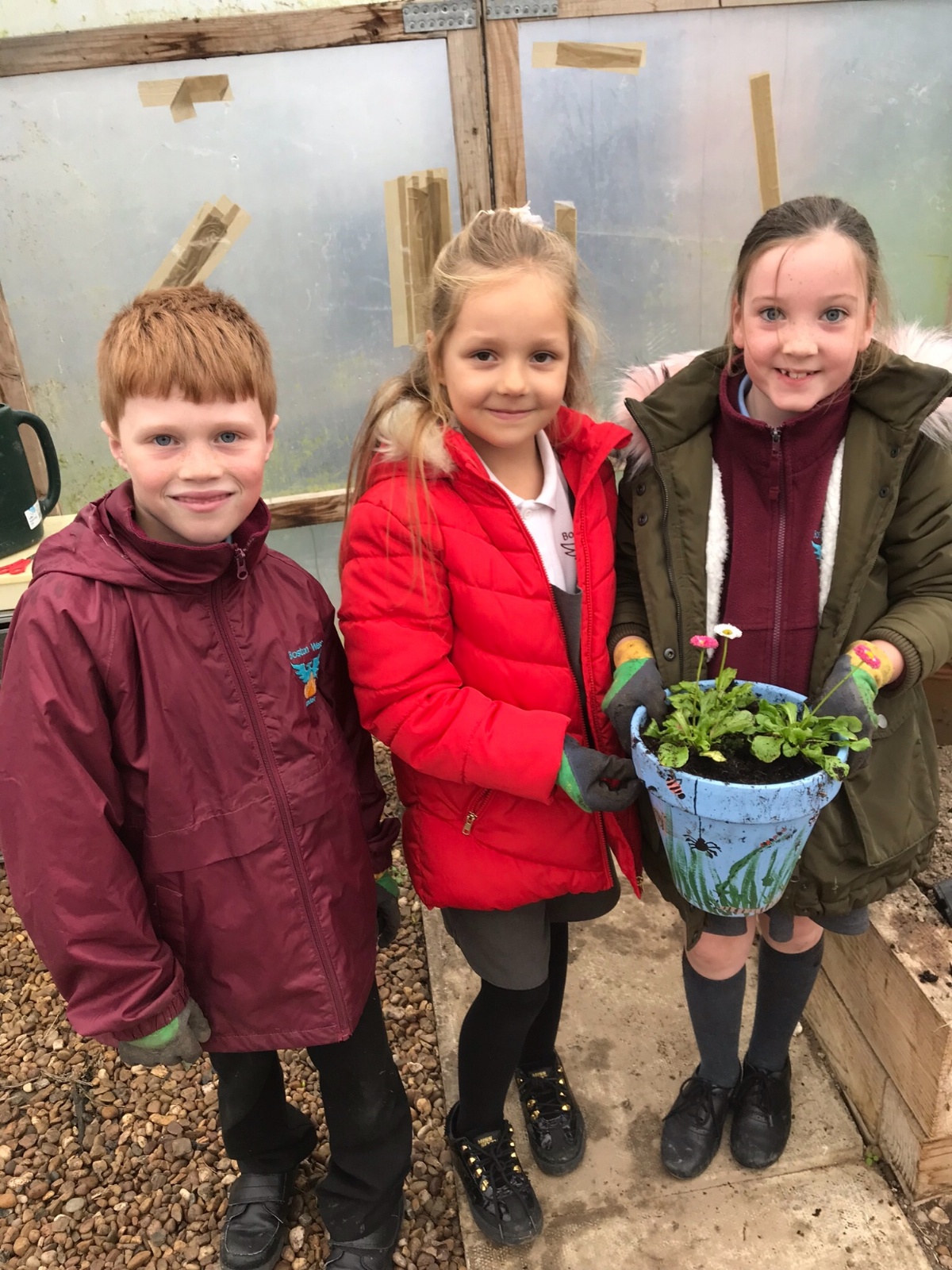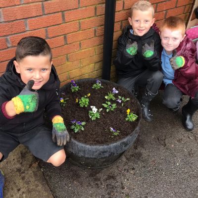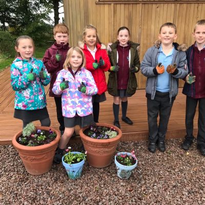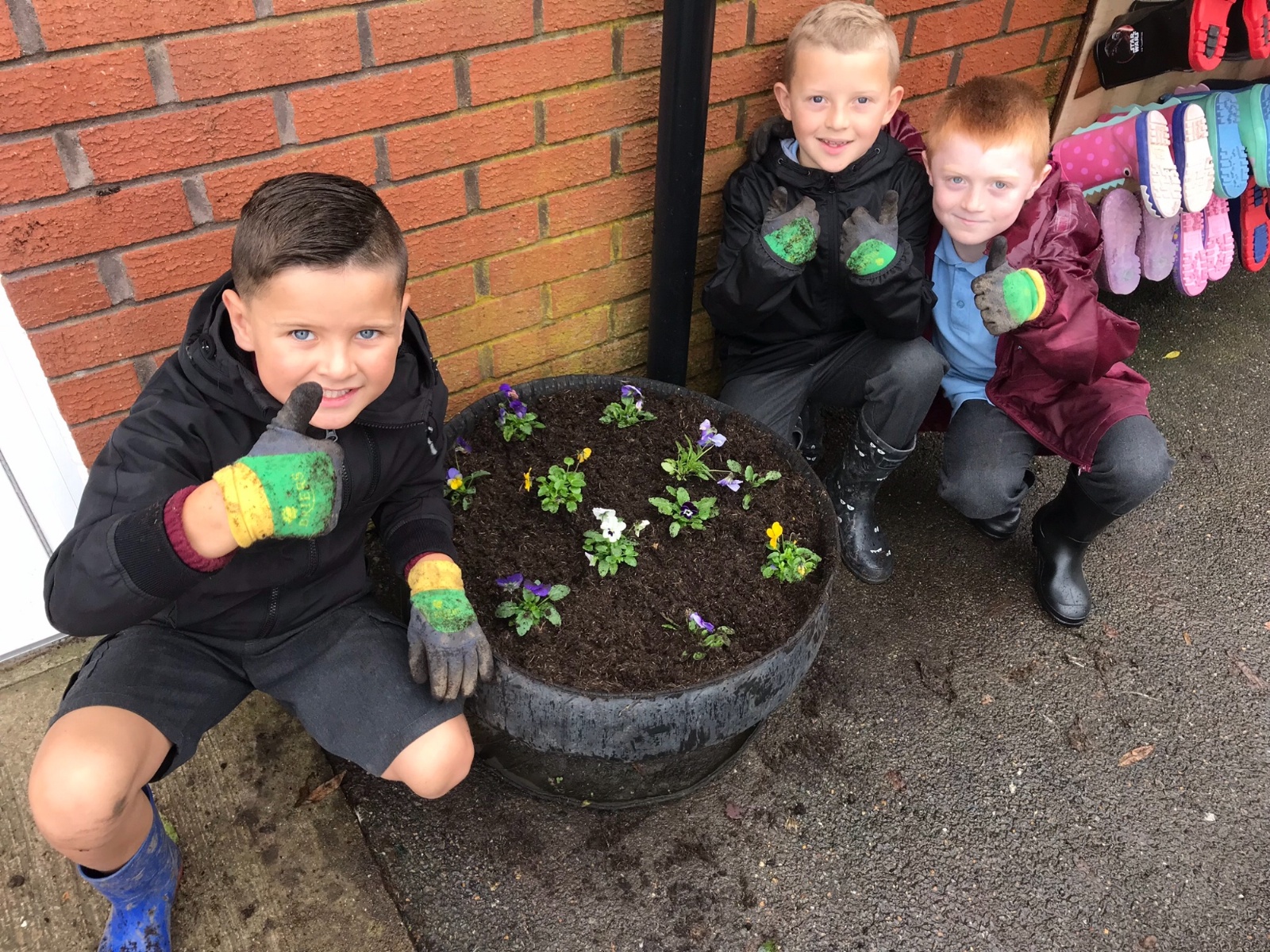 The year 3 and year 4 gardeners refilled our tyre gardens with fresh compost and planted them up with colourful violas and spring bulbs.  They also planted up some pots for in front of the Hive with winter bedding and bulbs.