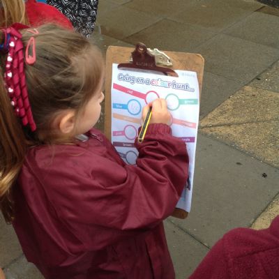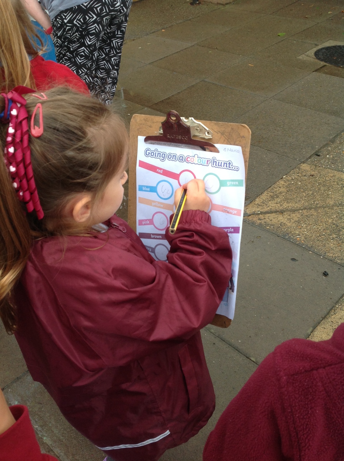 The children had lots of fun exploring all the different colours around the school. They worked in pairs to mark off the colours they found on their colour hunt. They managed to find them all!