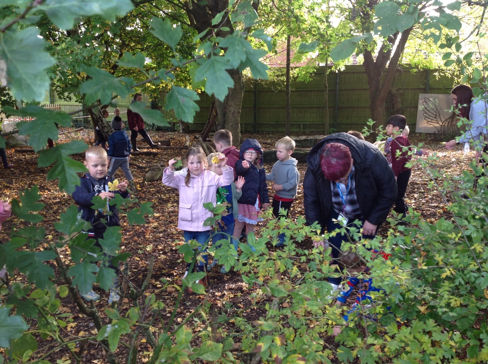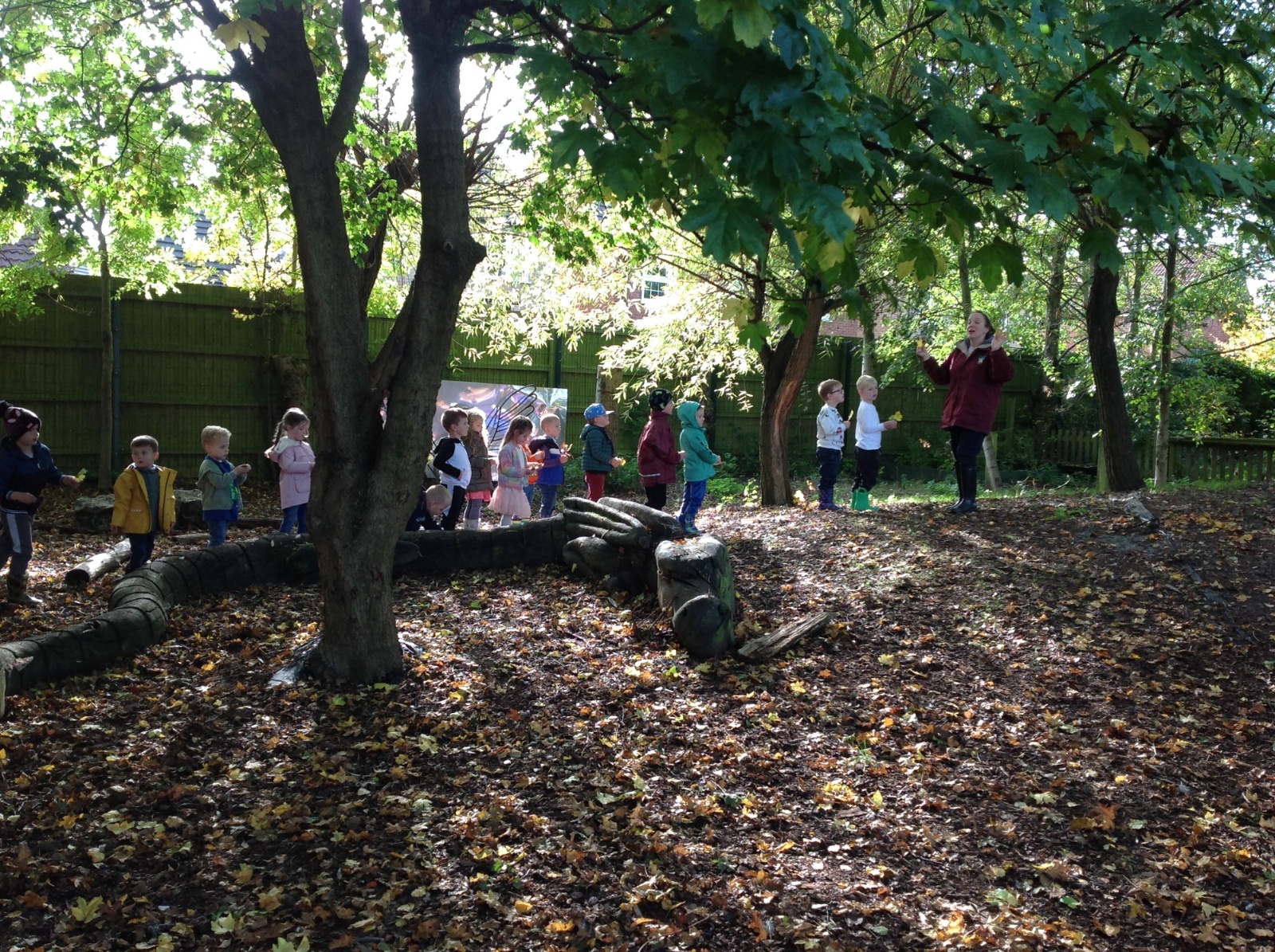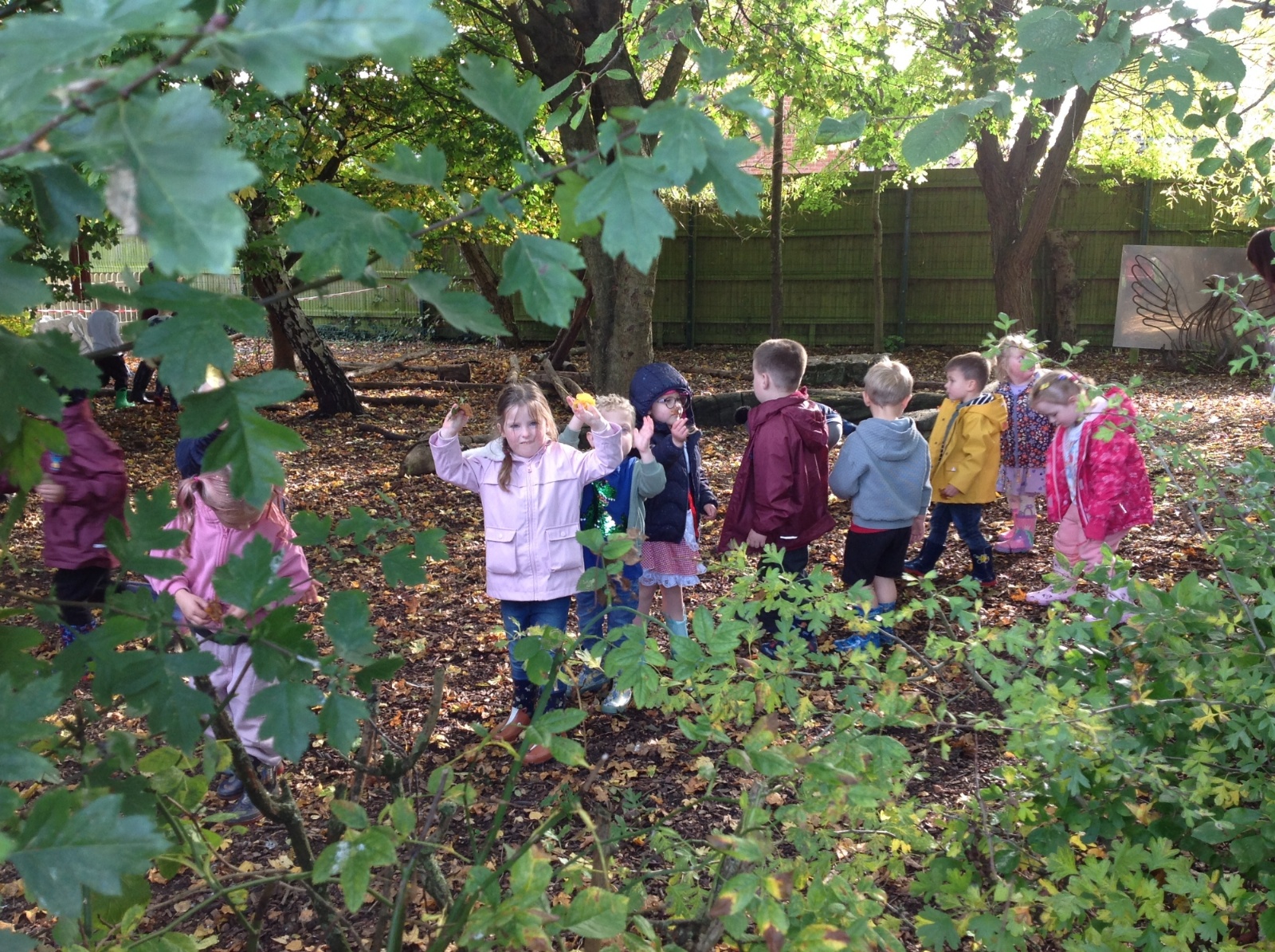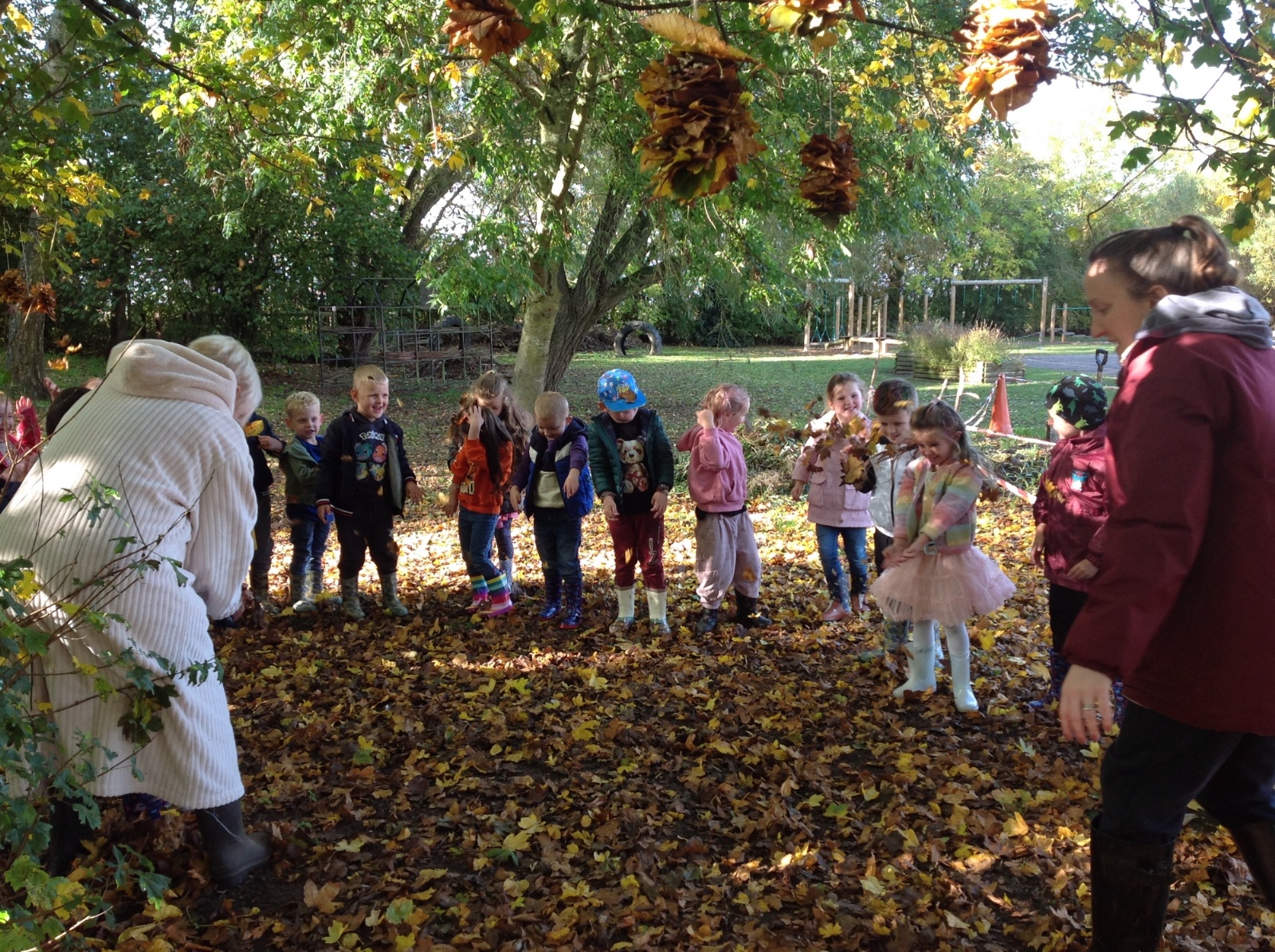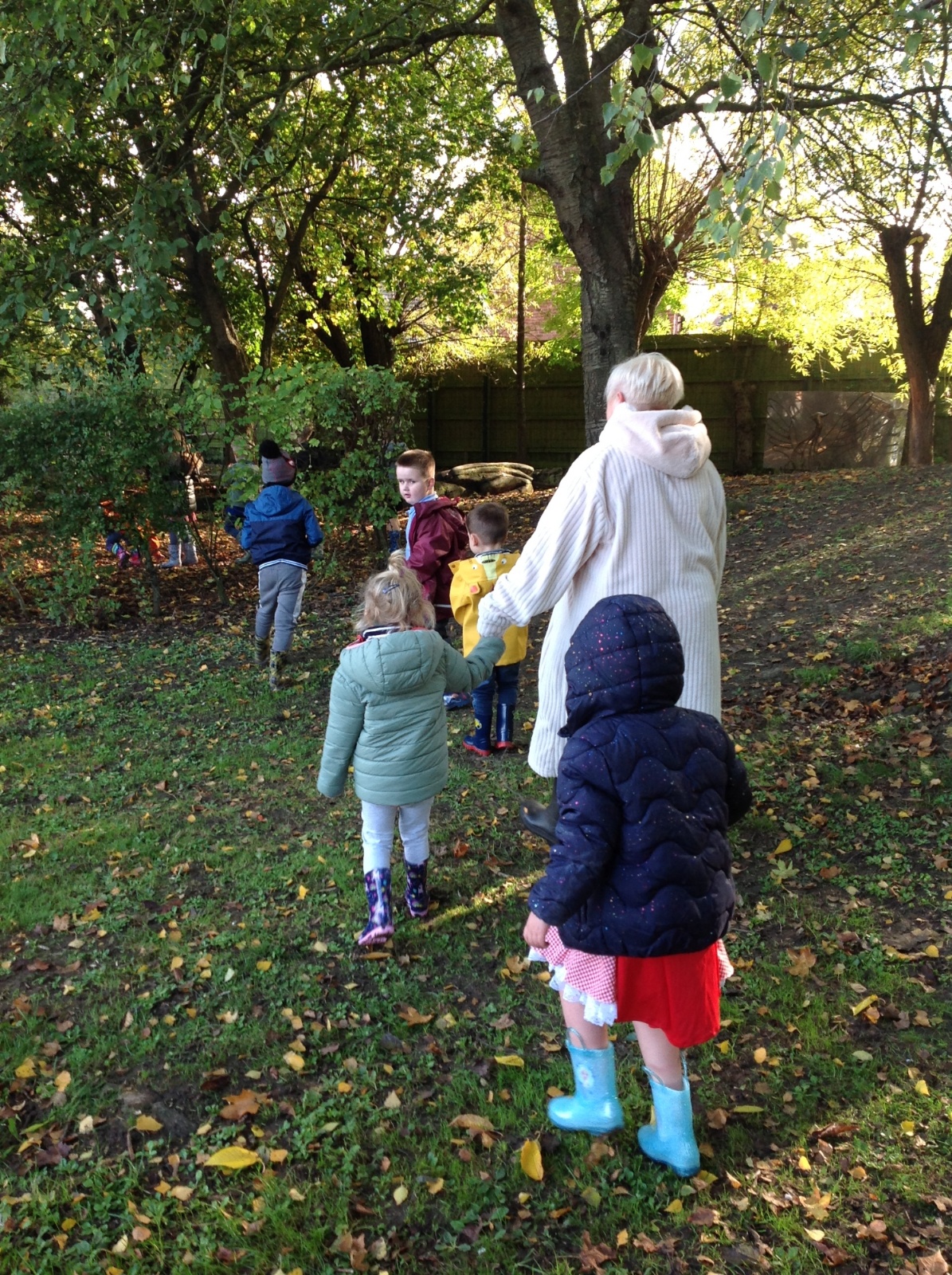The children enjoyed a lovely walk around the school grounds looking for signs of Autumn, such as leaves on the ground and changing colour. We collected different coloured leaves and had fun throwing them up in the air.