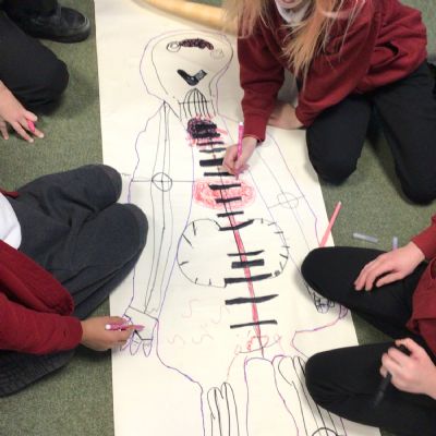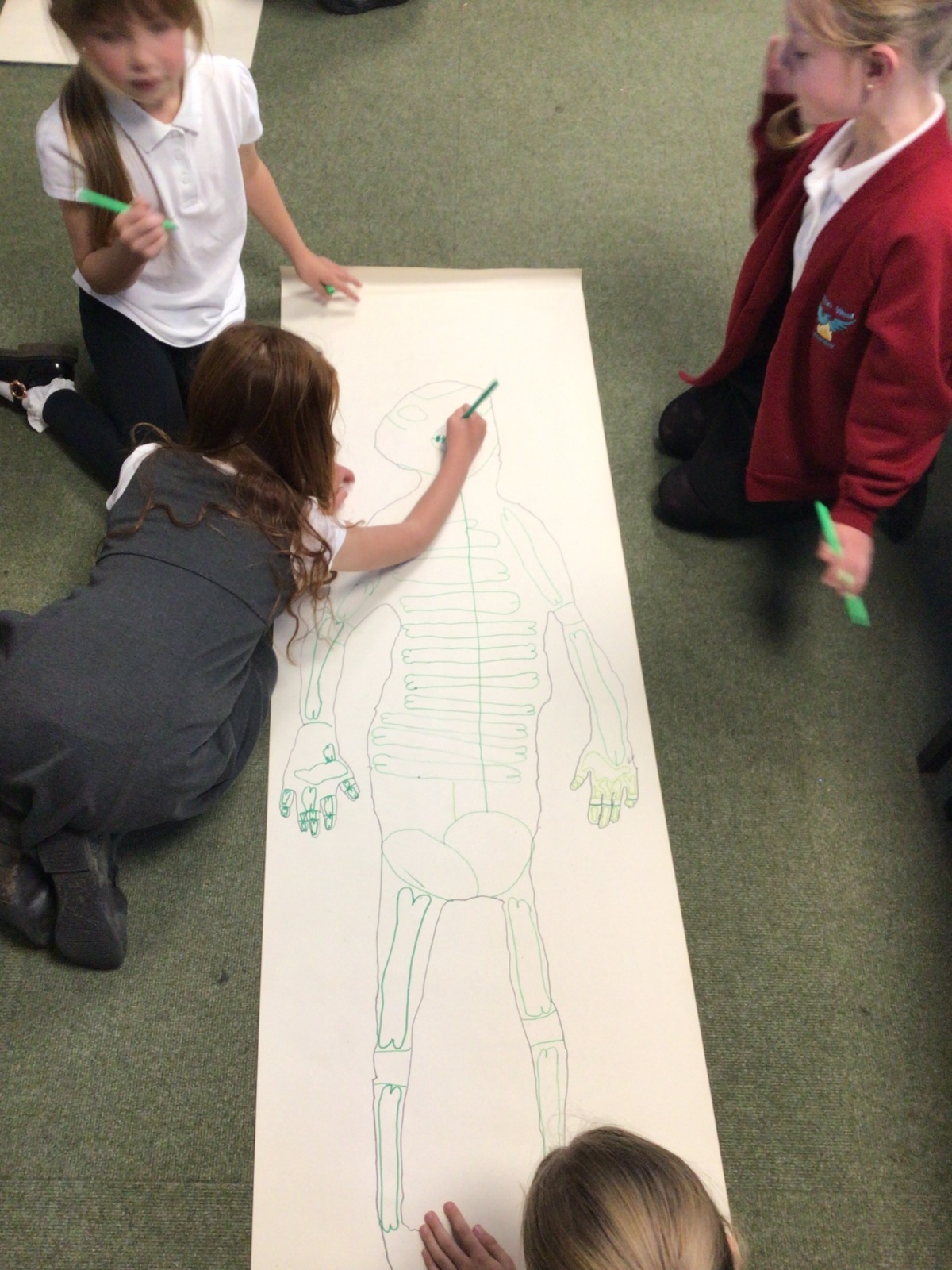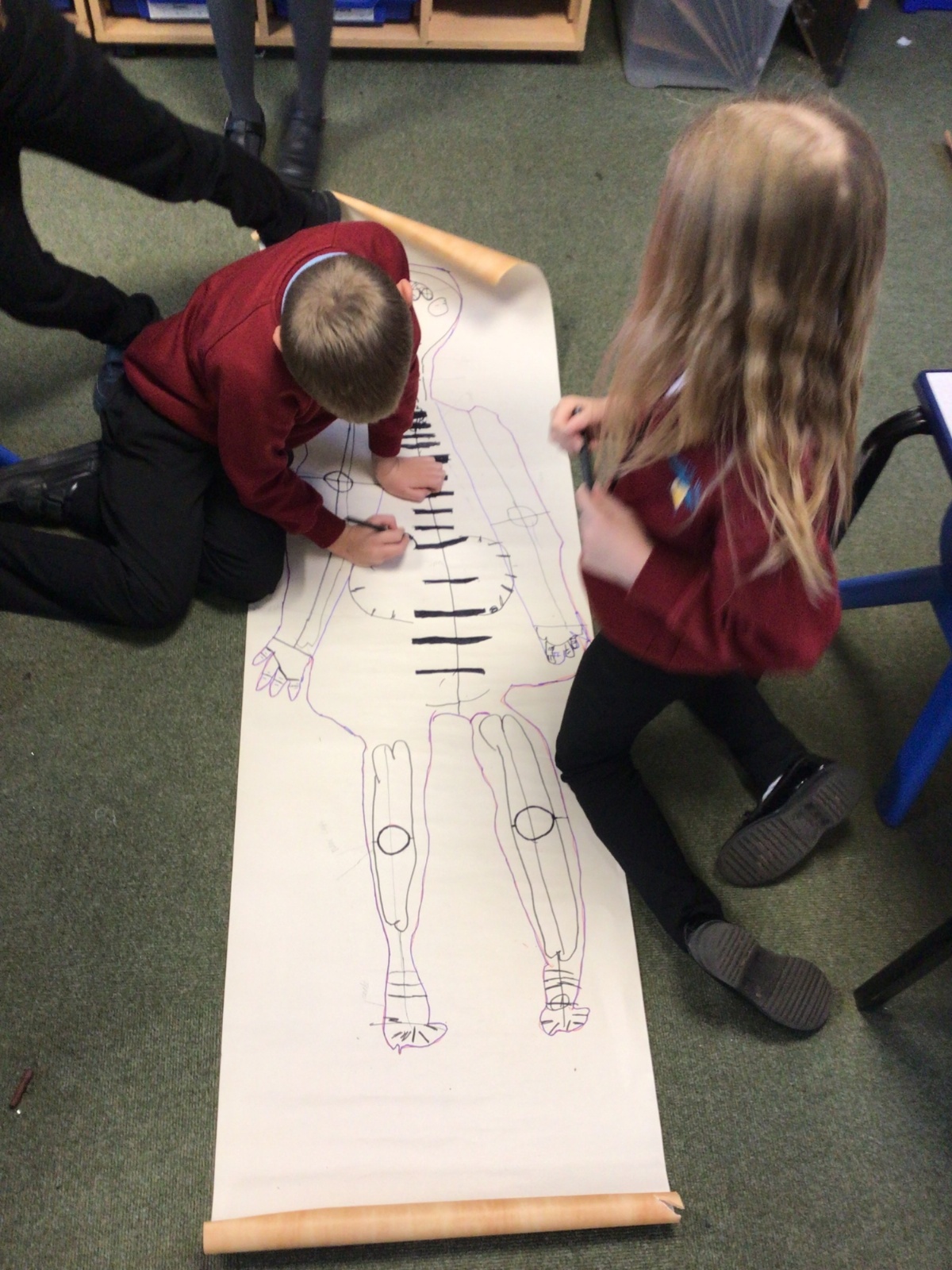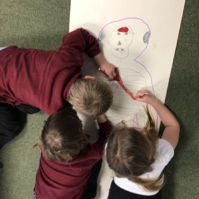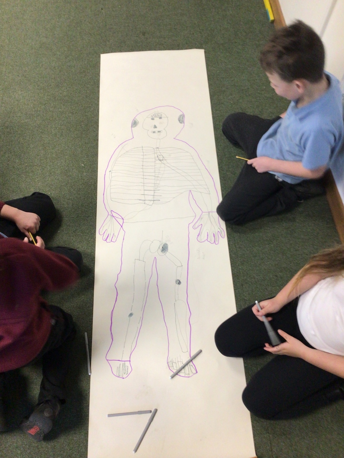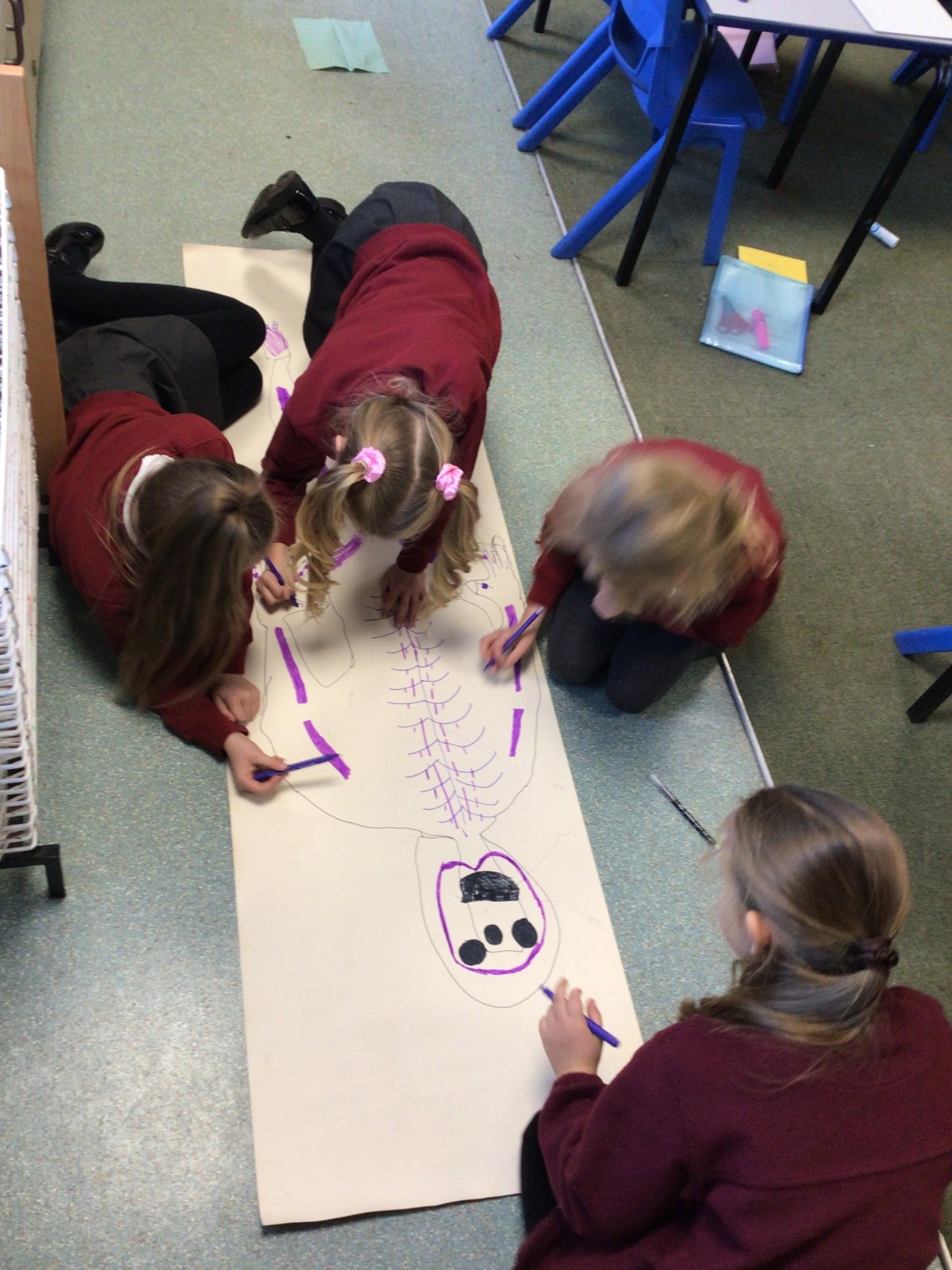 We had fun drawing life-sized human bodies, then locating where we thought some of our bones, joints and soft organs might be. We then looked at pictures of human skeletons to see how accurate we had been.