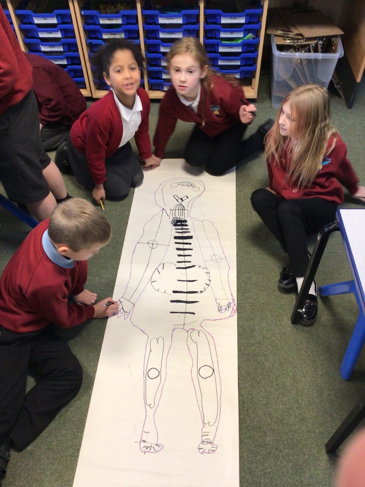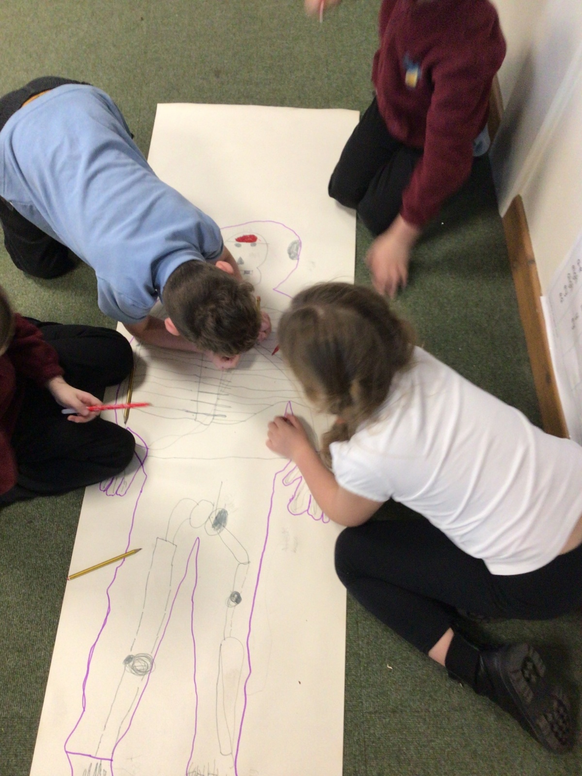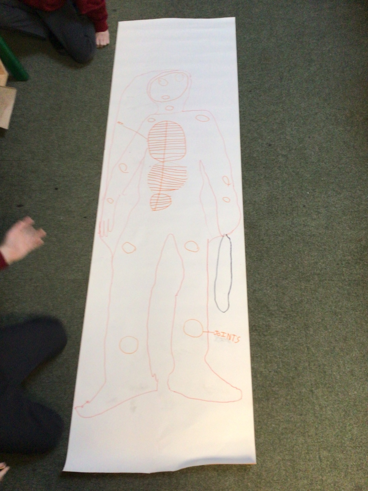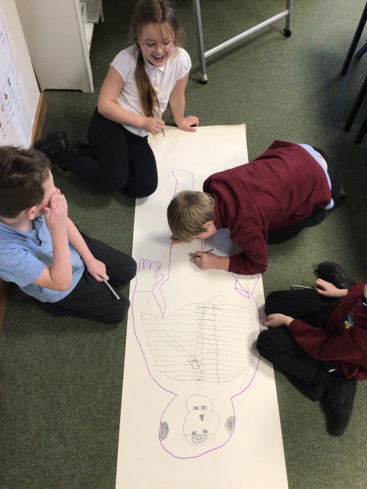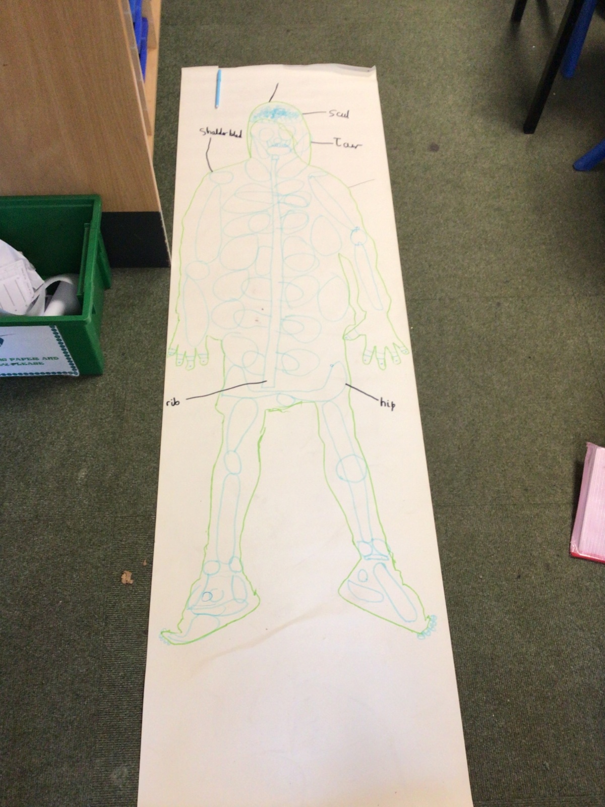 We had fun drawing life-sized human bodies, then locating where we thought some of our bones, joints and soft organs might be. We then looked at pictures of human skeletons to see how accurate we had been.