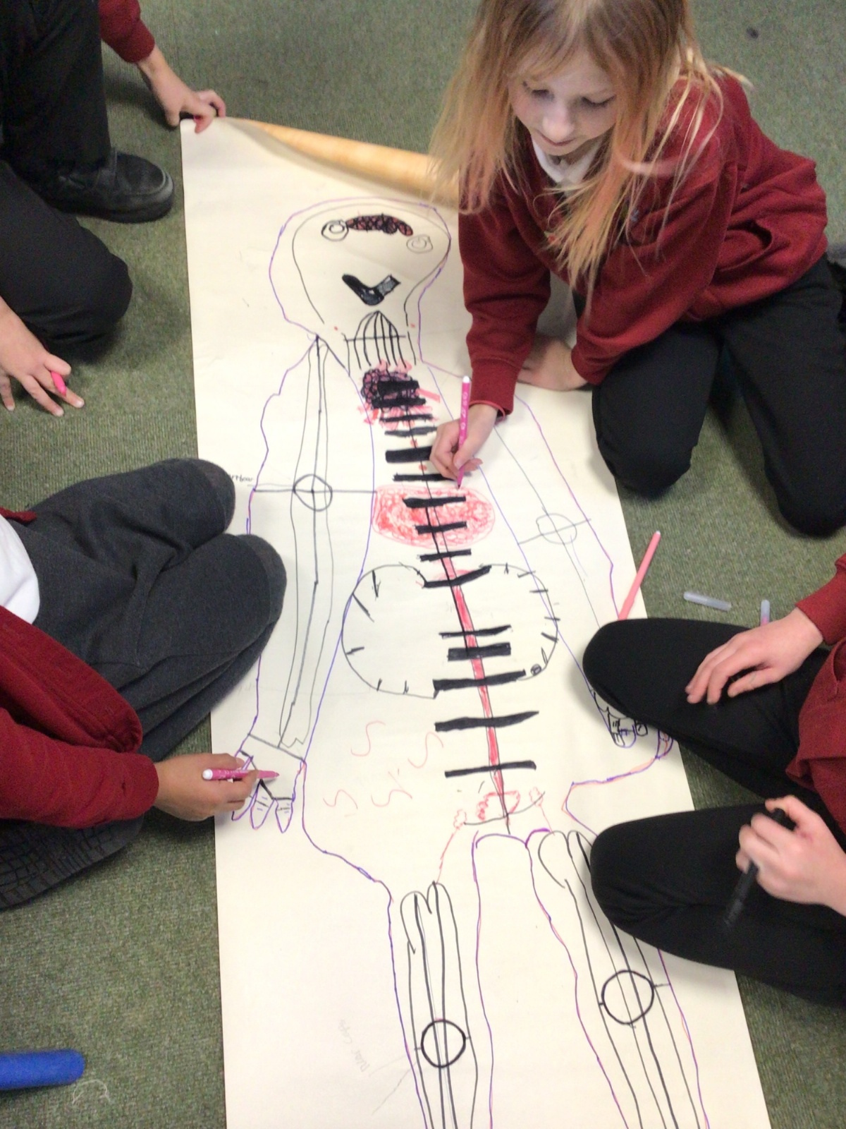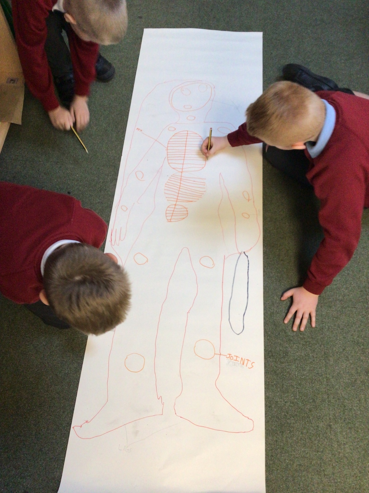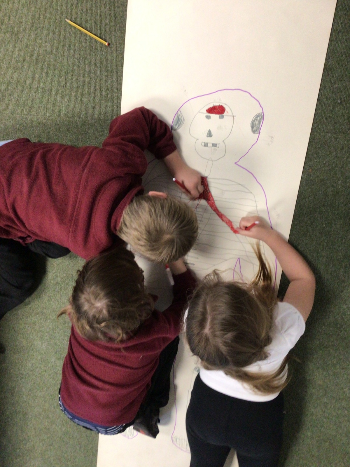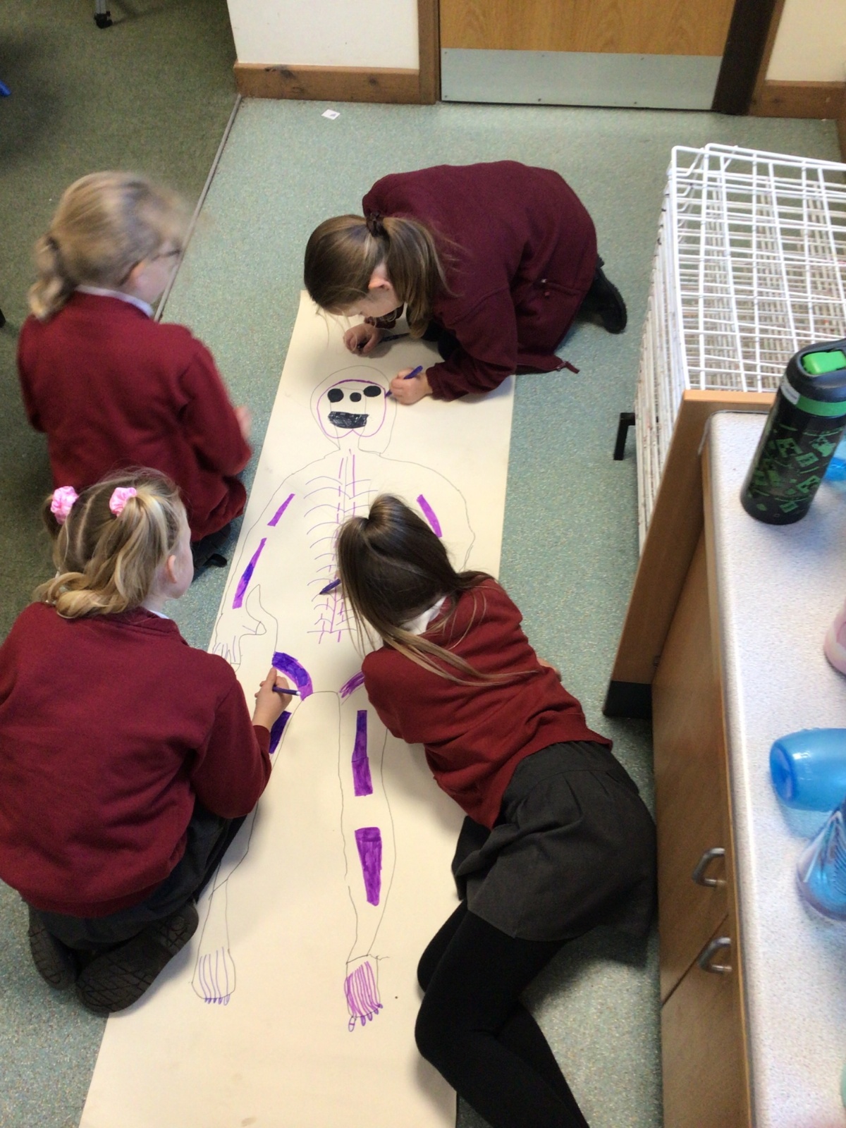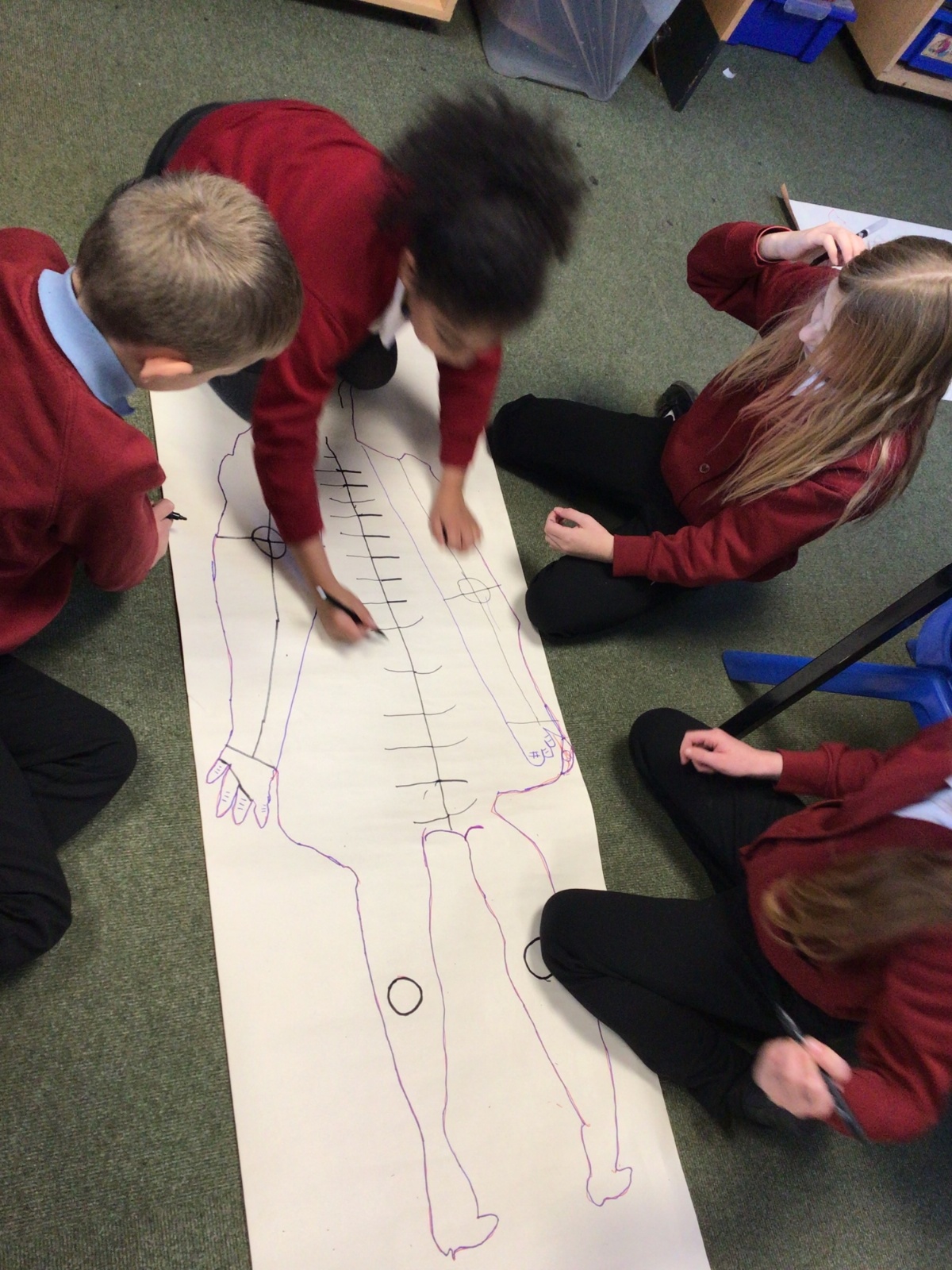 We had fun drawing life-sized human bodies, then locating where we thought some of our bones, joints and soft organs might be. We then looked at pictures of human skeletons to see how accurate we had been.