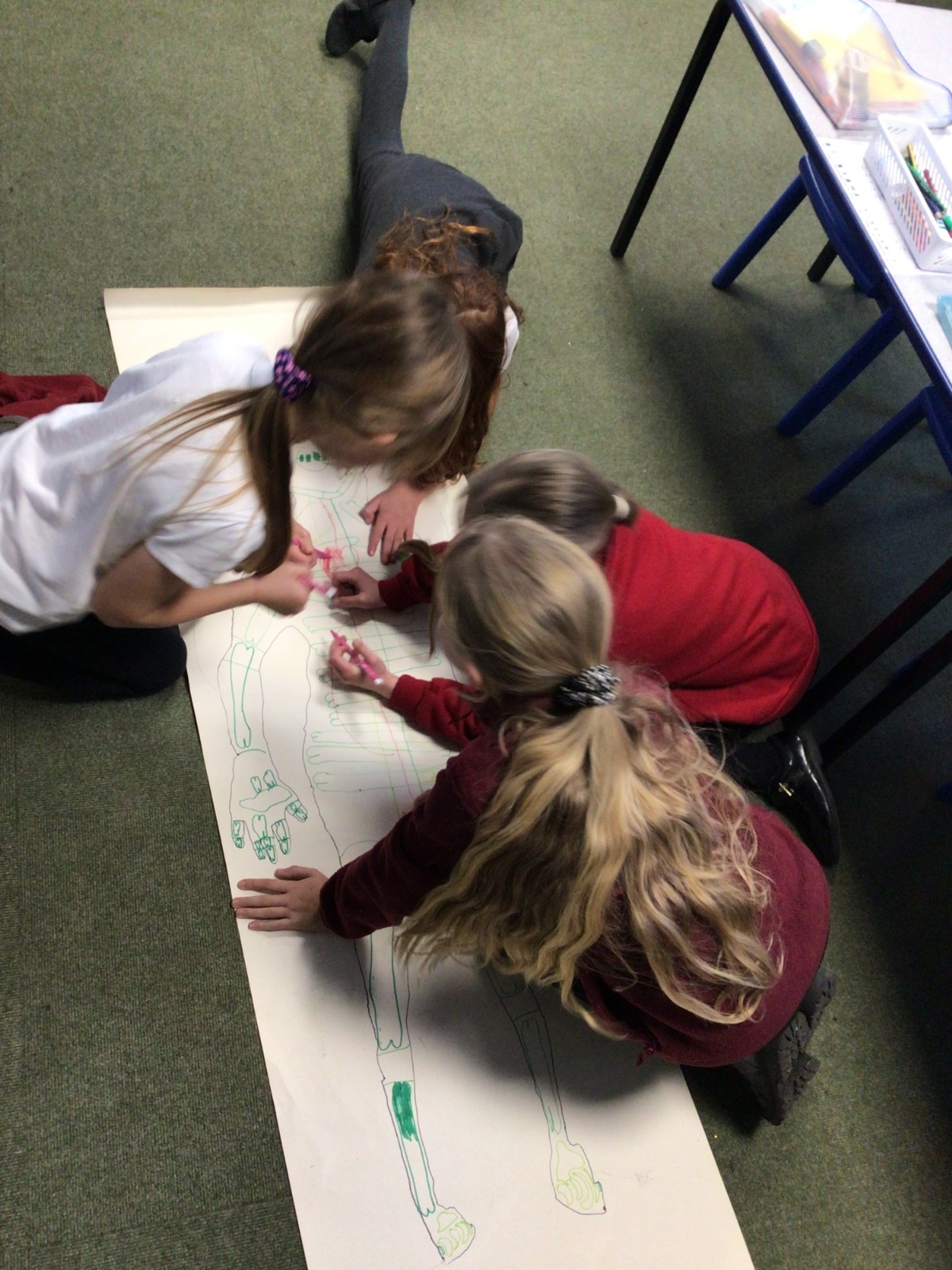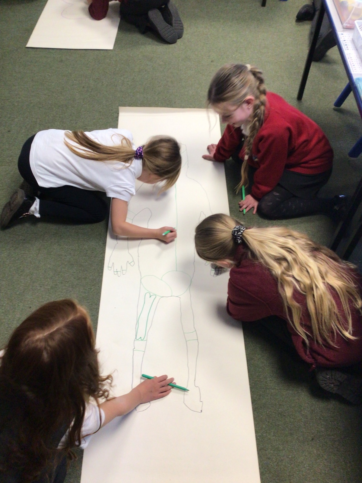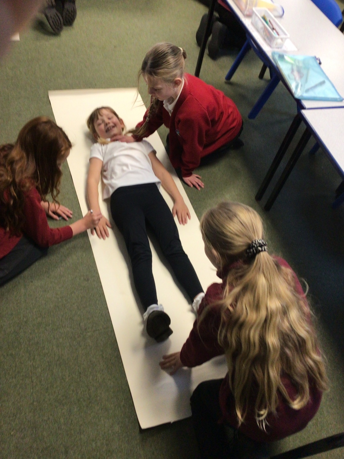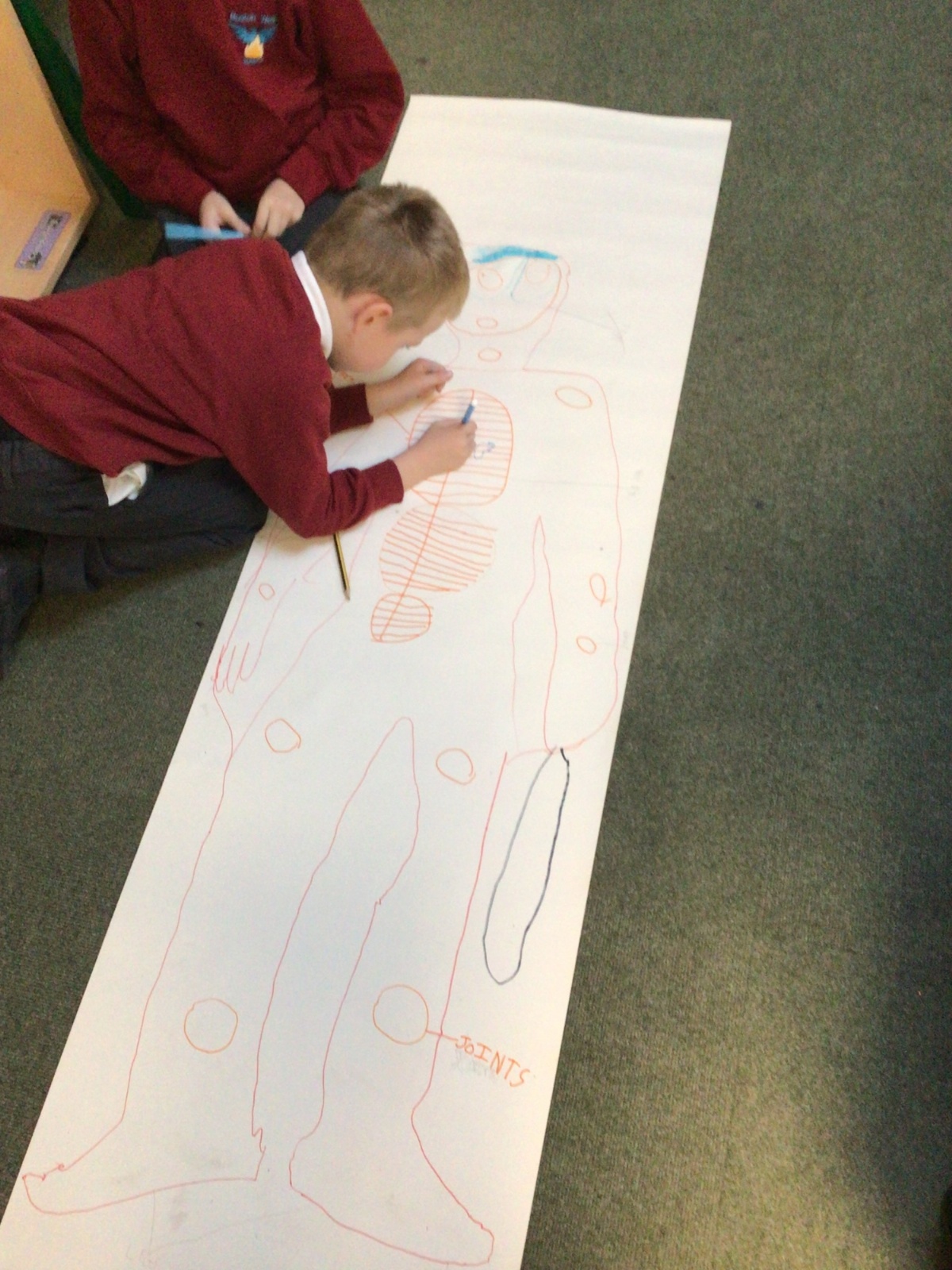 We had fun drawing life-sized human bodies, then locating where we thought some of our bones, joints and soft organs might be. We then looked at pictures of human skeletons to see how accurate we had been.