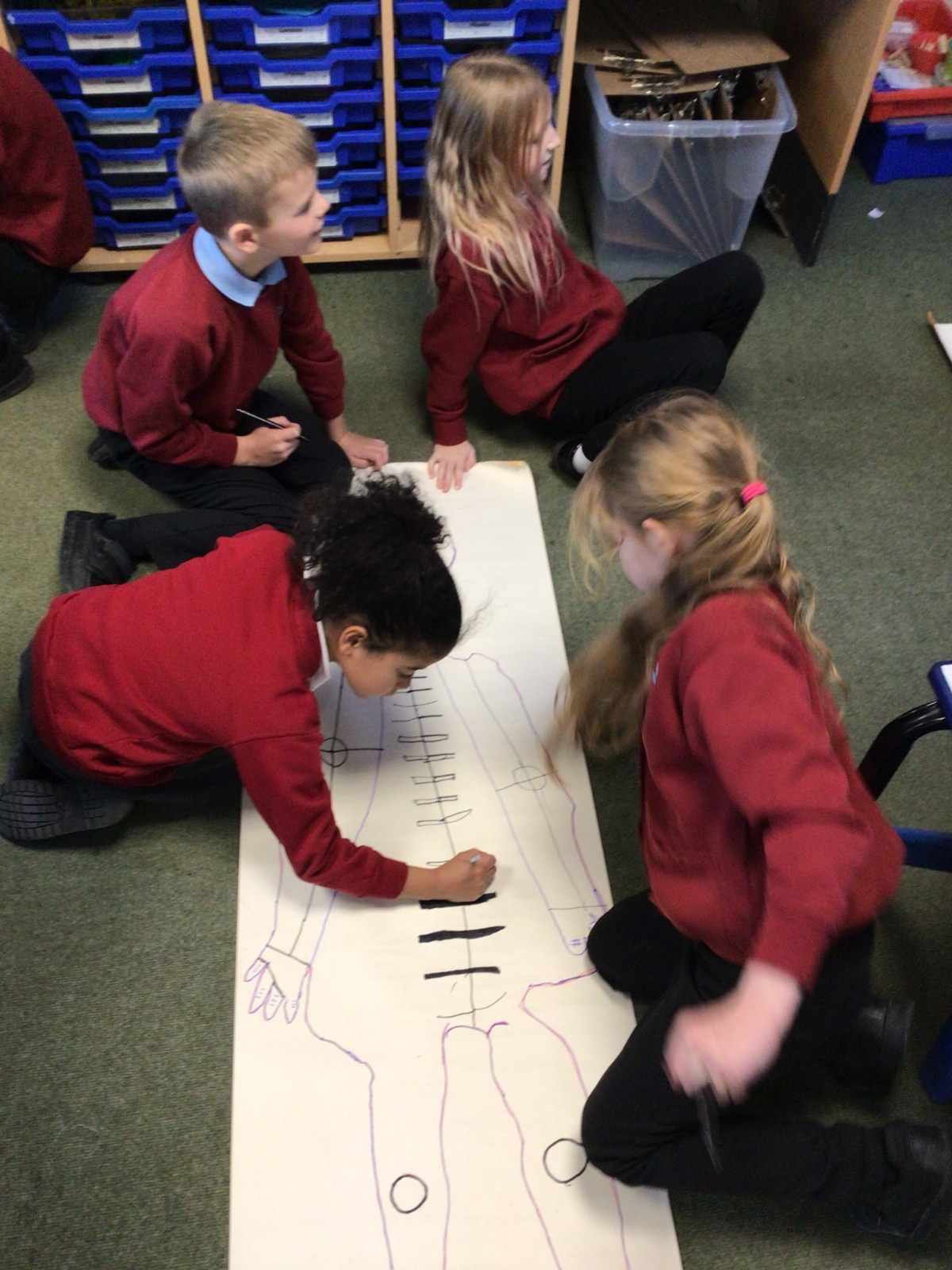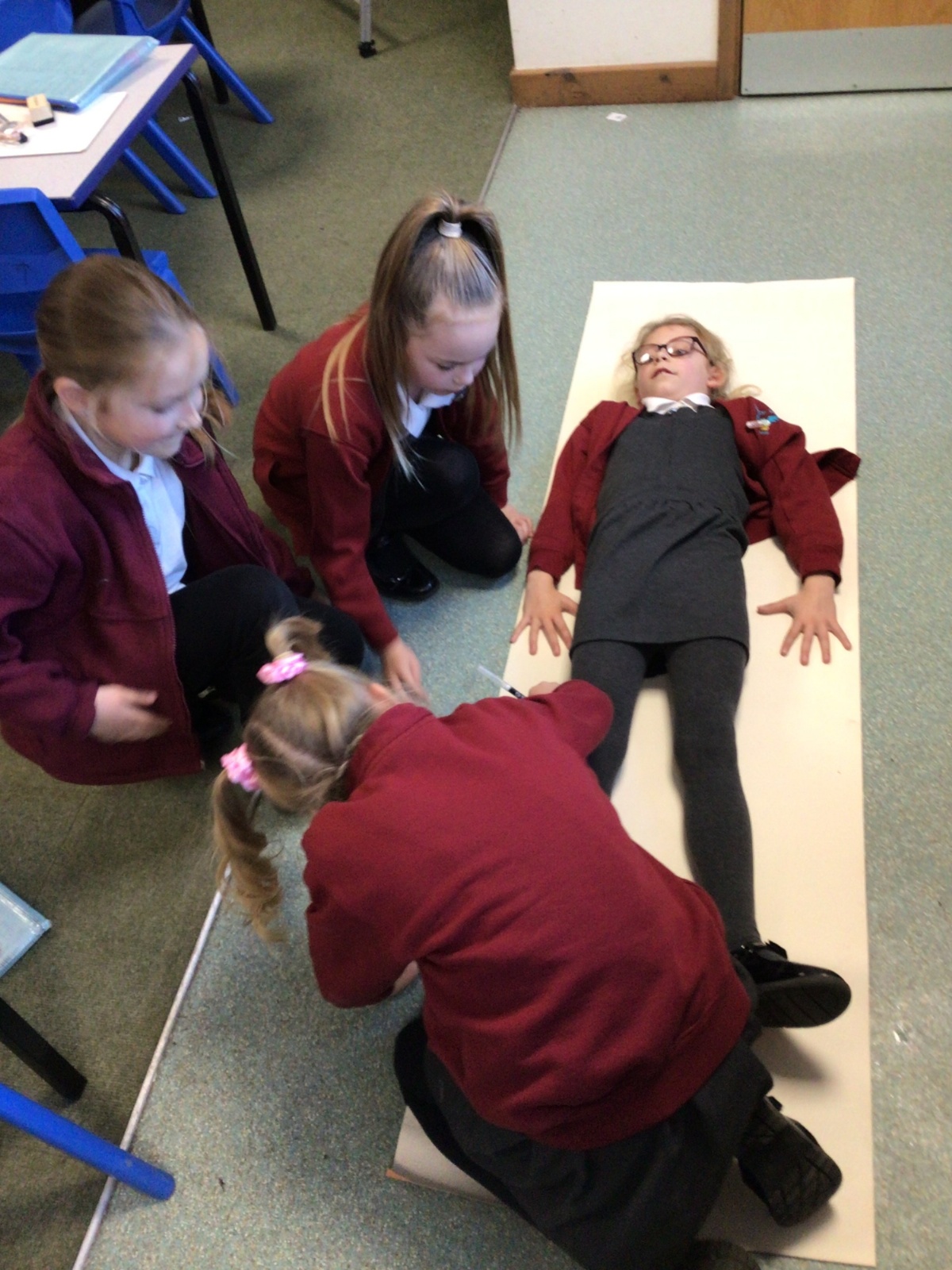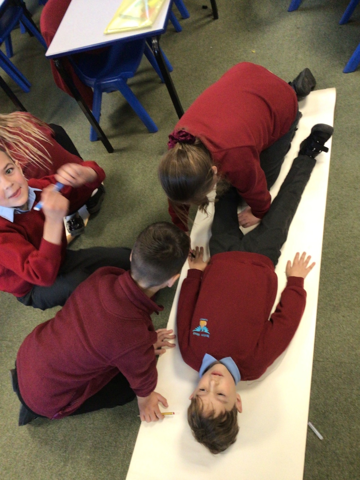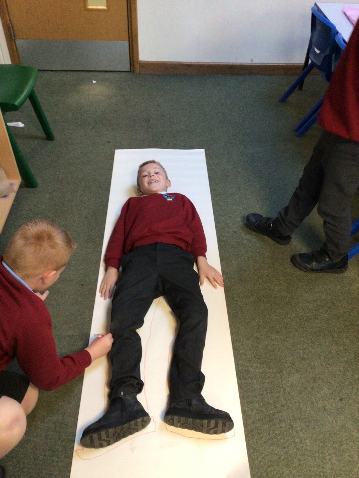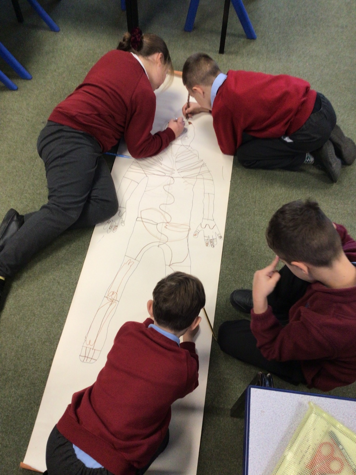 We had fun drawing life-sized human bodies, then locating where we thought some of our bones, joints and soft organs might be. We then looked at pictures of human skeletons to see how accurate we had been.