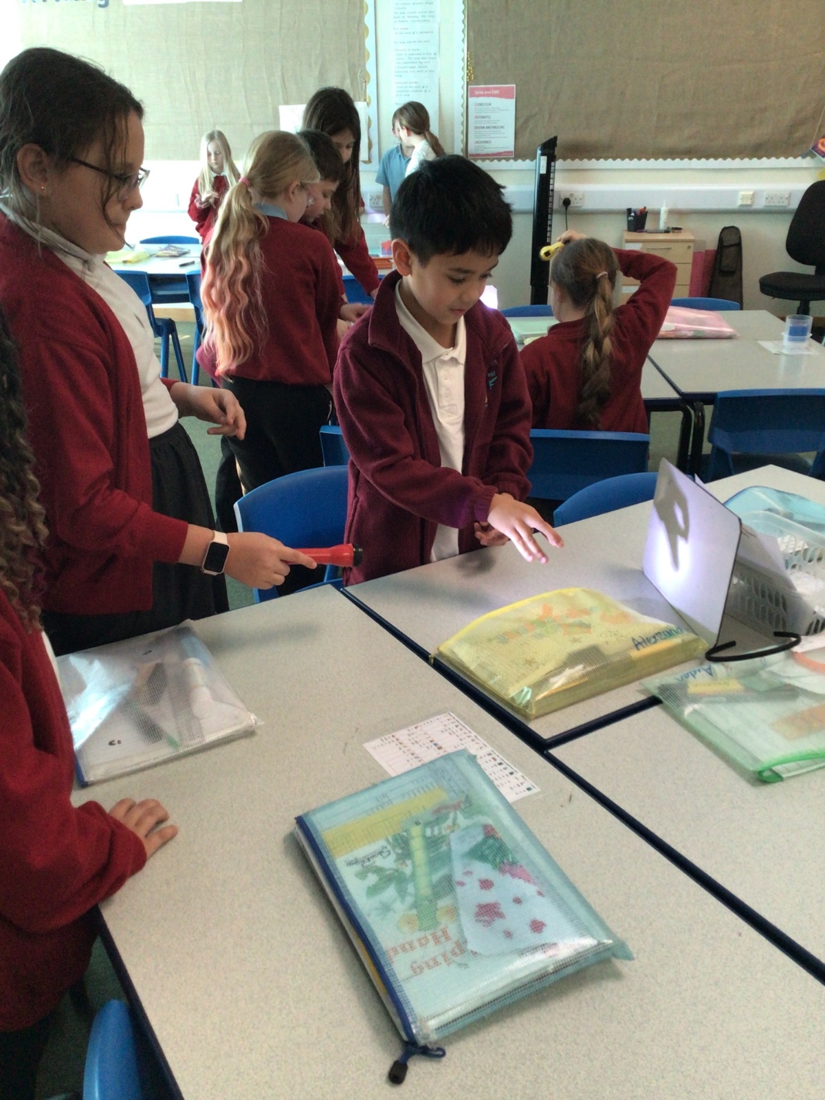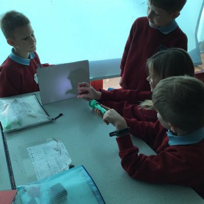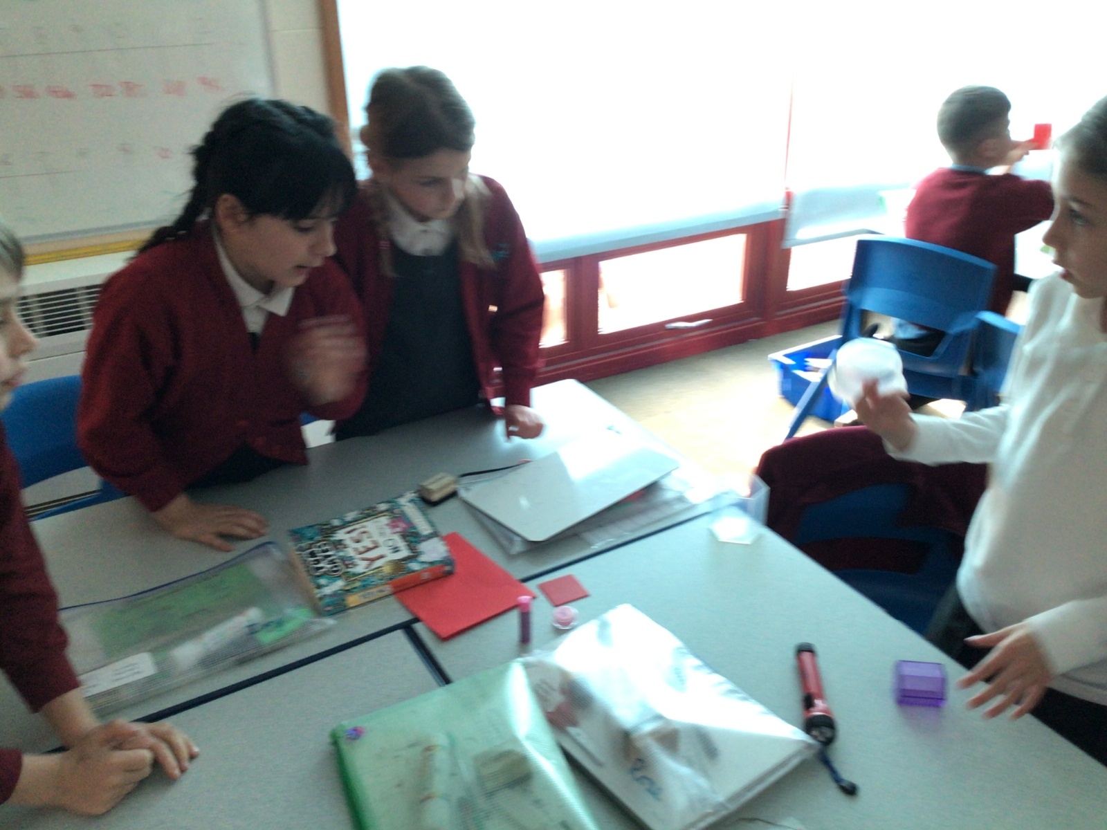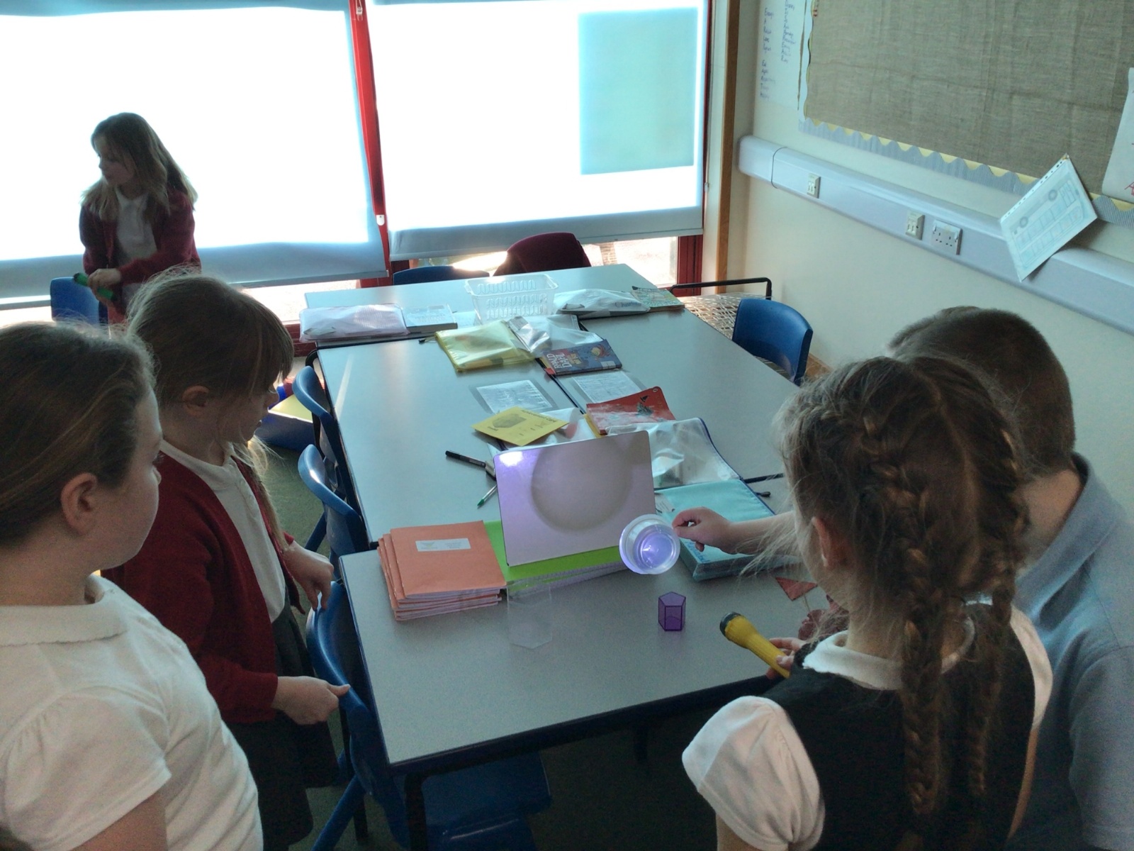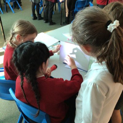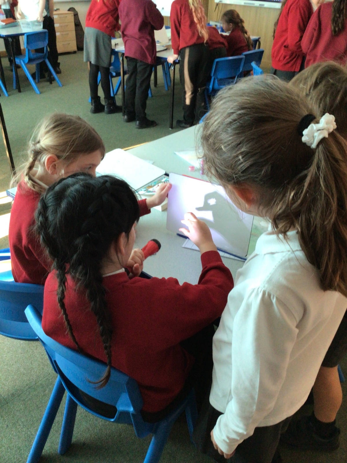 Children then looked at different materials to predict which item would make the darkest shadow. The children used the vocabulary of transparent, translucent and opaque to make their predictions, giving reasoning as to why they thought it would make the darkest shadow. The children then checked their predictions with a comparative test. The children discovered that opaque items make the darkest shadows as they do not allow light to pass through them.