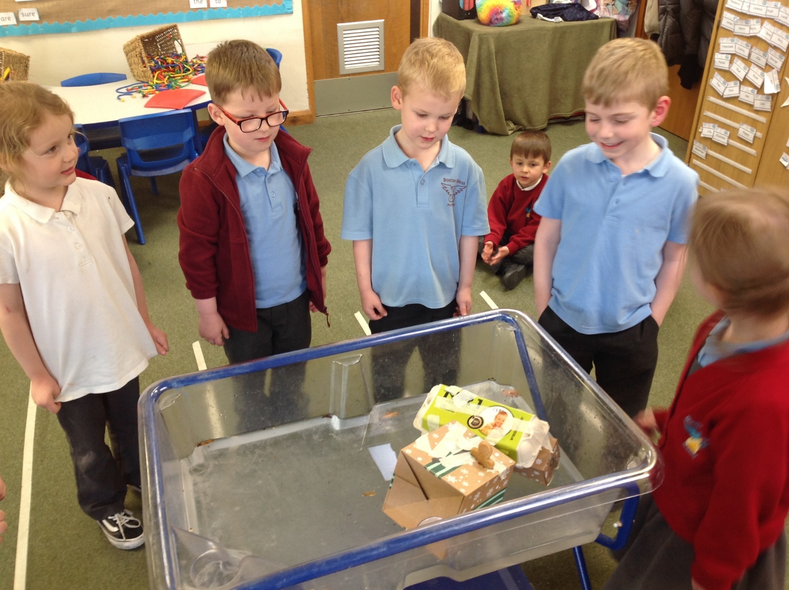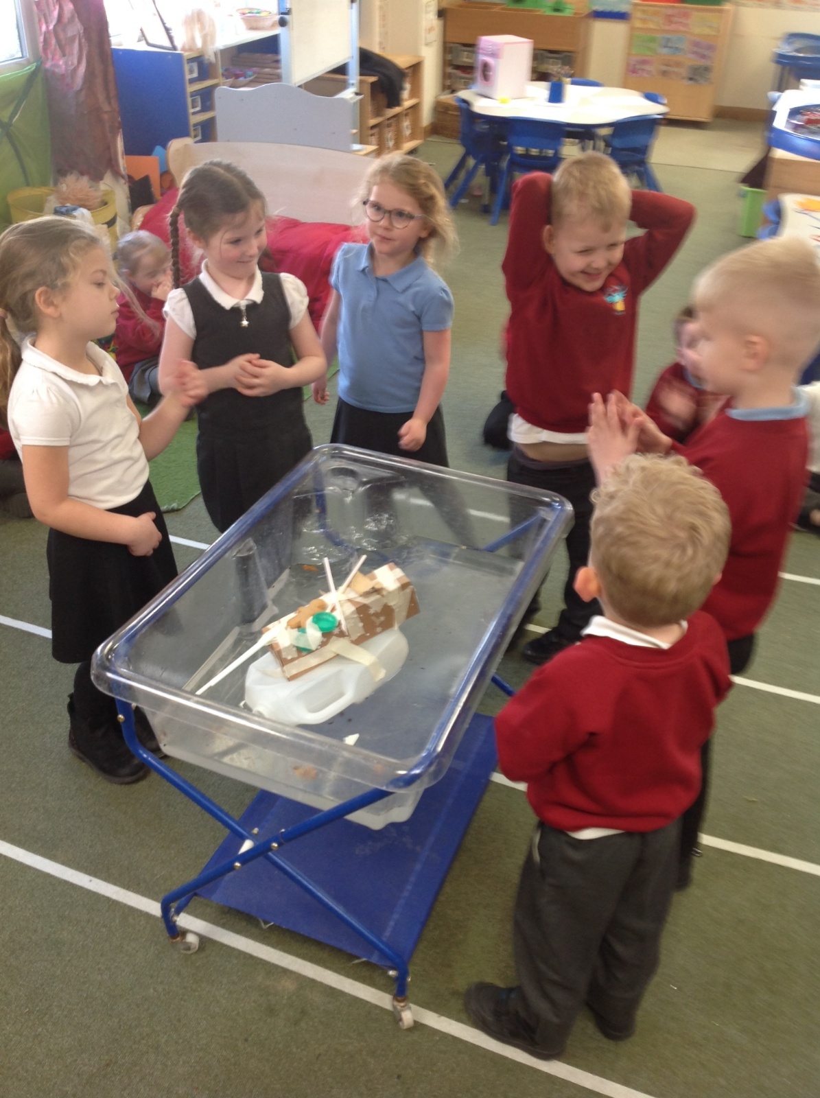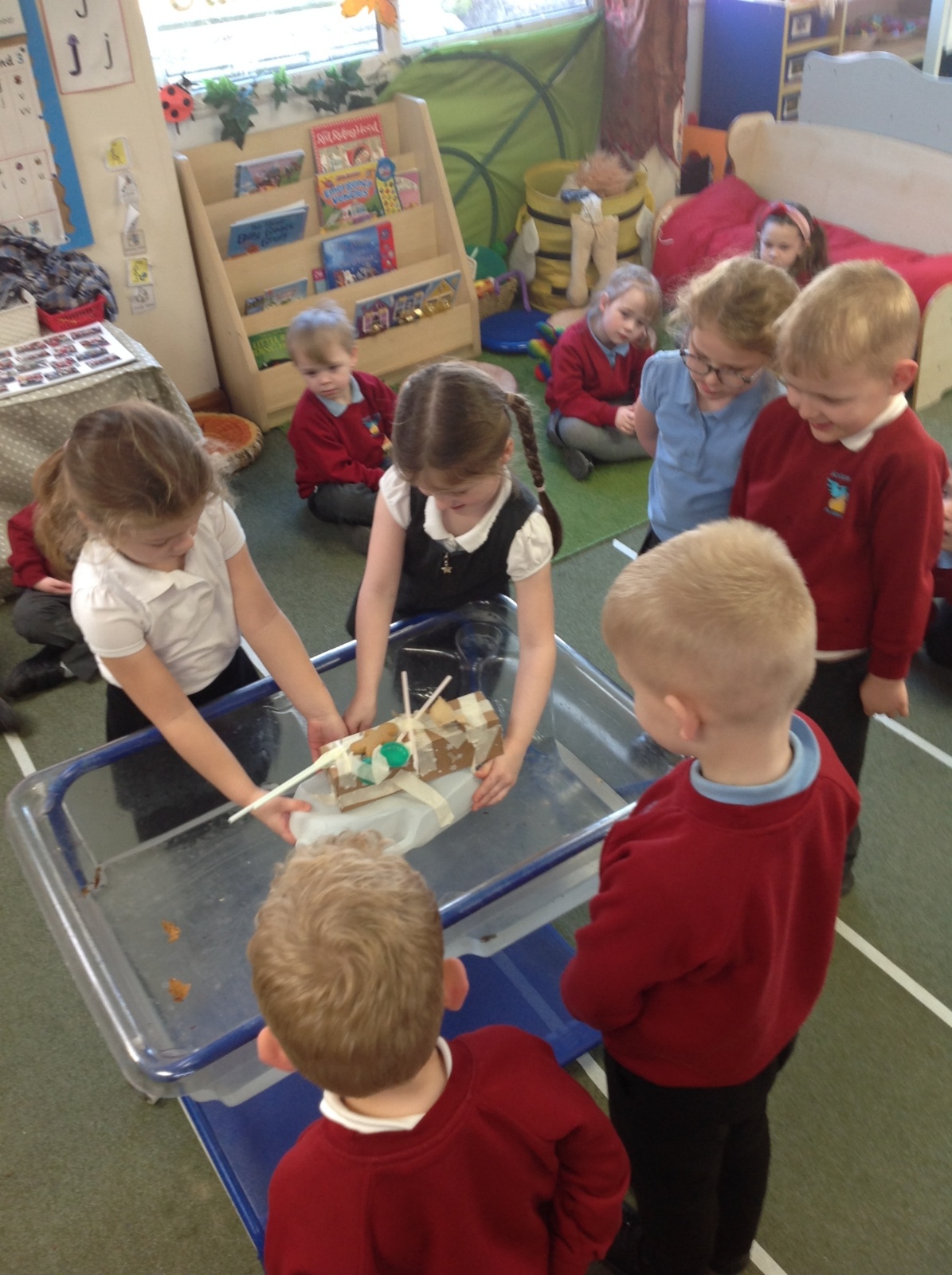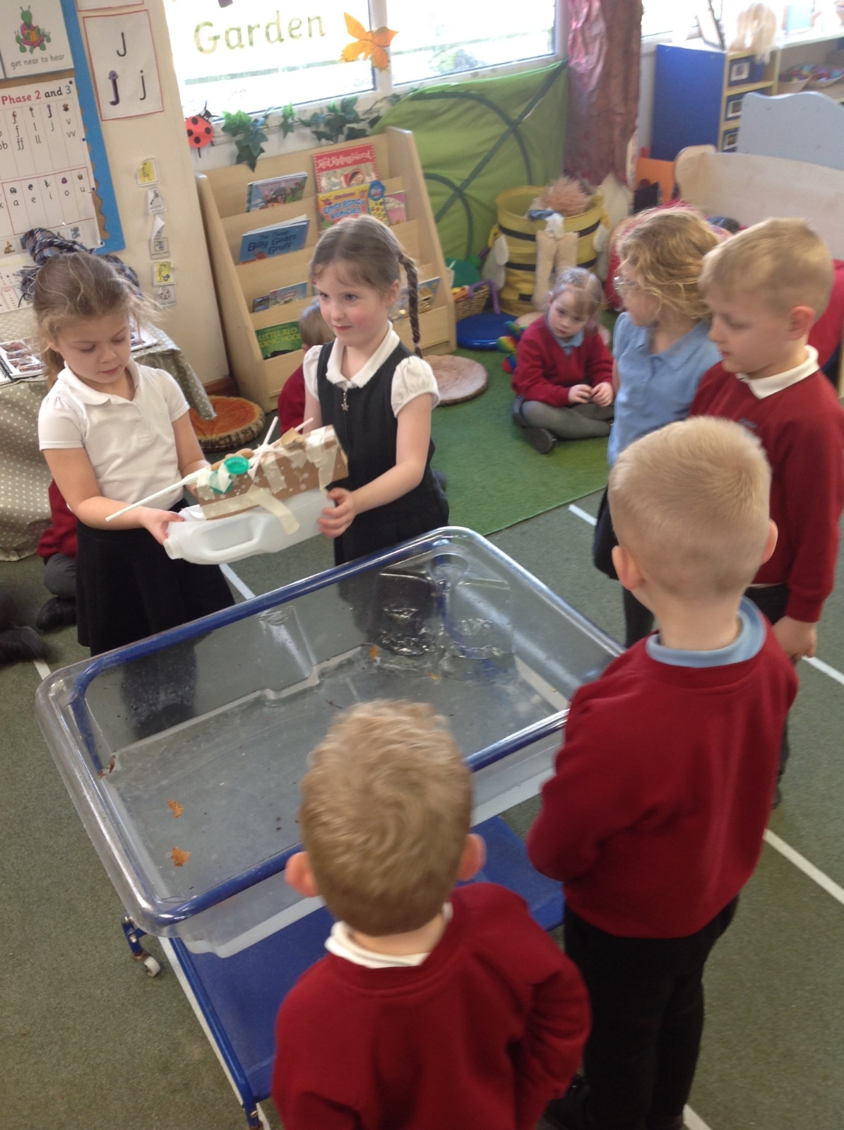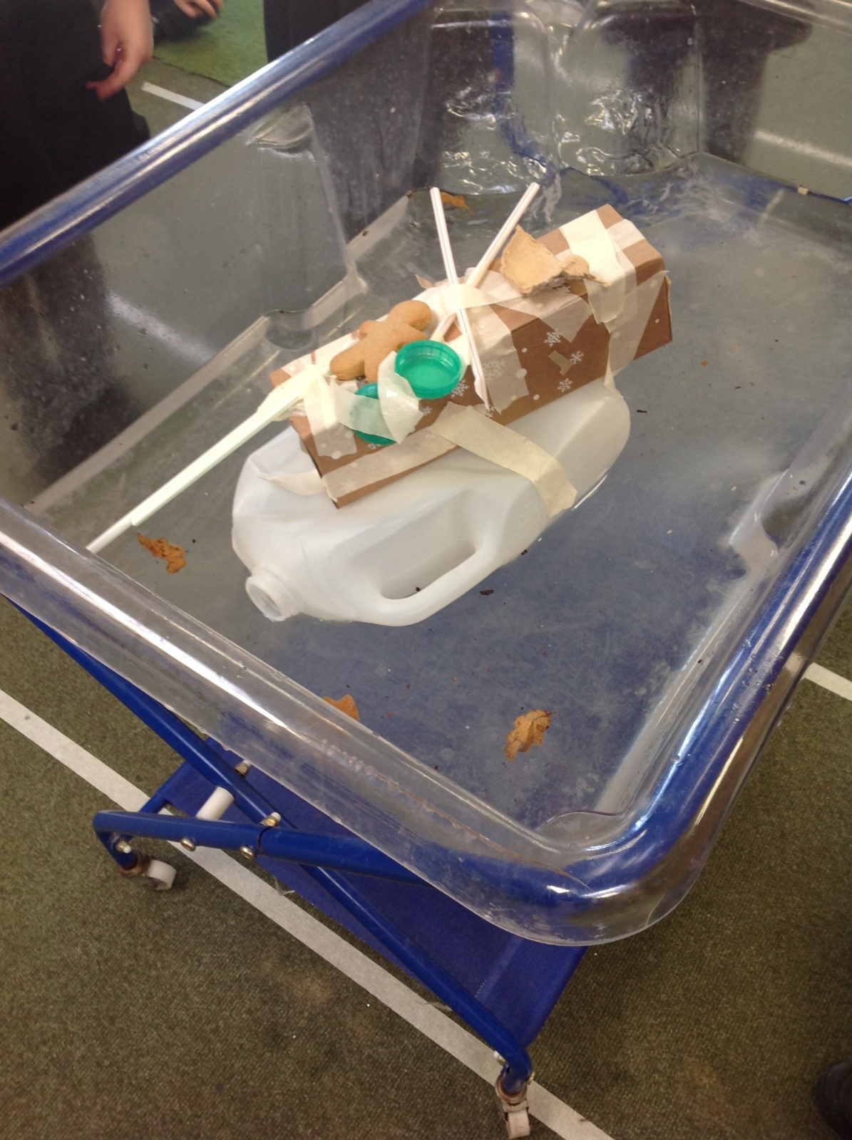 The children had to work together in teams to collaborate their ideas for making a good raft that would float across the water, to enable the Gingerbread Man to safely cross to the other side. They used junk materials and masking tape to build their rafts. Some were successful, some were not as successful but it was great fun to watch and the children demonstrated good teamwork skills.