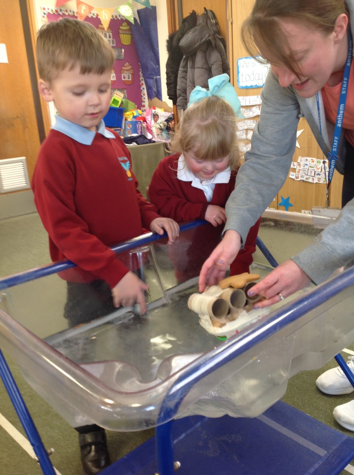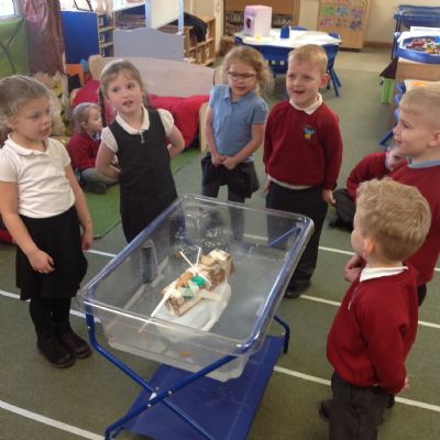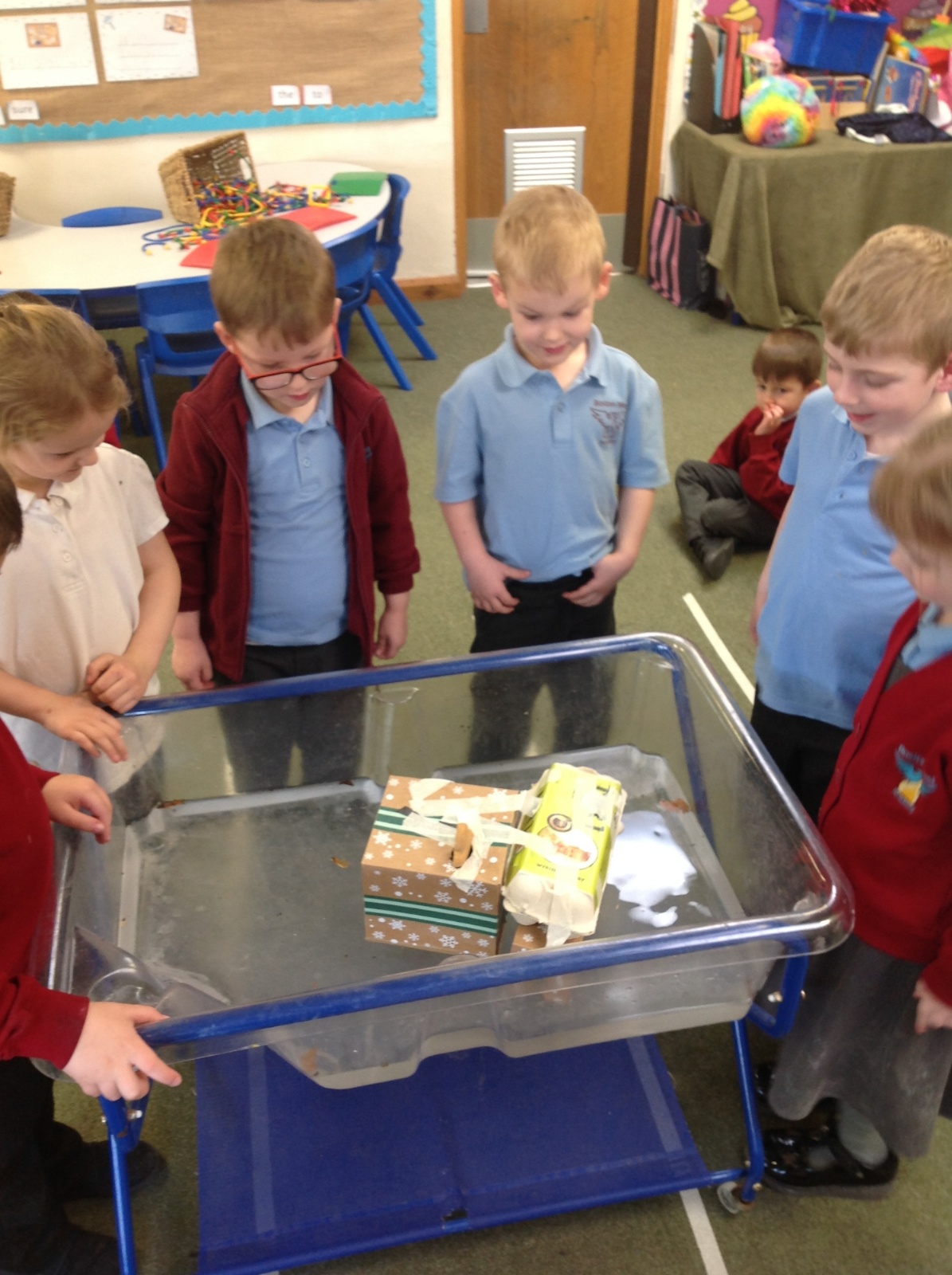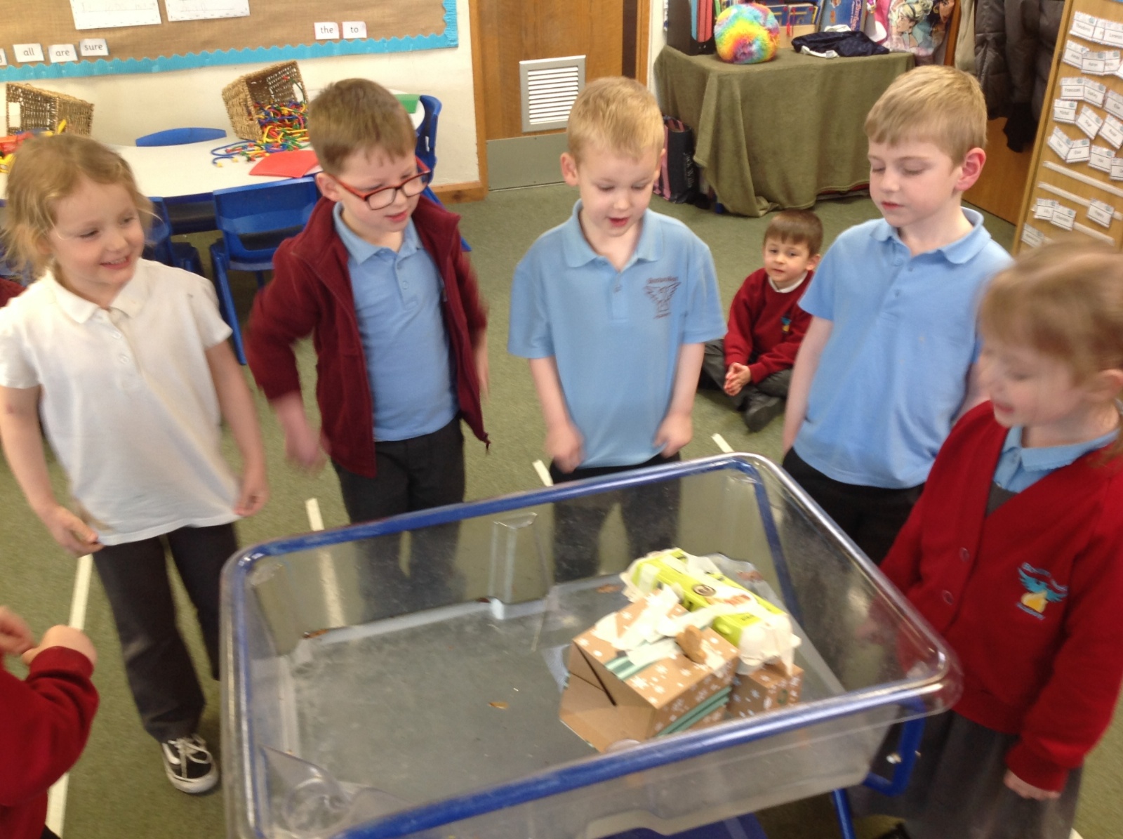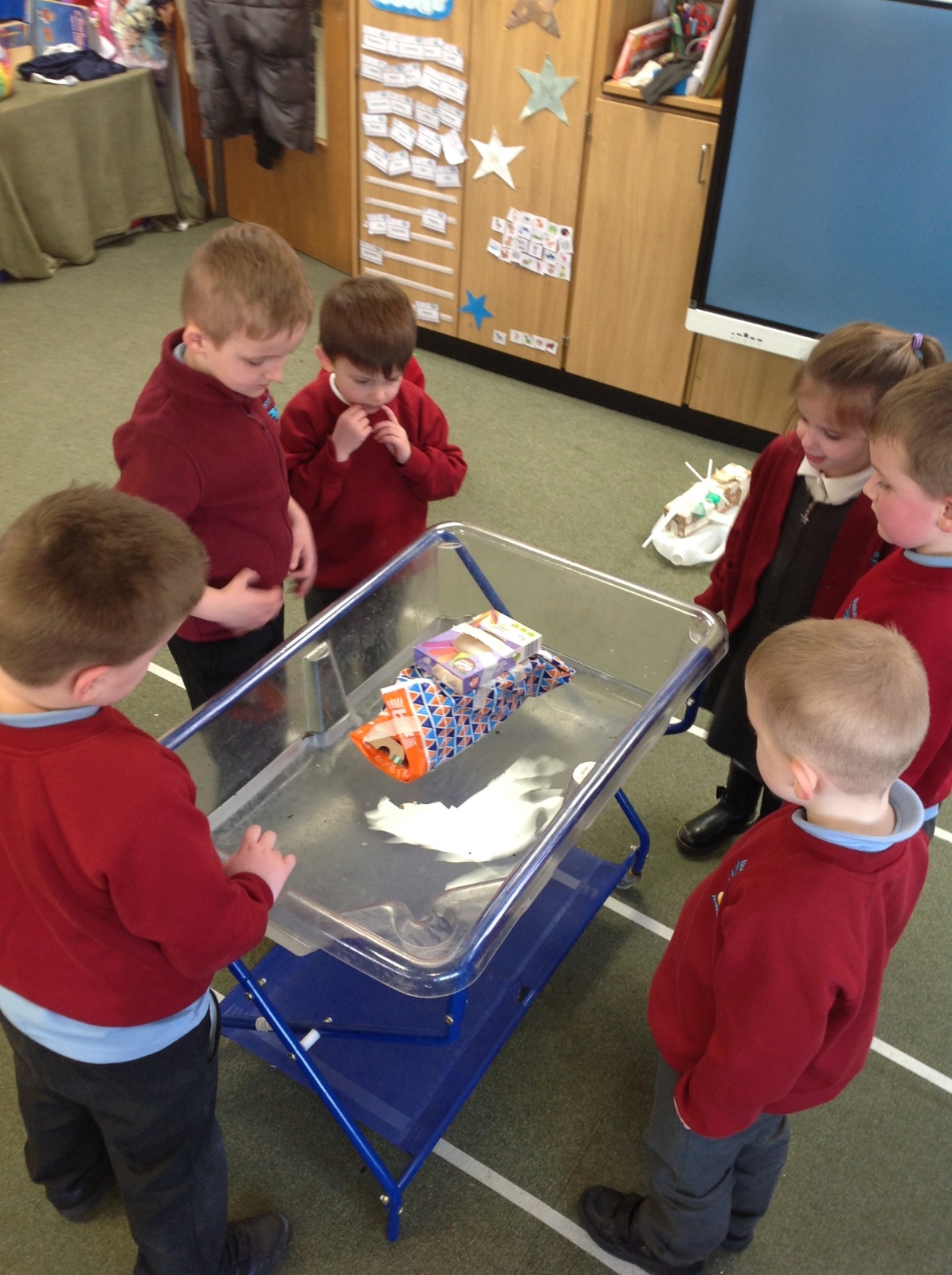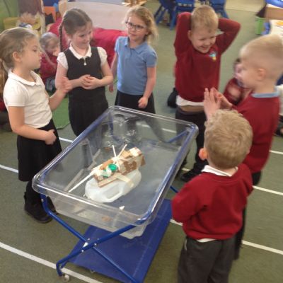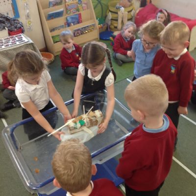 The children had to work together in teams to collaborate their ideas for making a good raft that would float across the water, to enable the Gingerbread Man to safely cross to the other side. They used junk materials and masking tape to build their rafts. Some were successful, some were not as successful but it was great fun to watch and the children demonstrated good teamwork skills.