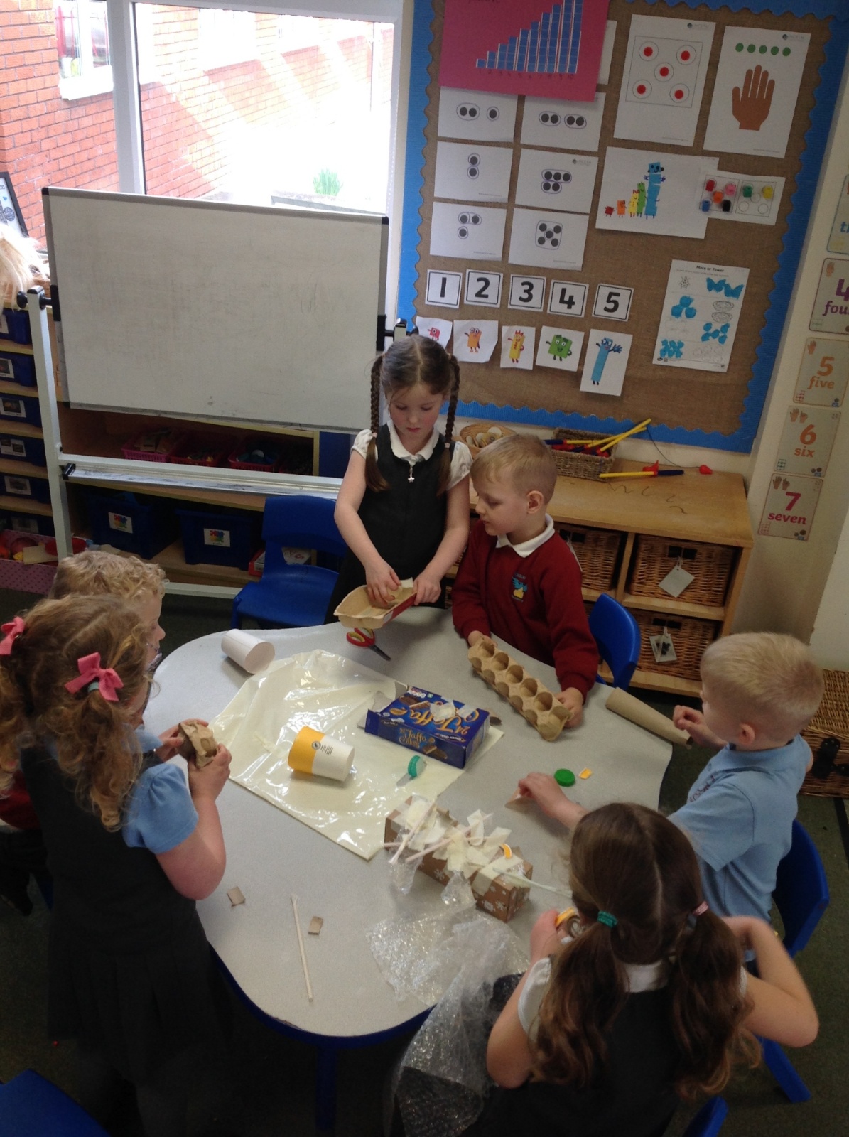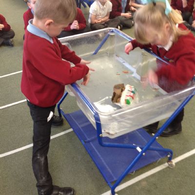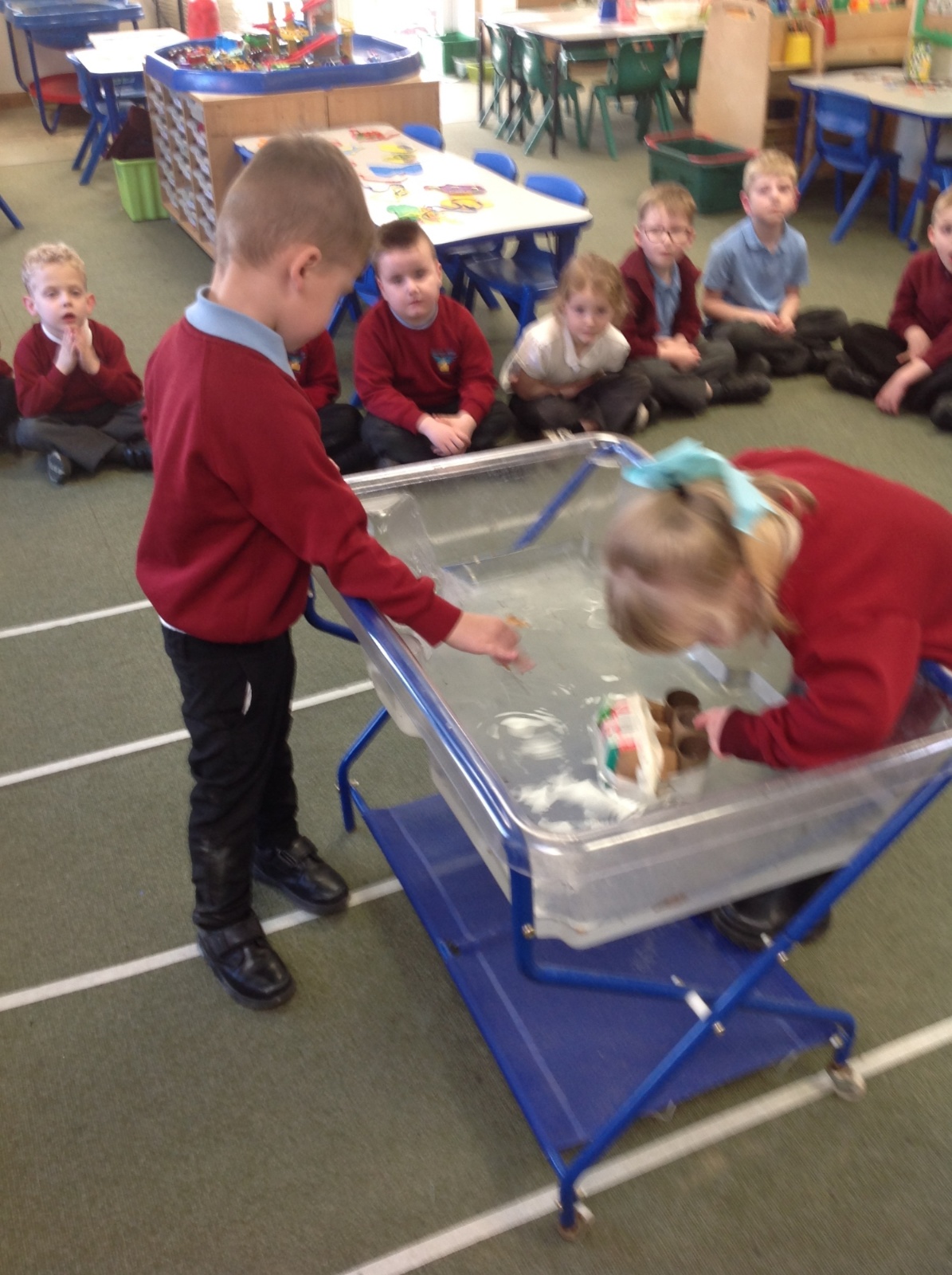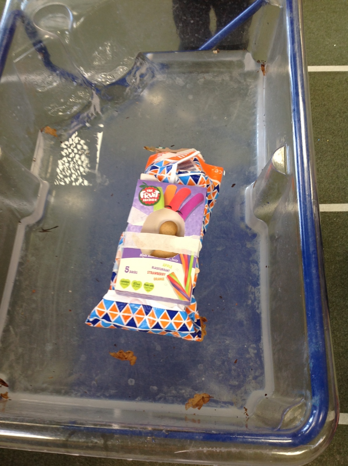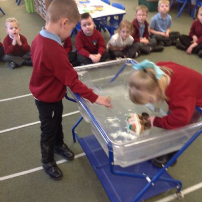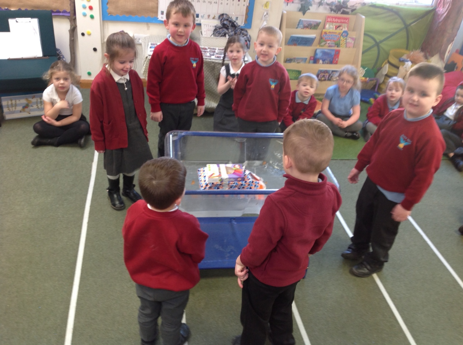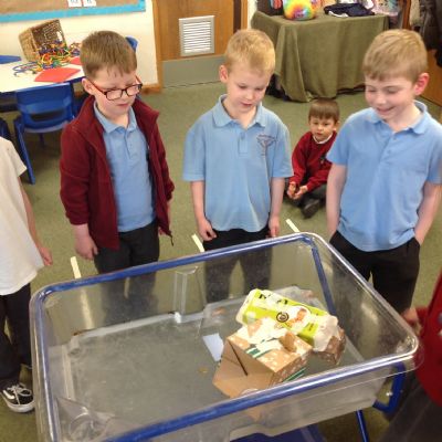 The children had to work together in teams to collaborate their ideas for making a good raft that would float across the water, to enable the Gingerbread Man to safely cross to the other side. They used junk materials and masking tape to build their rafts. Some were successful, some were not as successful but it was great fun to watch and the children demonstrated good teamwork skills.