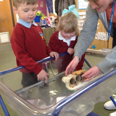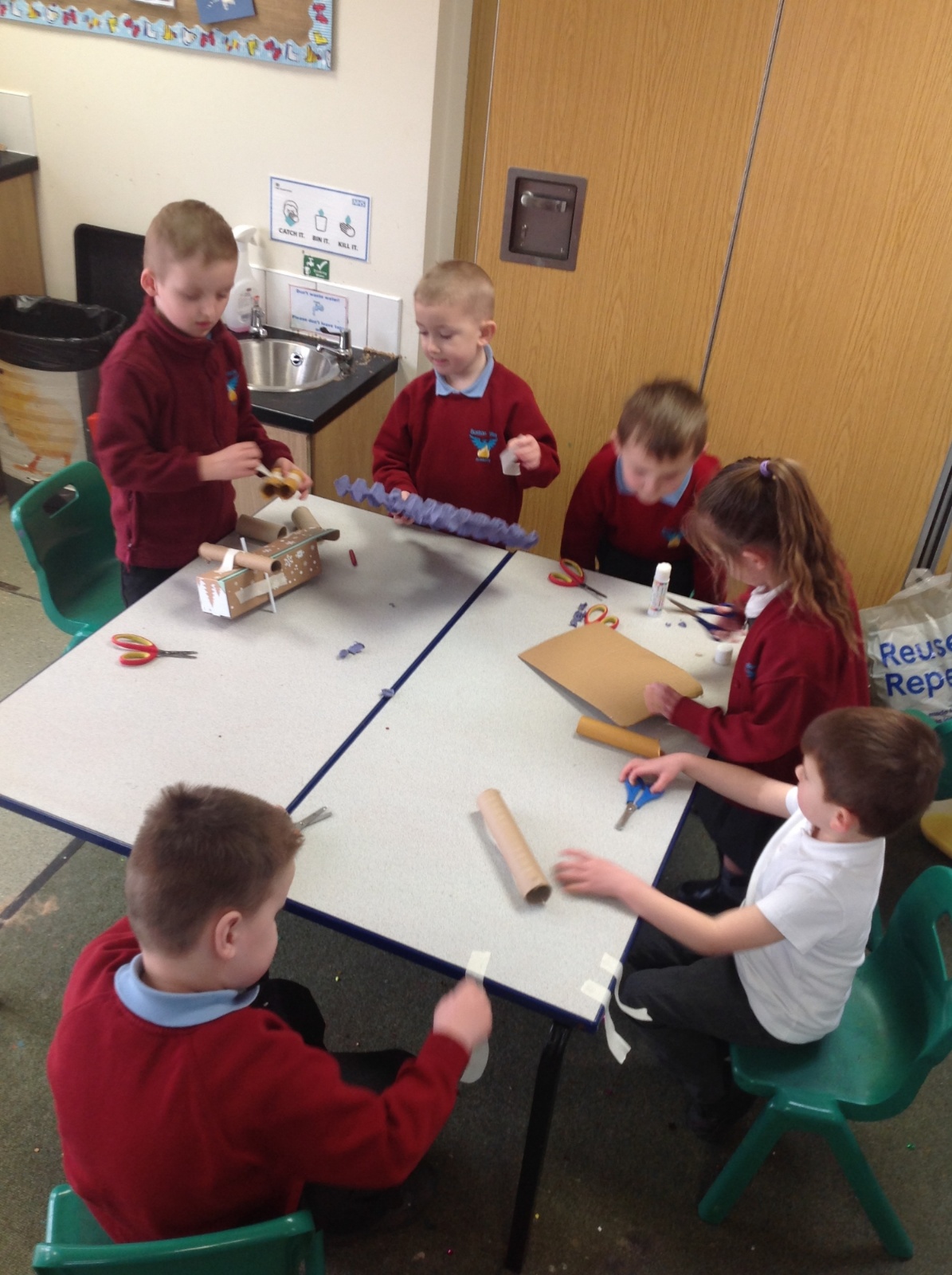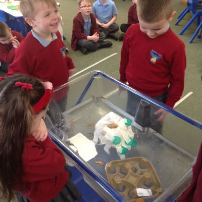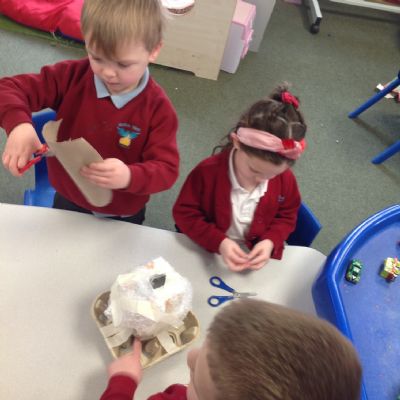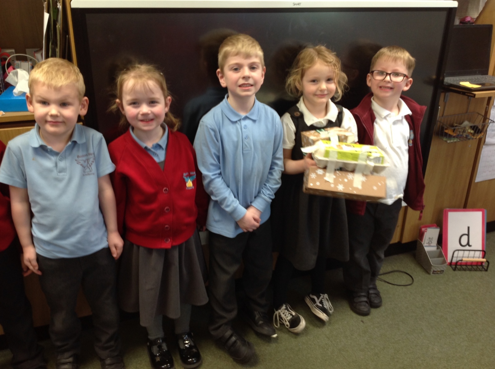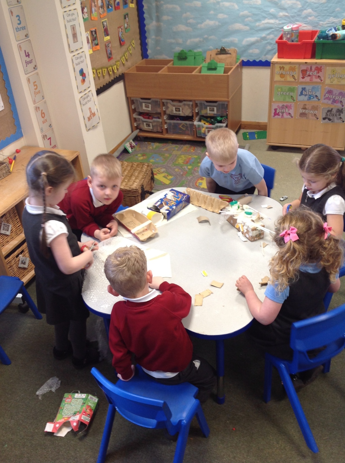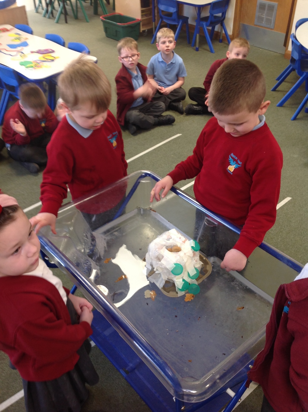 The children had to work together in teams to collaborate their ideas for making a good raft that would float across the water, to enable the Gingerbread Man to safely cross to the other side. They used junk materials and masking tape to build their rafts. Some were successful, some were not as successful but it was great fun to watch and the children demonstrated good teamwork skills.