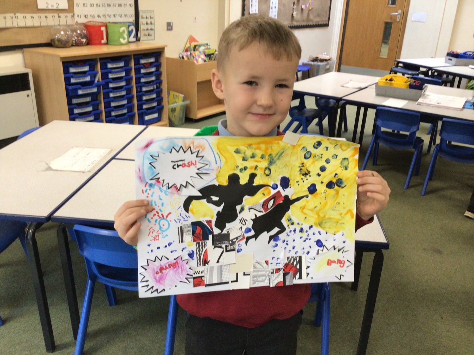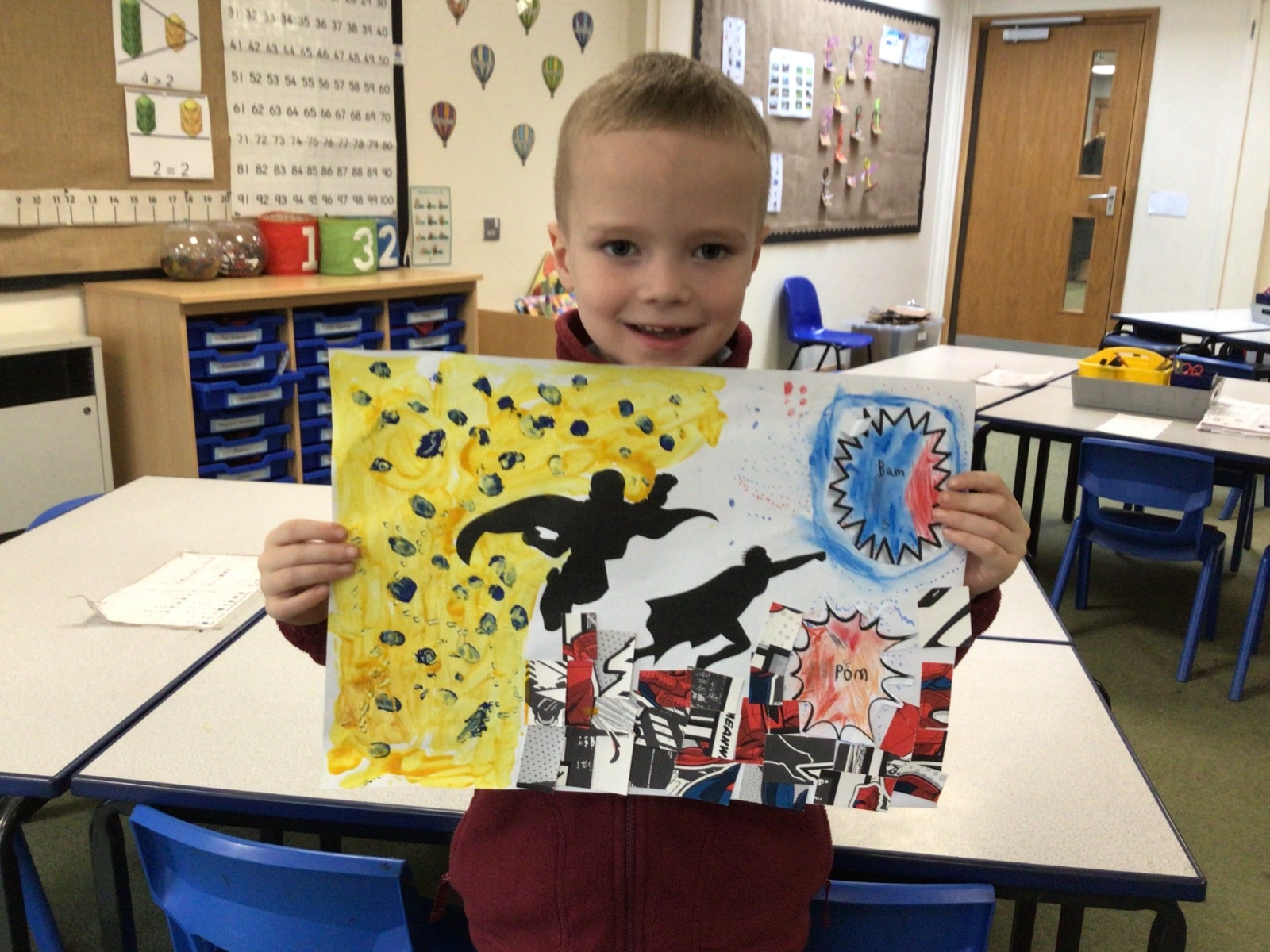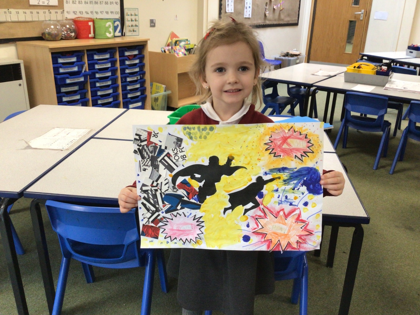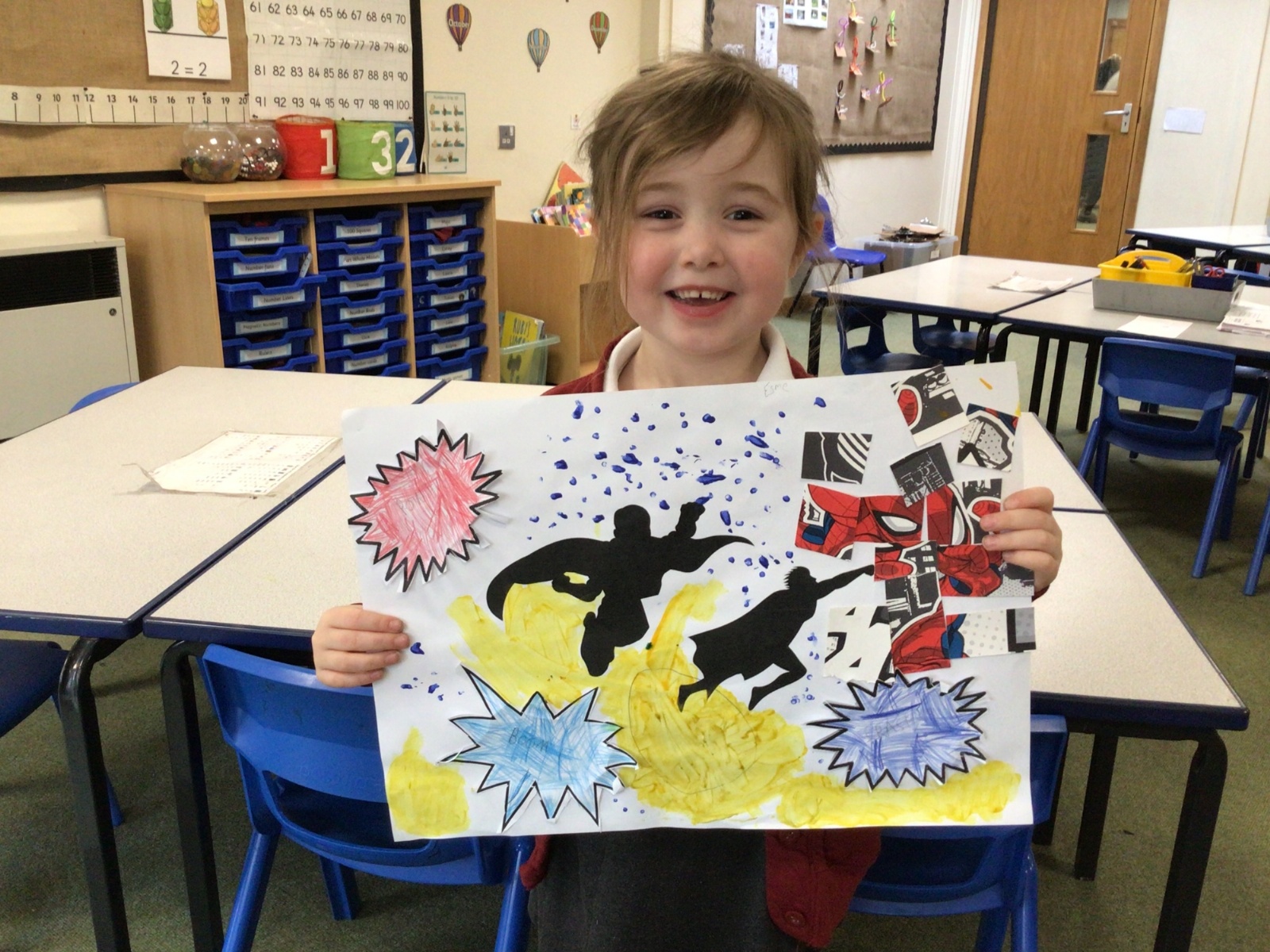 The children have enjoyed creating superhero-themed art over the past few weeks. They have used a range of techniques, including collage, painting as well as mark making.