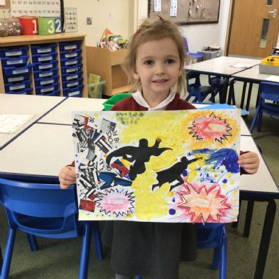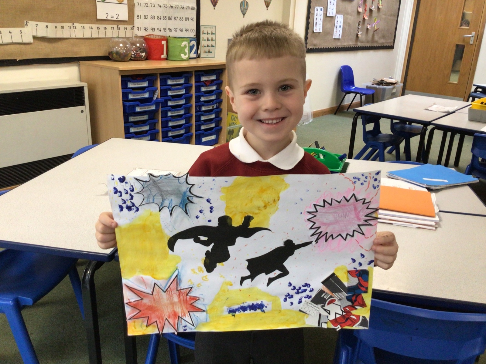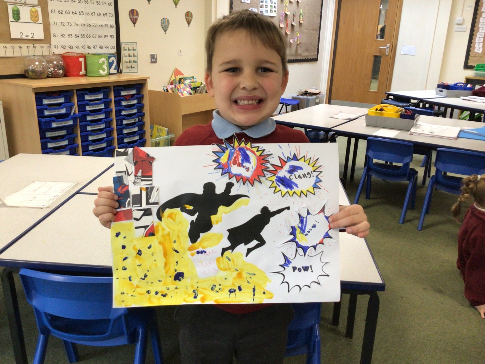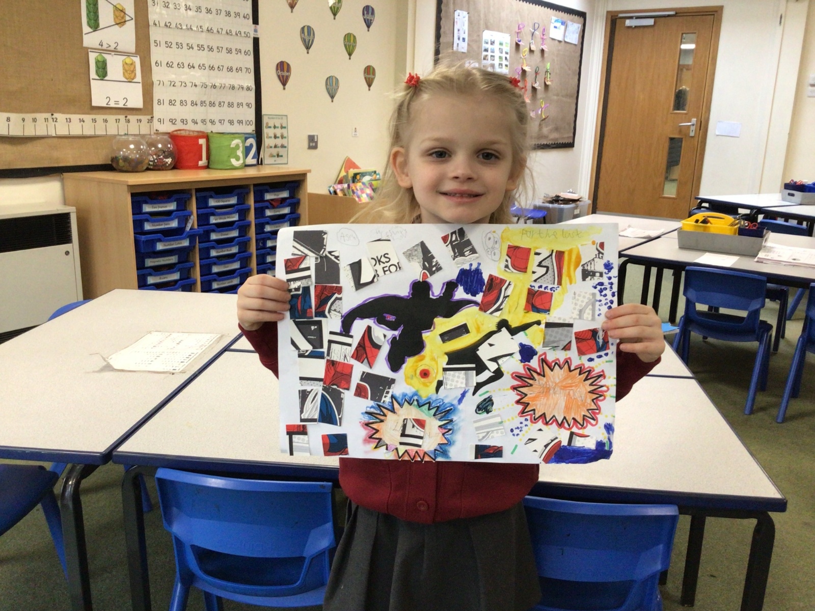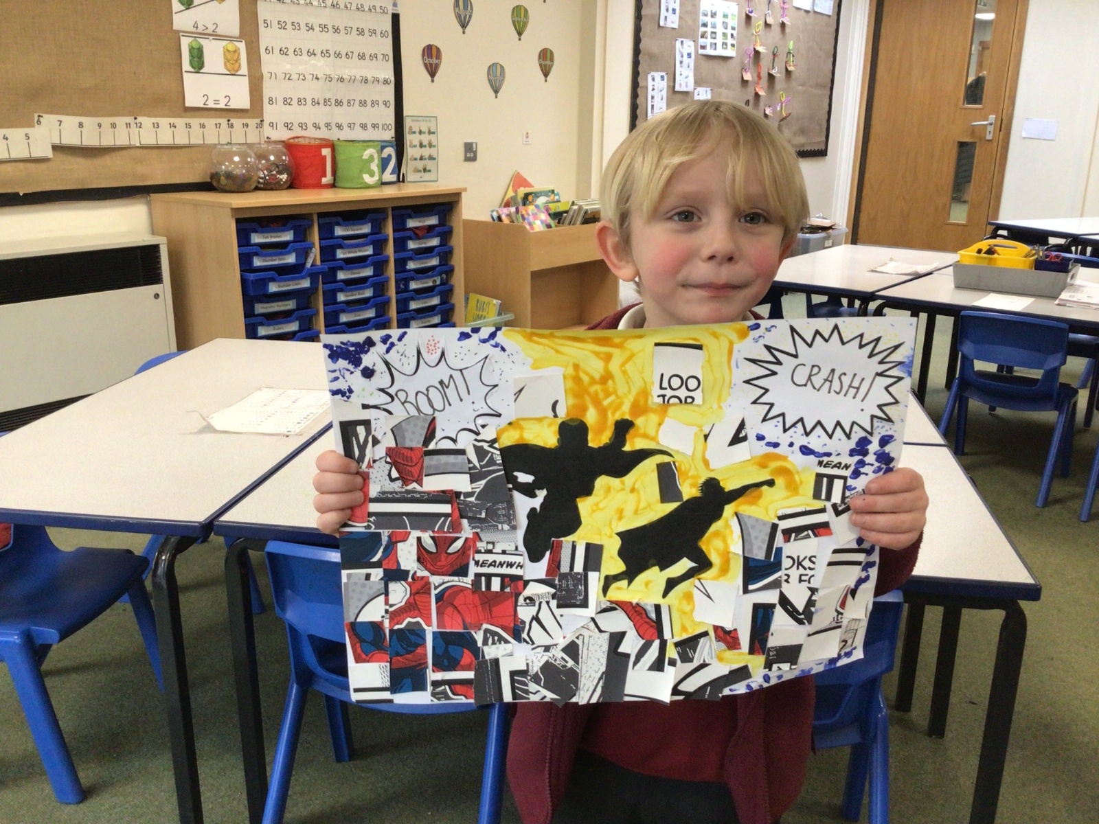 The children have enjoyed creating superhero-themed art over the past few weeks. They have used a range of techniques, including collage, painting as well as mark making.