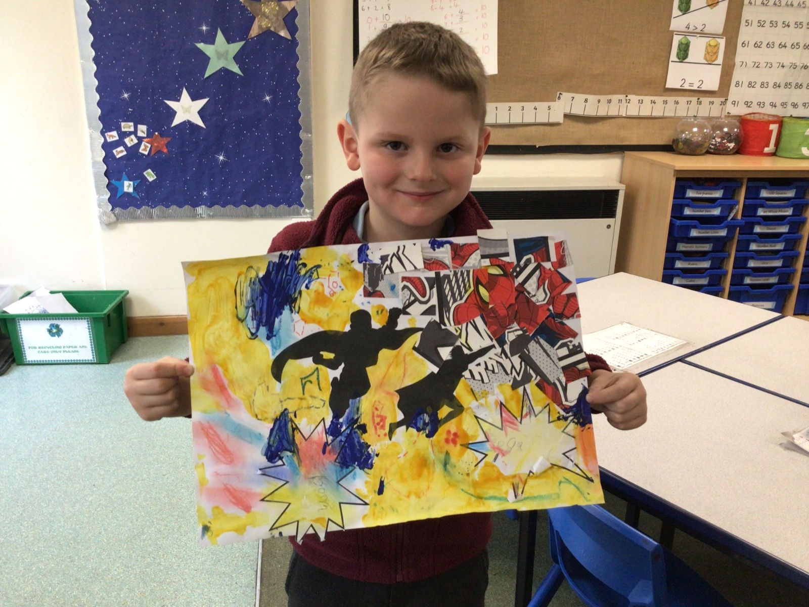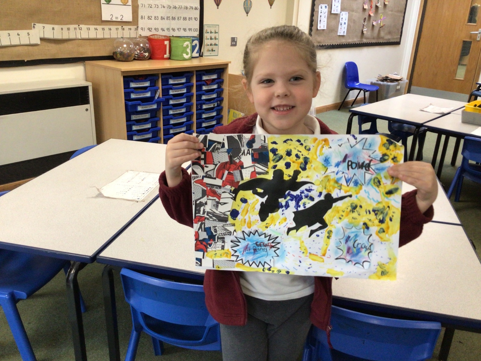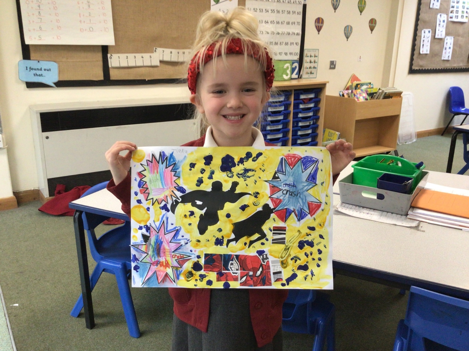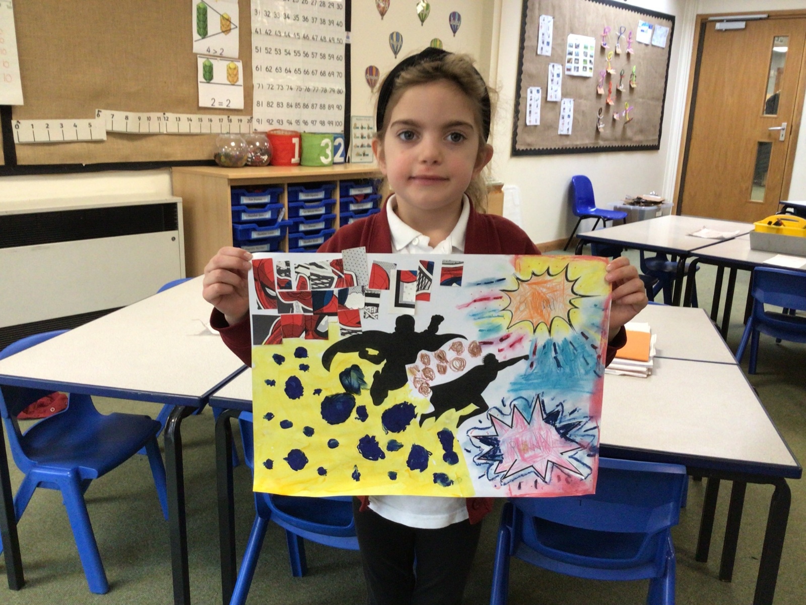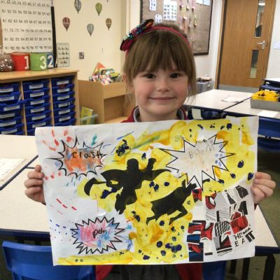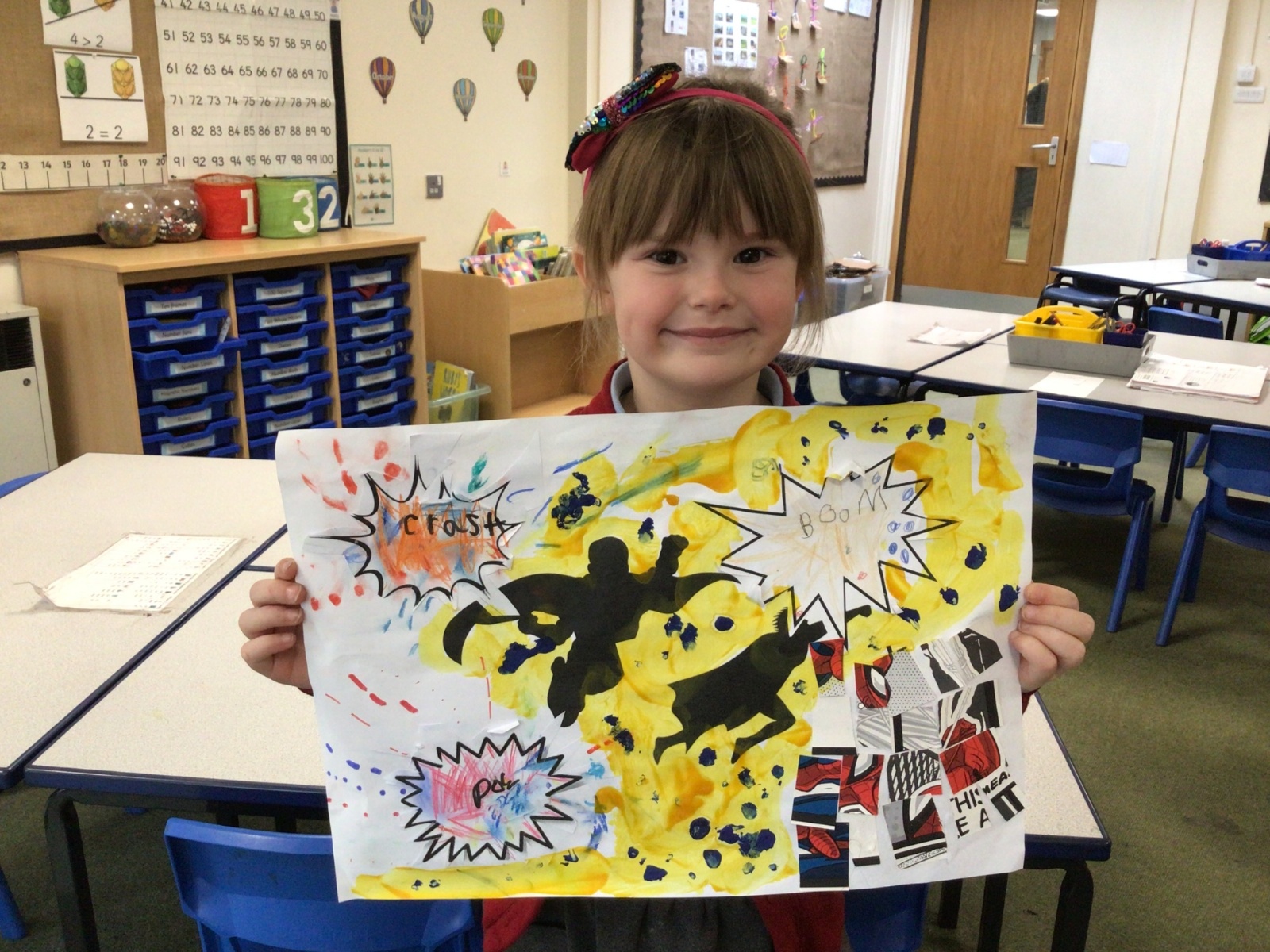 The children have enjoyed creating superhero-themed art over the past few weeks. They have used a range of techniques, including collage, painting as well as mark making.