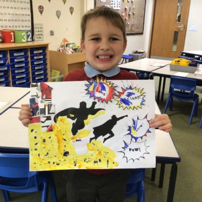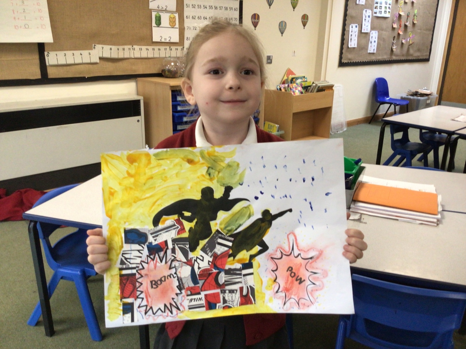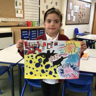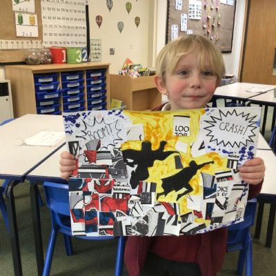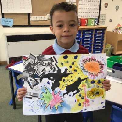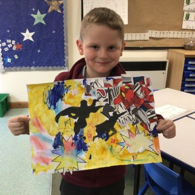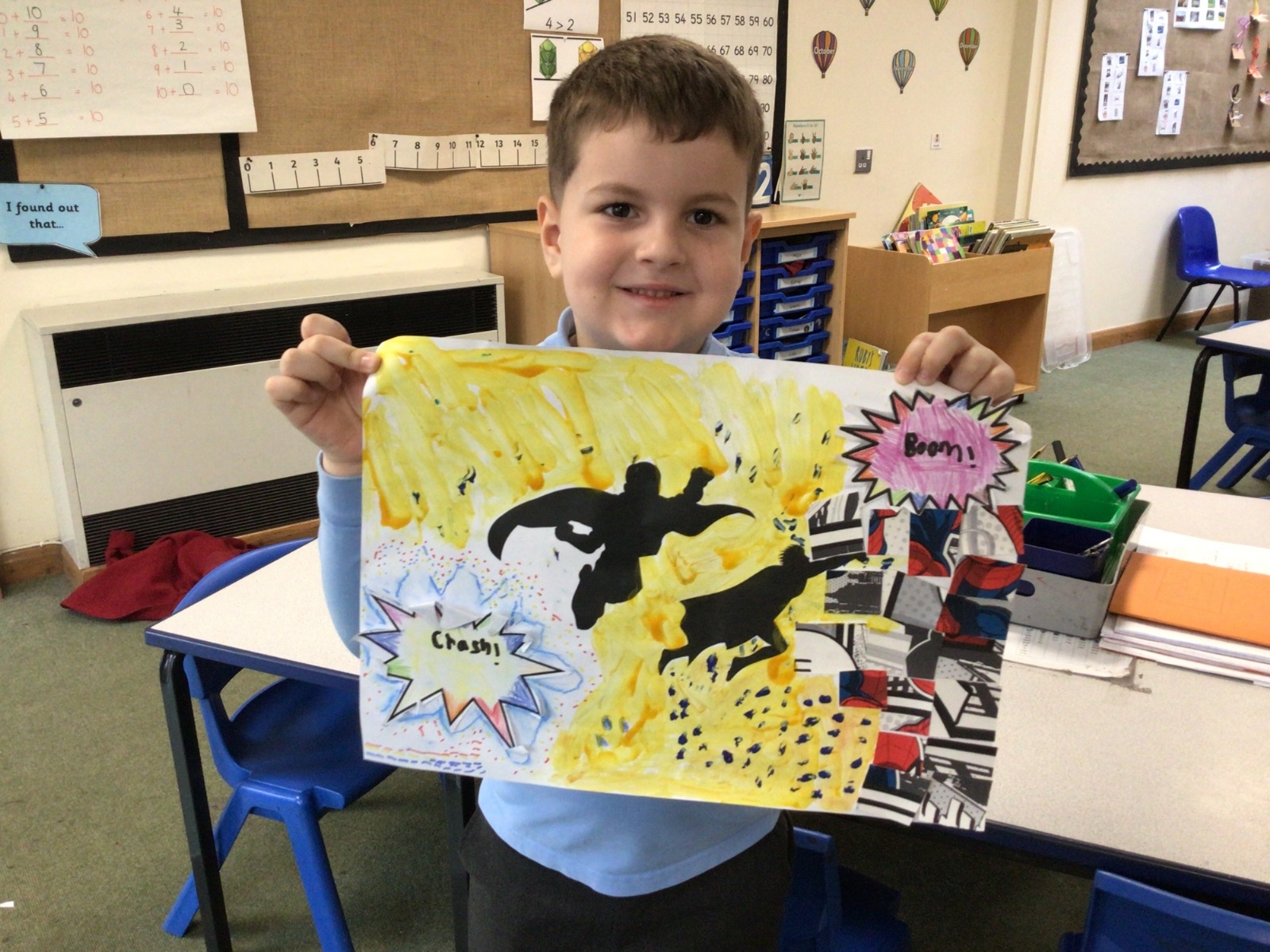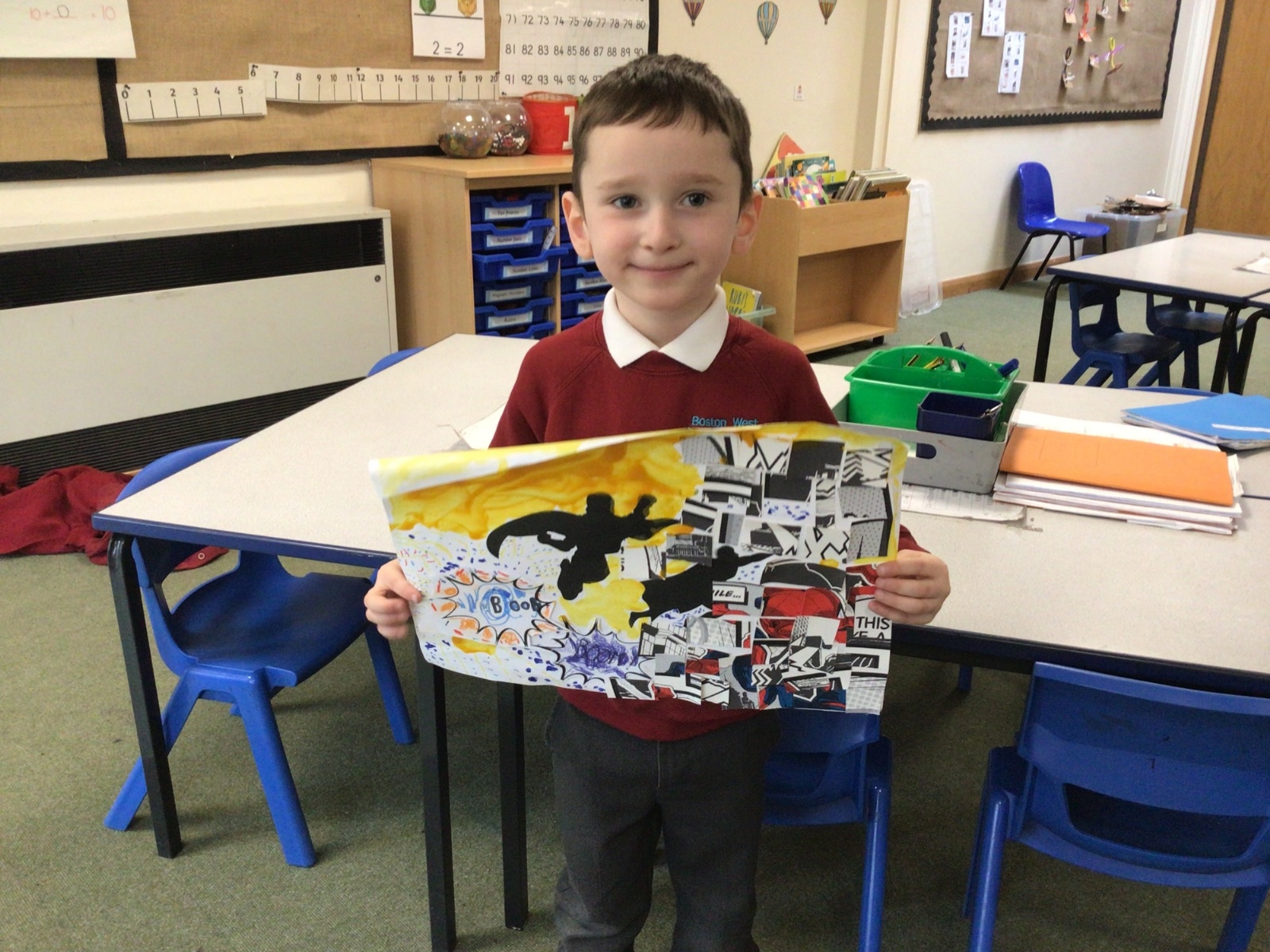 The children have enjoyed creating superhero-themed art over the past few weeks. They have used a range of techniques, including collage, painting as well as mark making.