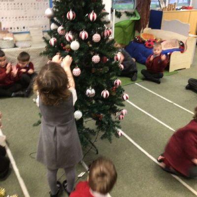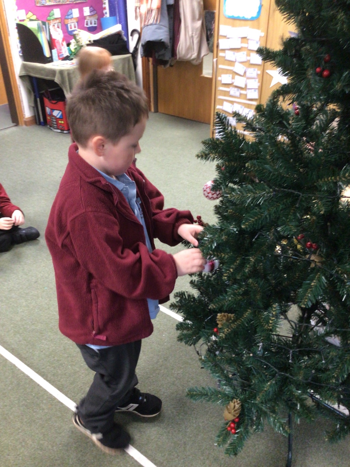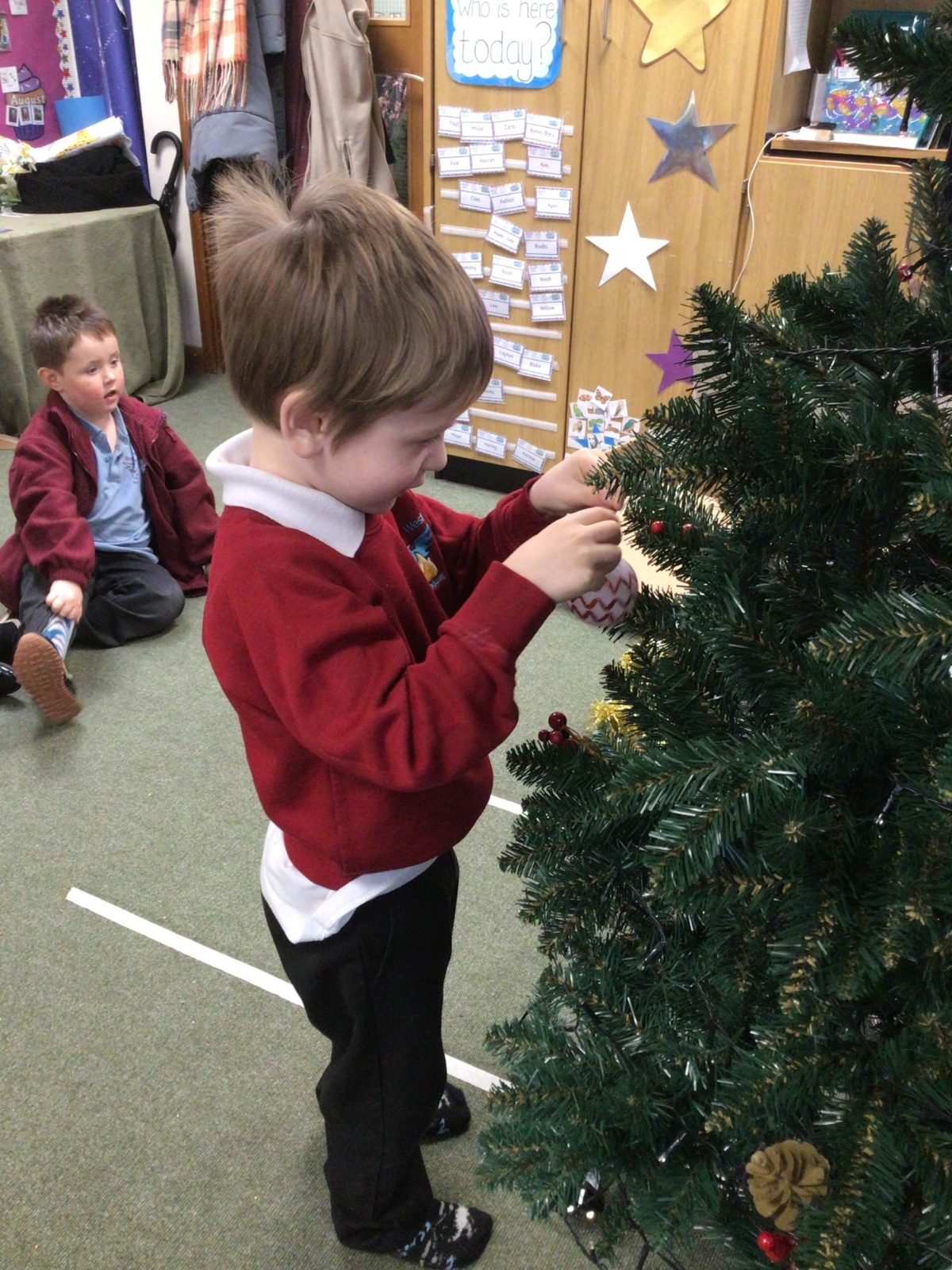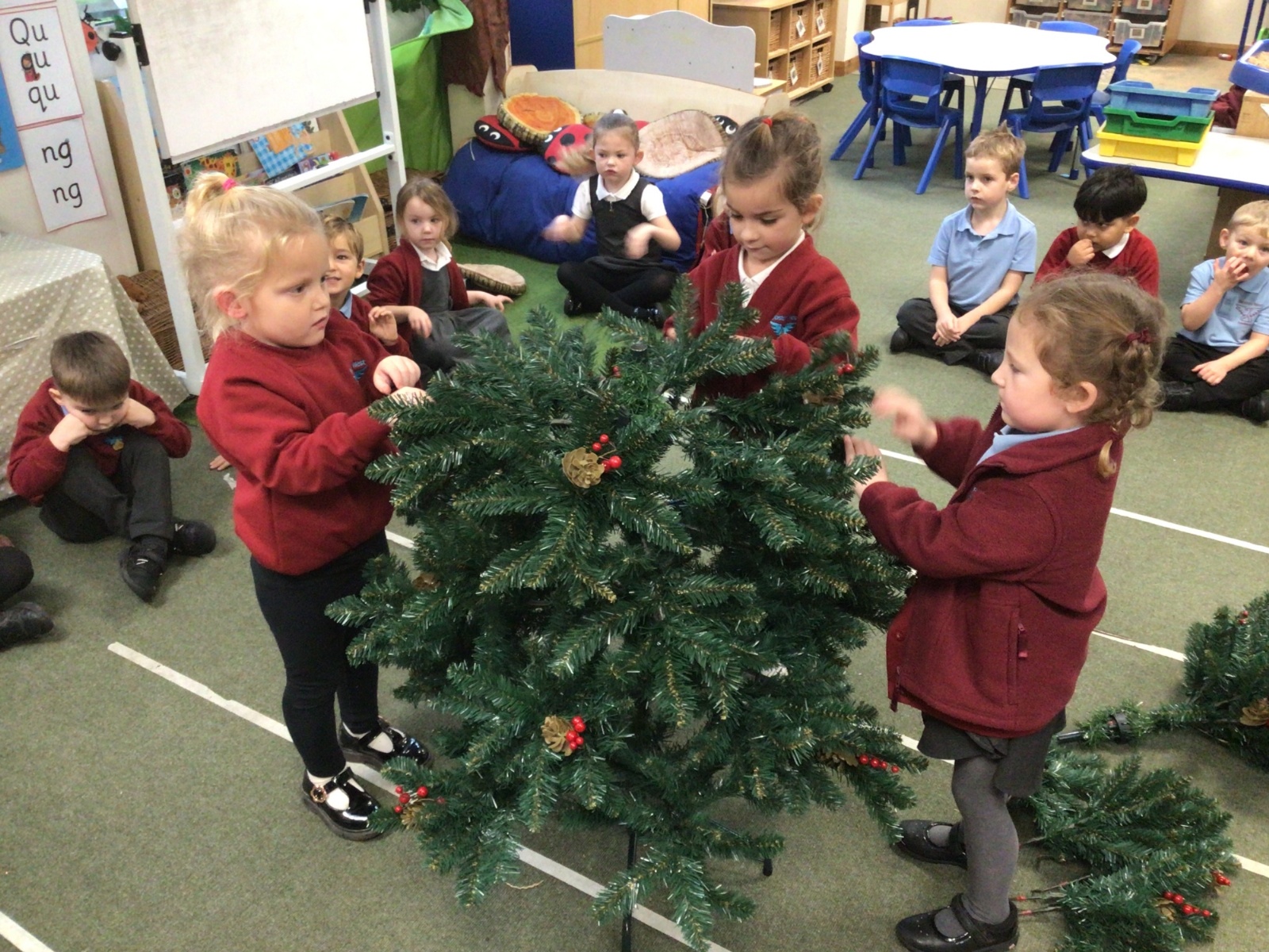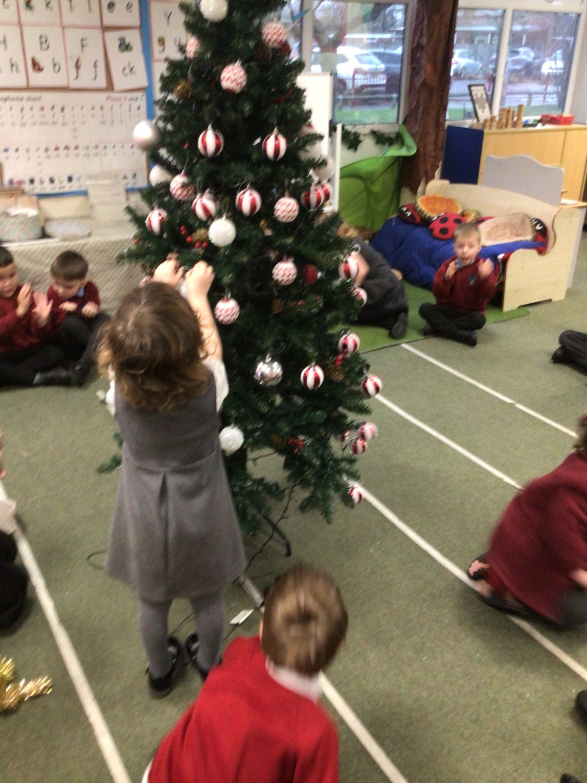 The children enjoyed decorating our class Christmas tree. They helped to build the tree, spread out the branches and put the lights, baubles and tinsel on. They were very proud of the end product!