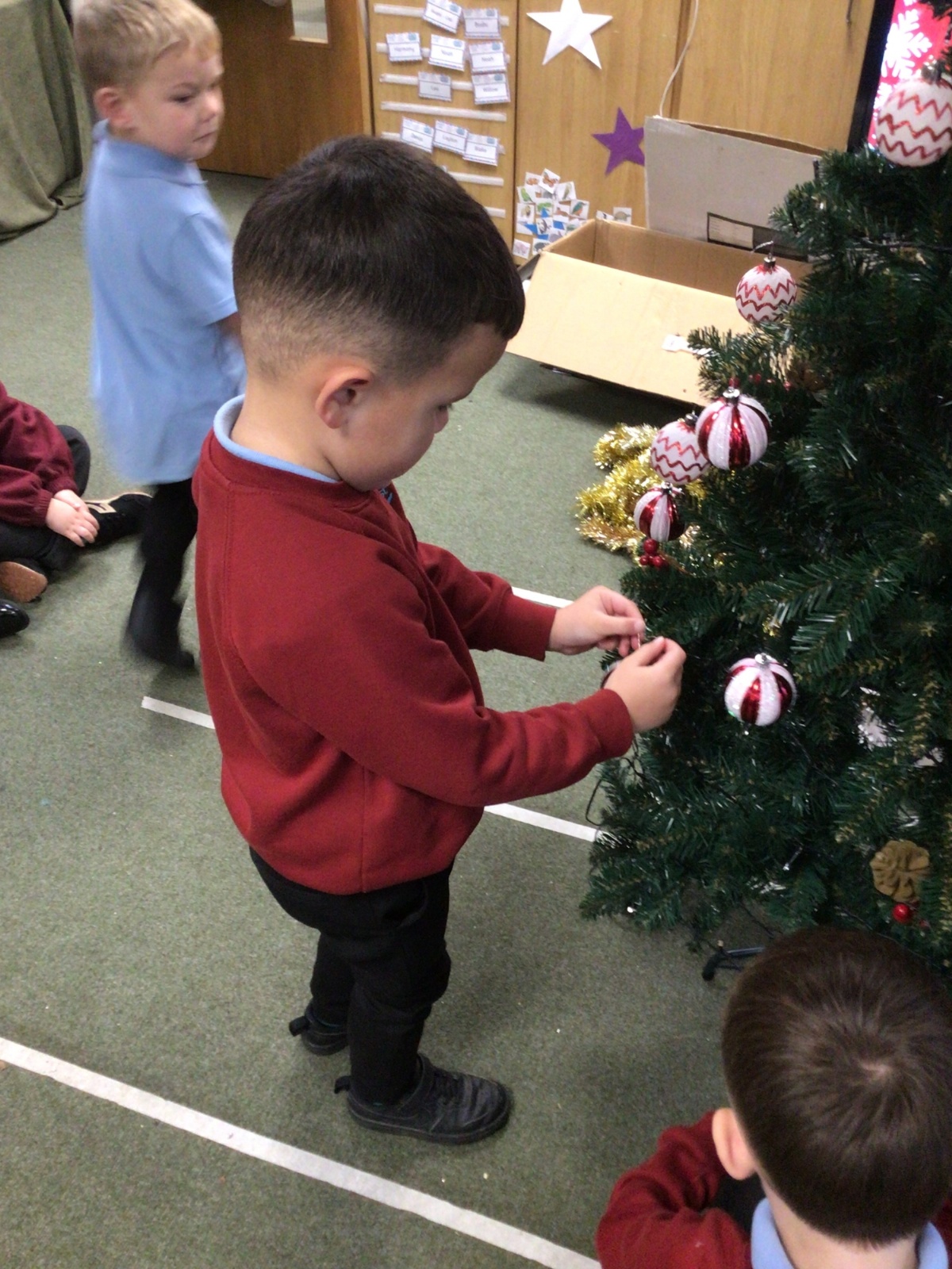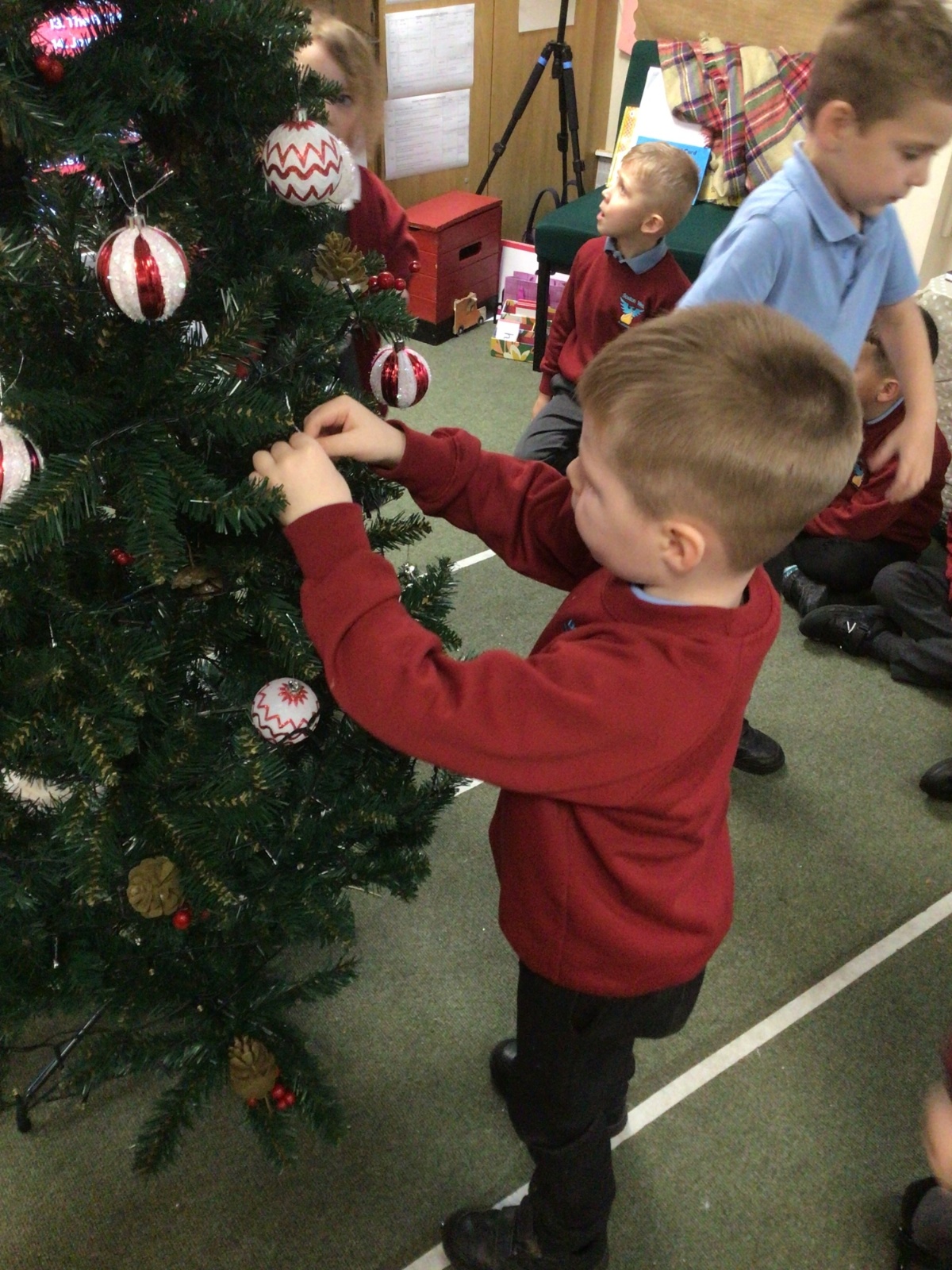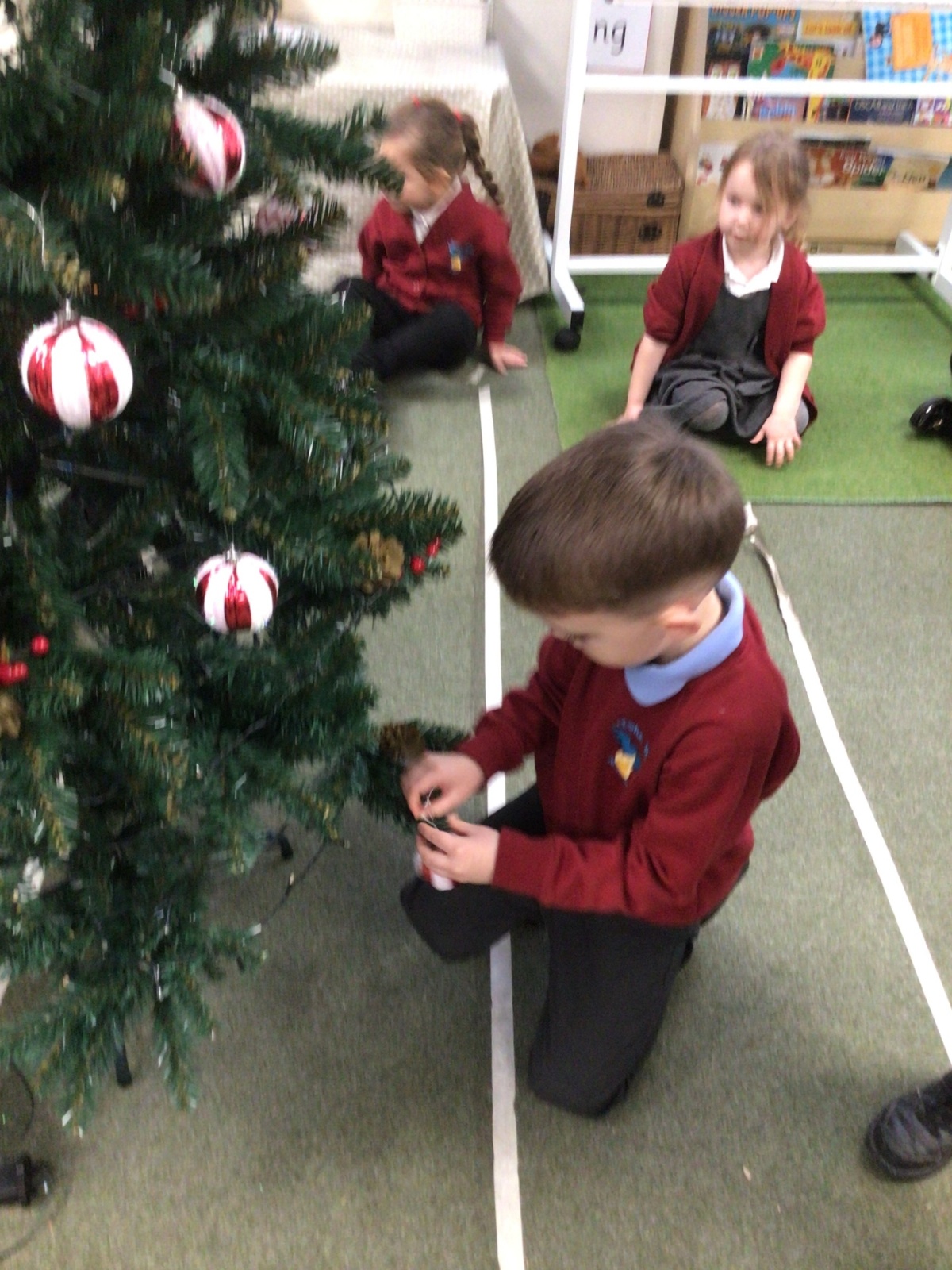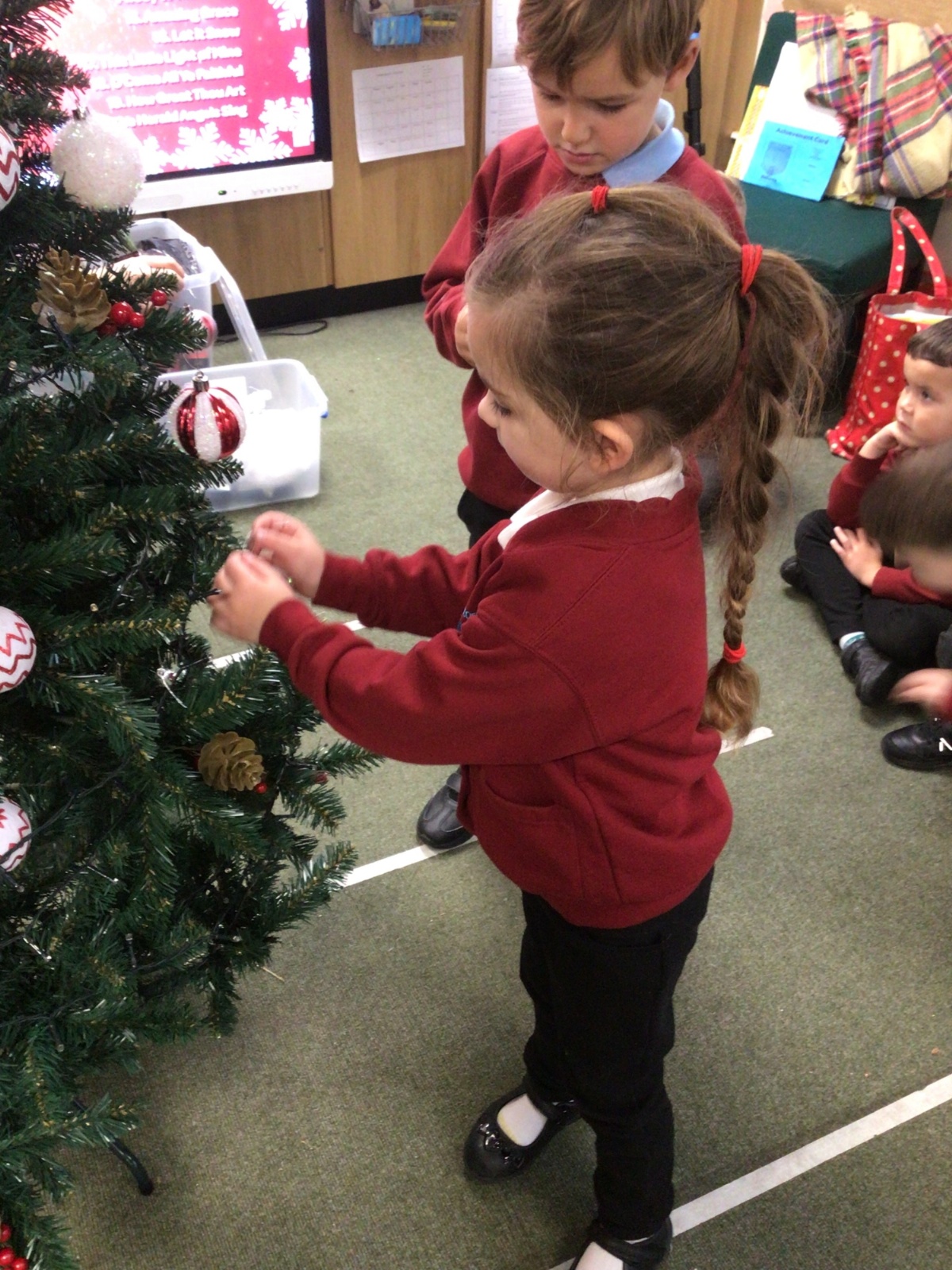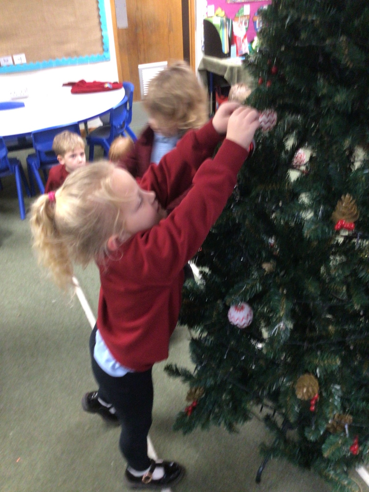 The children enjoyed decorating our class Christmas tree. They helped to build the tree, spread out the branches and put the lights, baubles and tinsel on. They were very proud of the end product!
