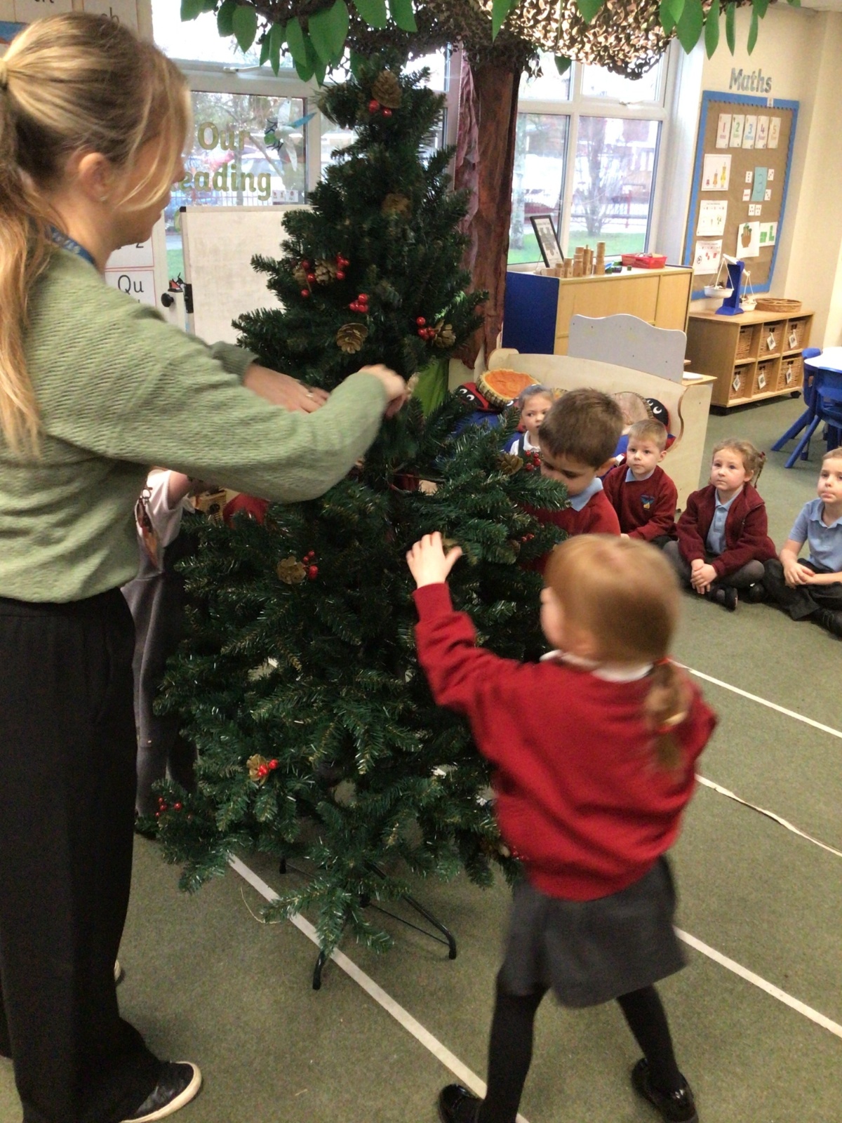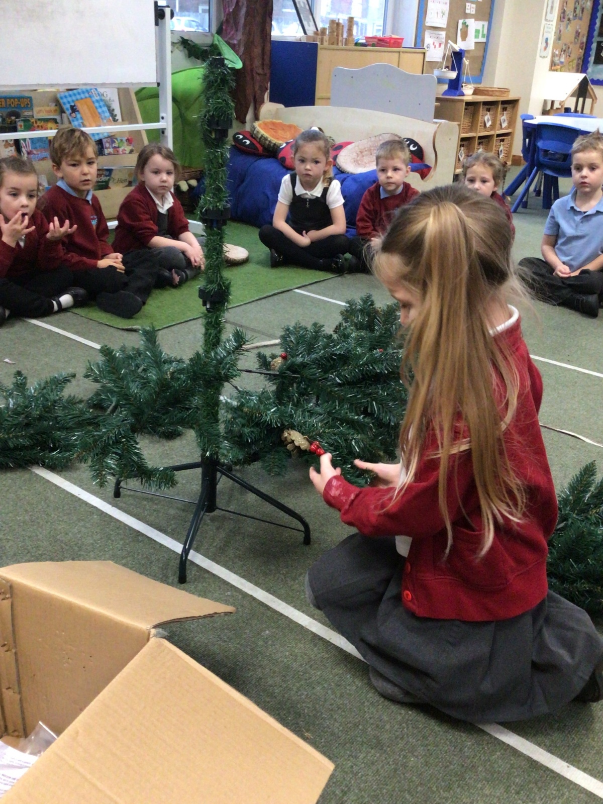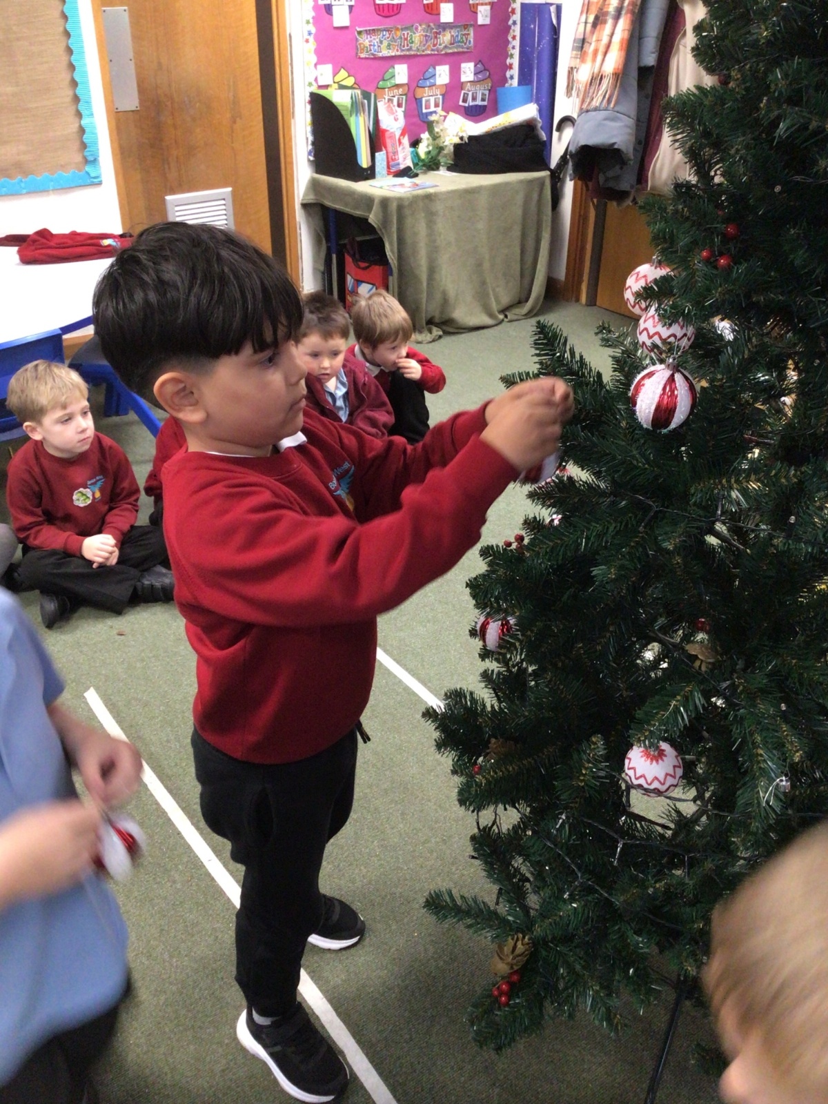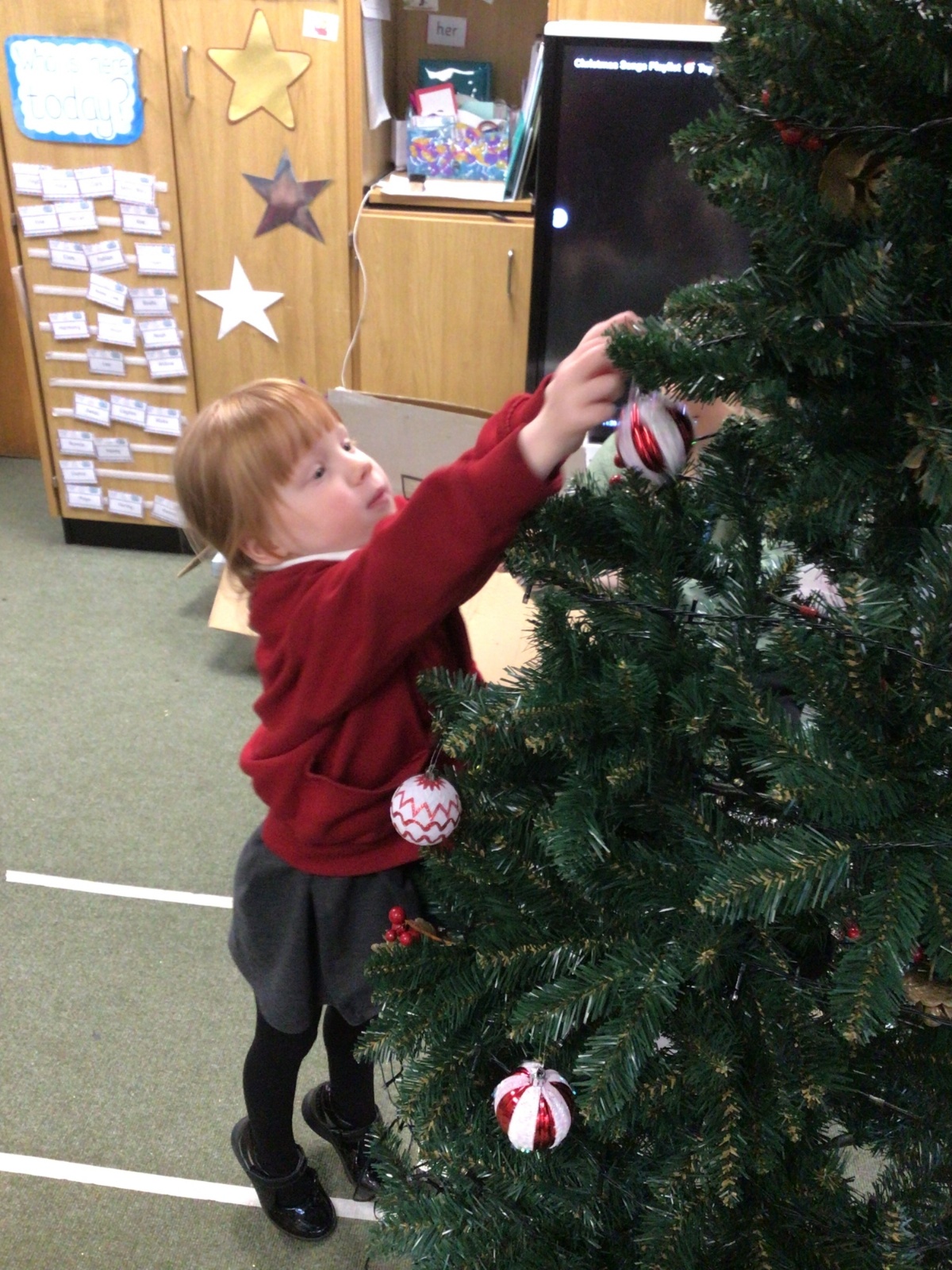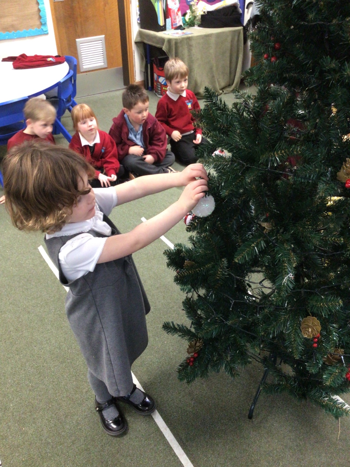 The children enjoyed decorating our class Christmas tree. They helped to build the tree, spread out the branches and put the lights, baubles and tinsel on. They were very proud of the end product!