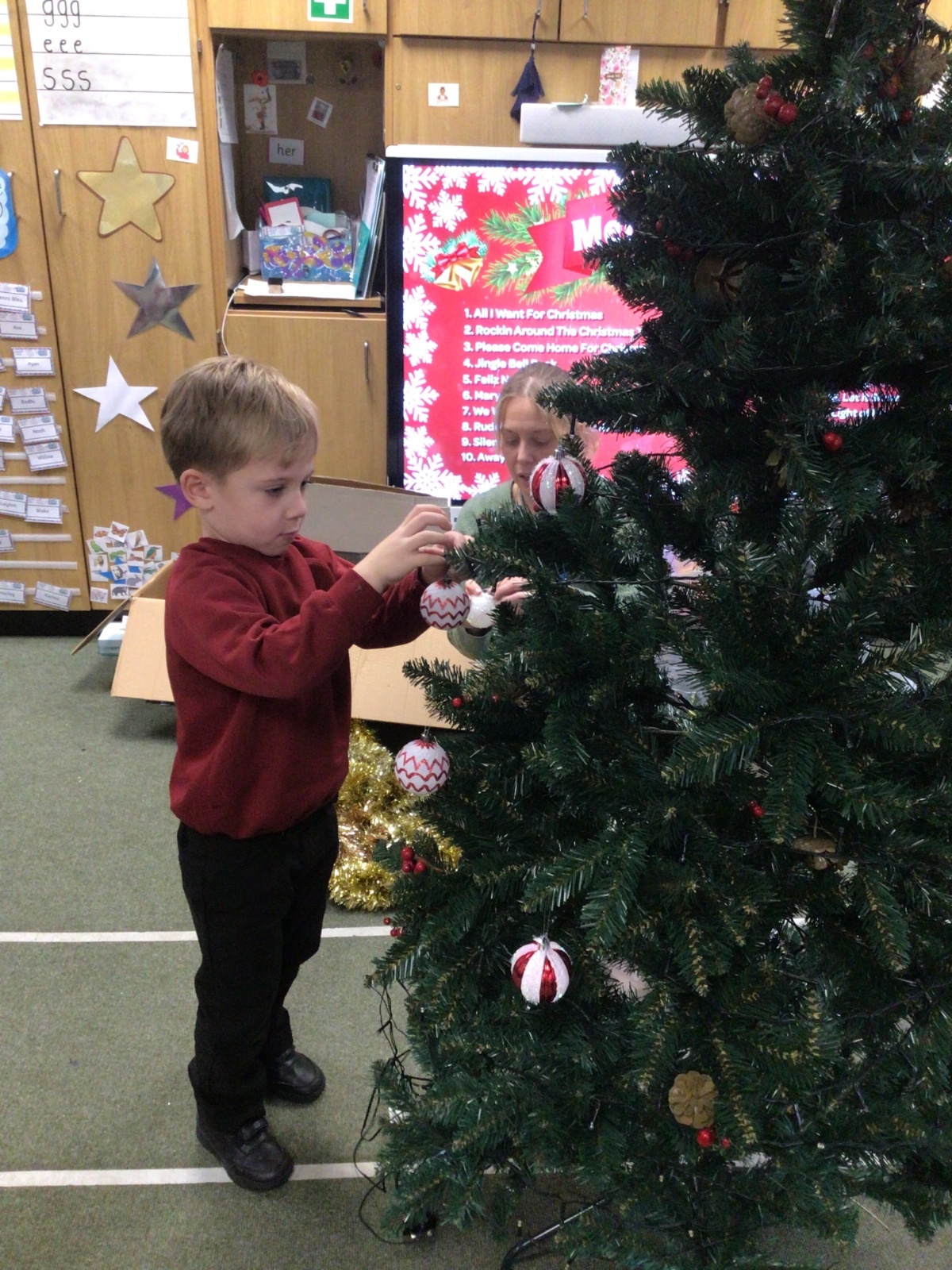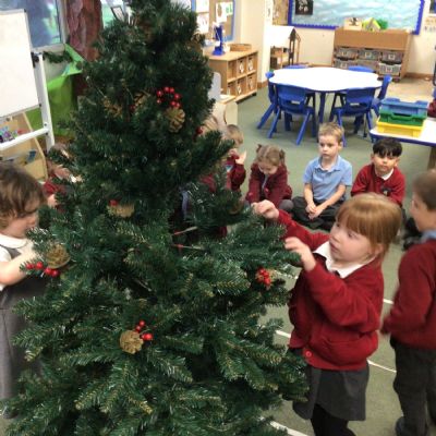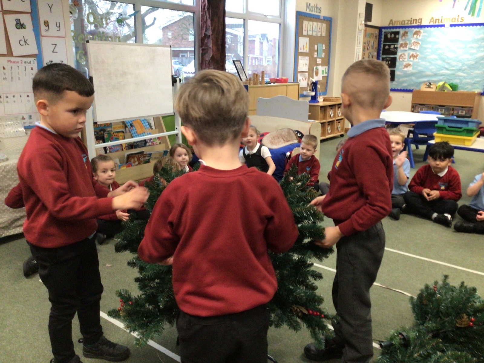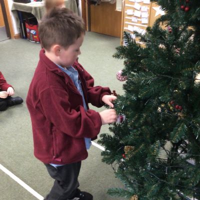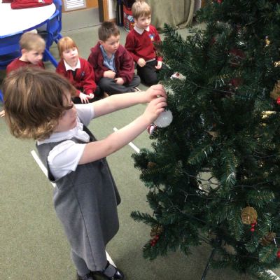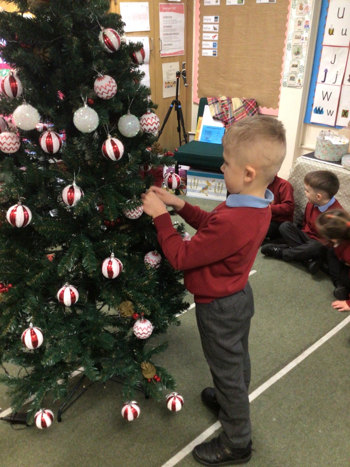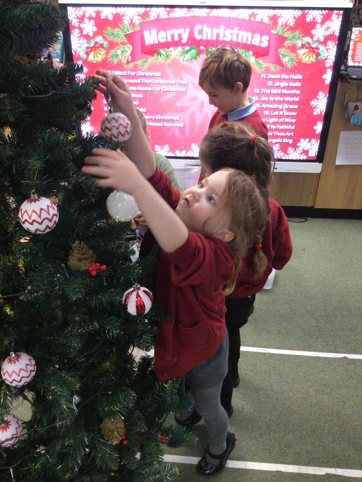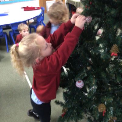 The children enjoyed decorating our class Christmas tree. They helped to build the tree, spread out the branches and put the lights, baubles and tinsel on. They were very proud of the end product!