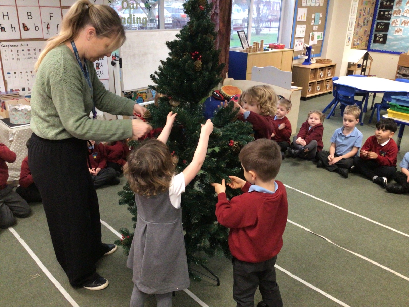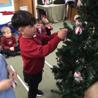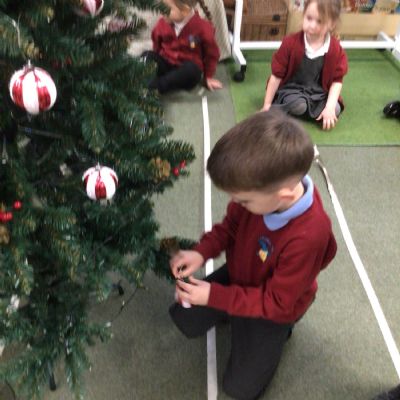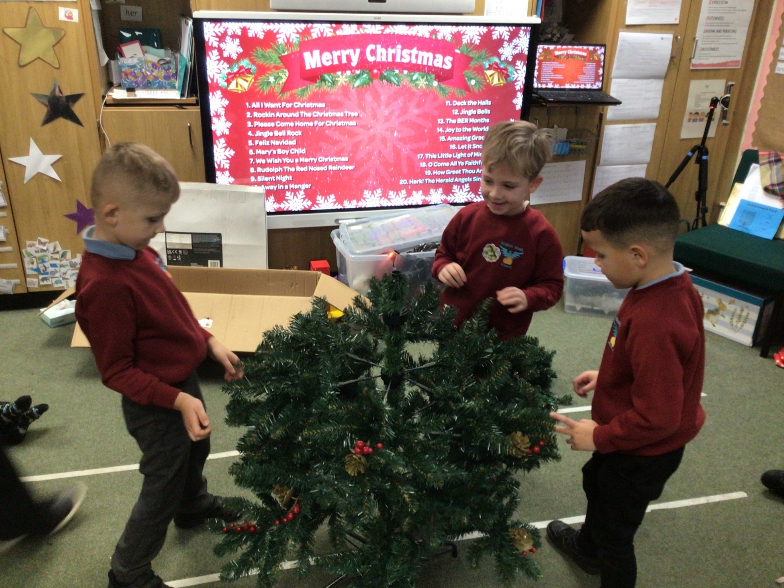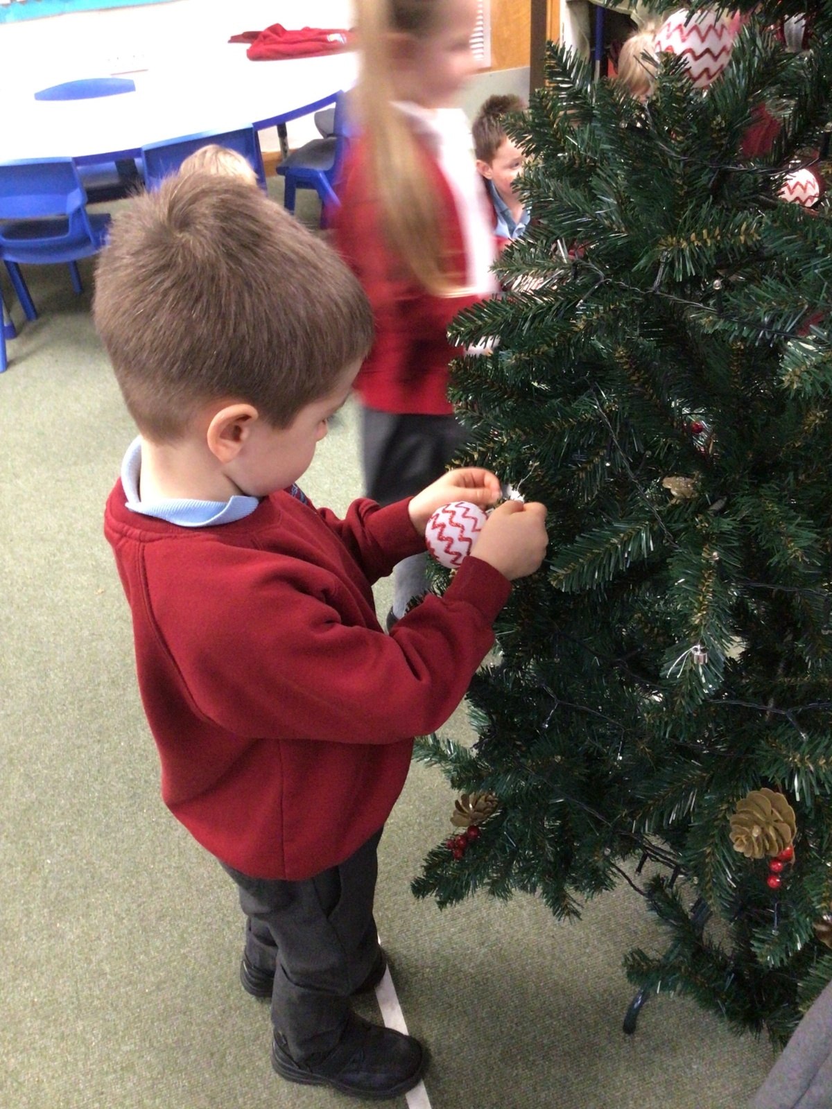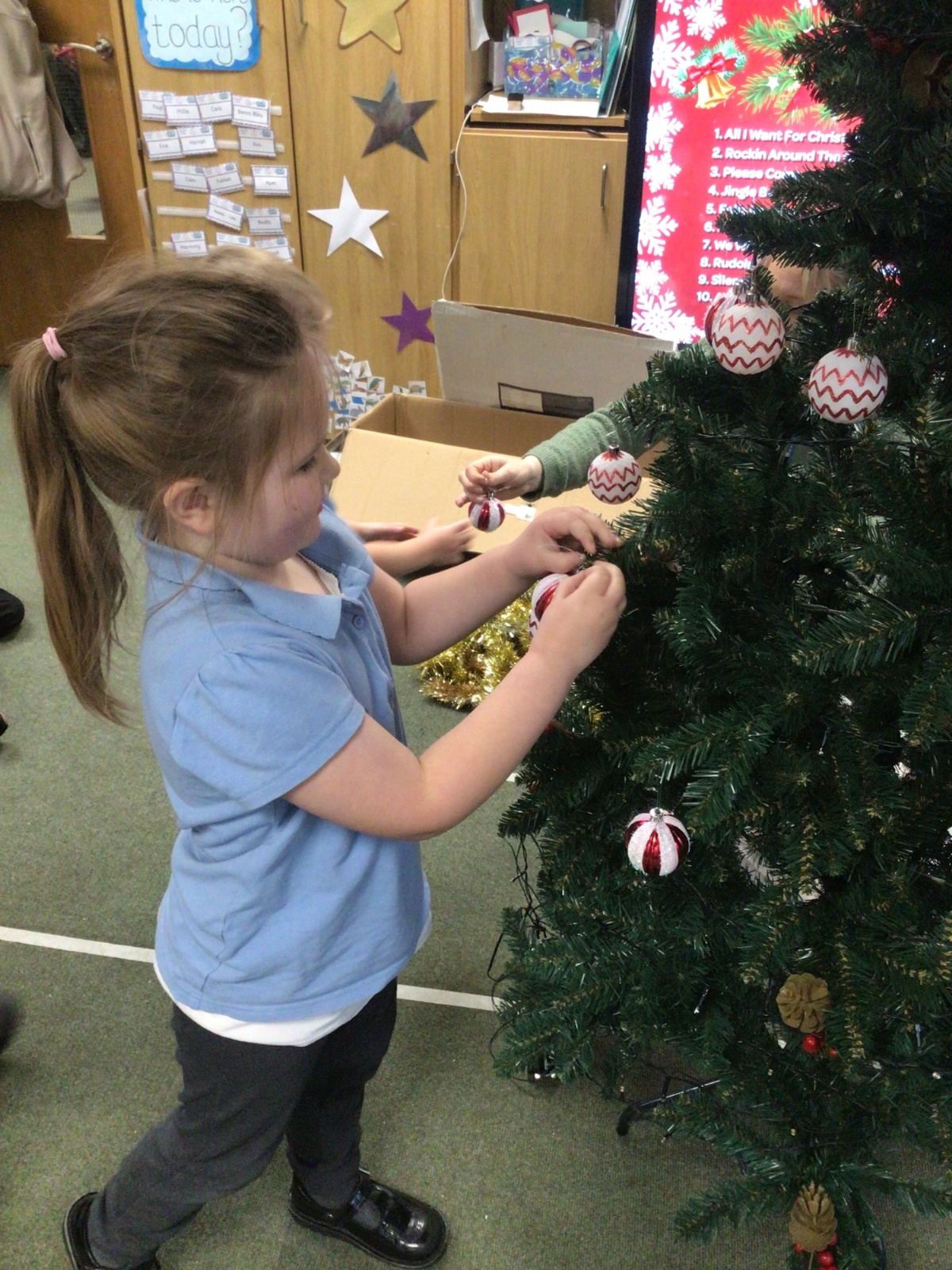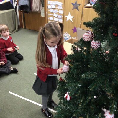 The children enjoyed decorating our class Christmas tree. They helped to build the tree, spread out the branches and put the lights, baubles and tinsel on. They were very proud of the end product!