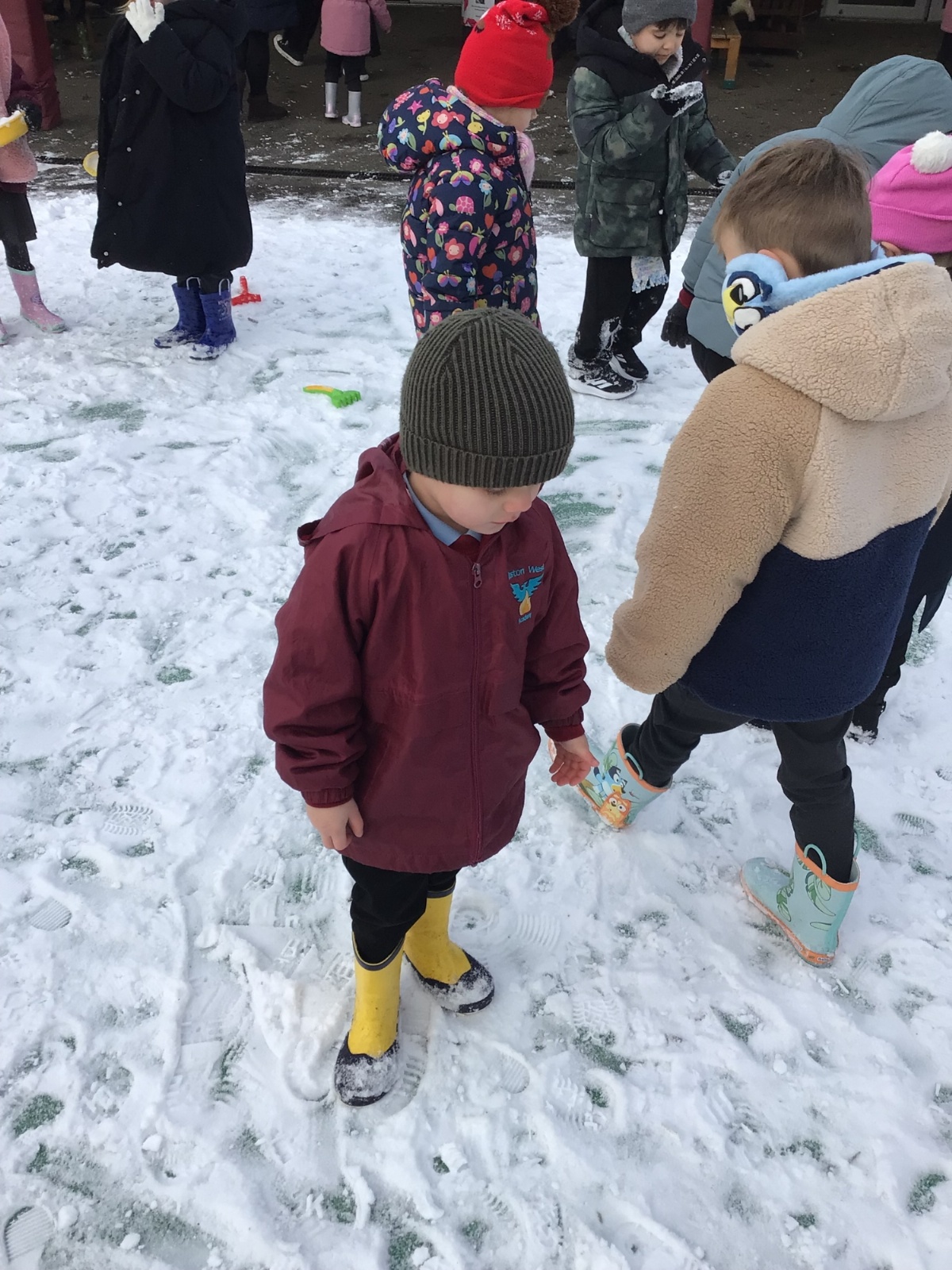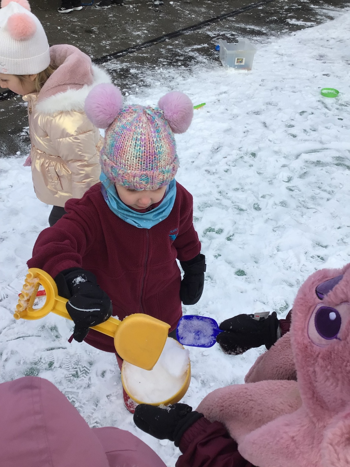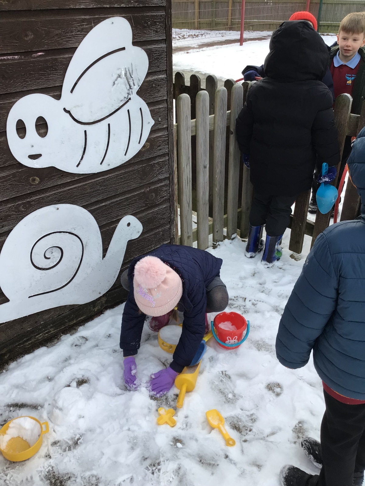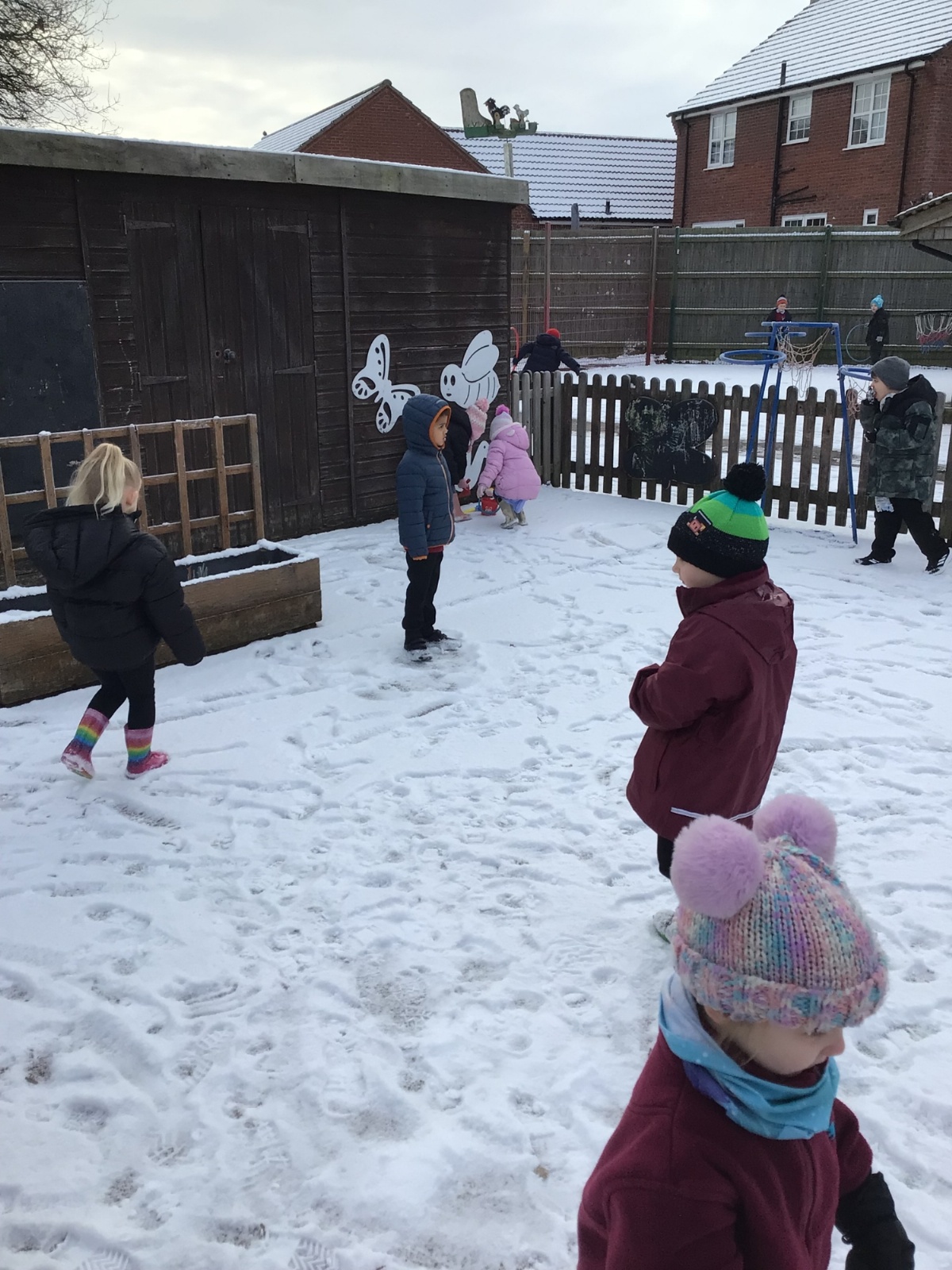 The children spent some time today exploring the snow within their school environment. This gave the children a hands-on opportunity to explore natural changes. We wrapped up well and went out to create shapes, footprints, marks, along with using equipment to build. The children worked individually or in teams to safely develop their physical skills while having fun. What a lovely way to start our new term.