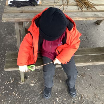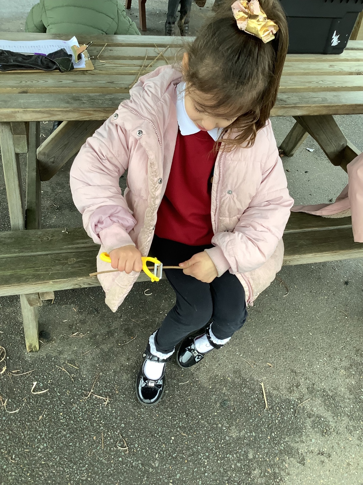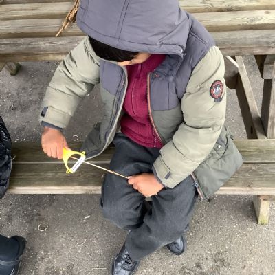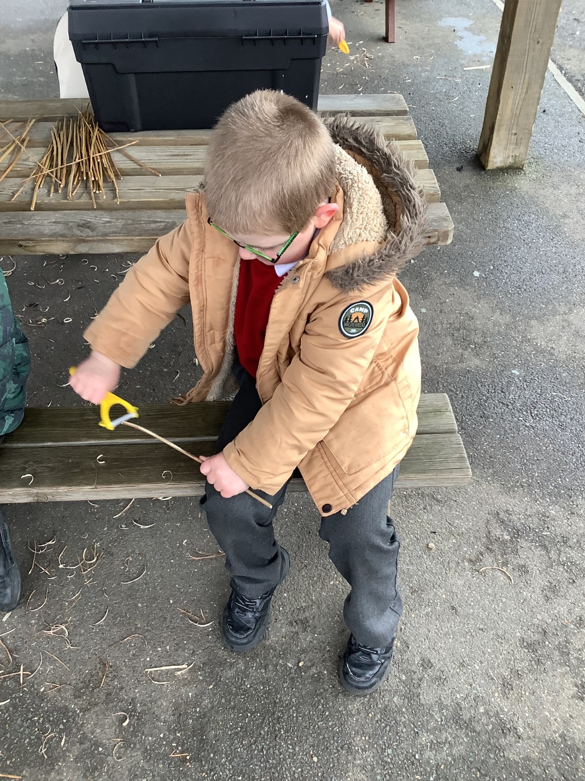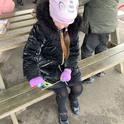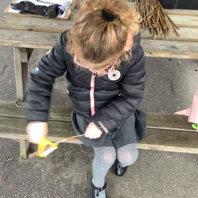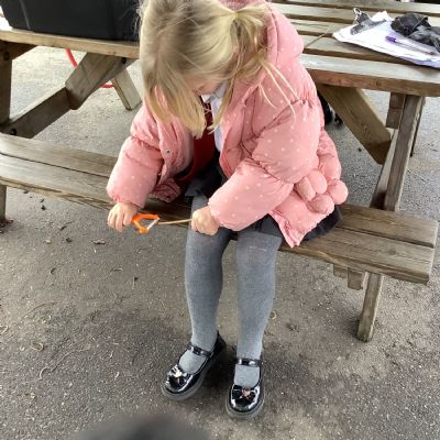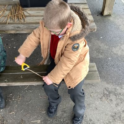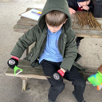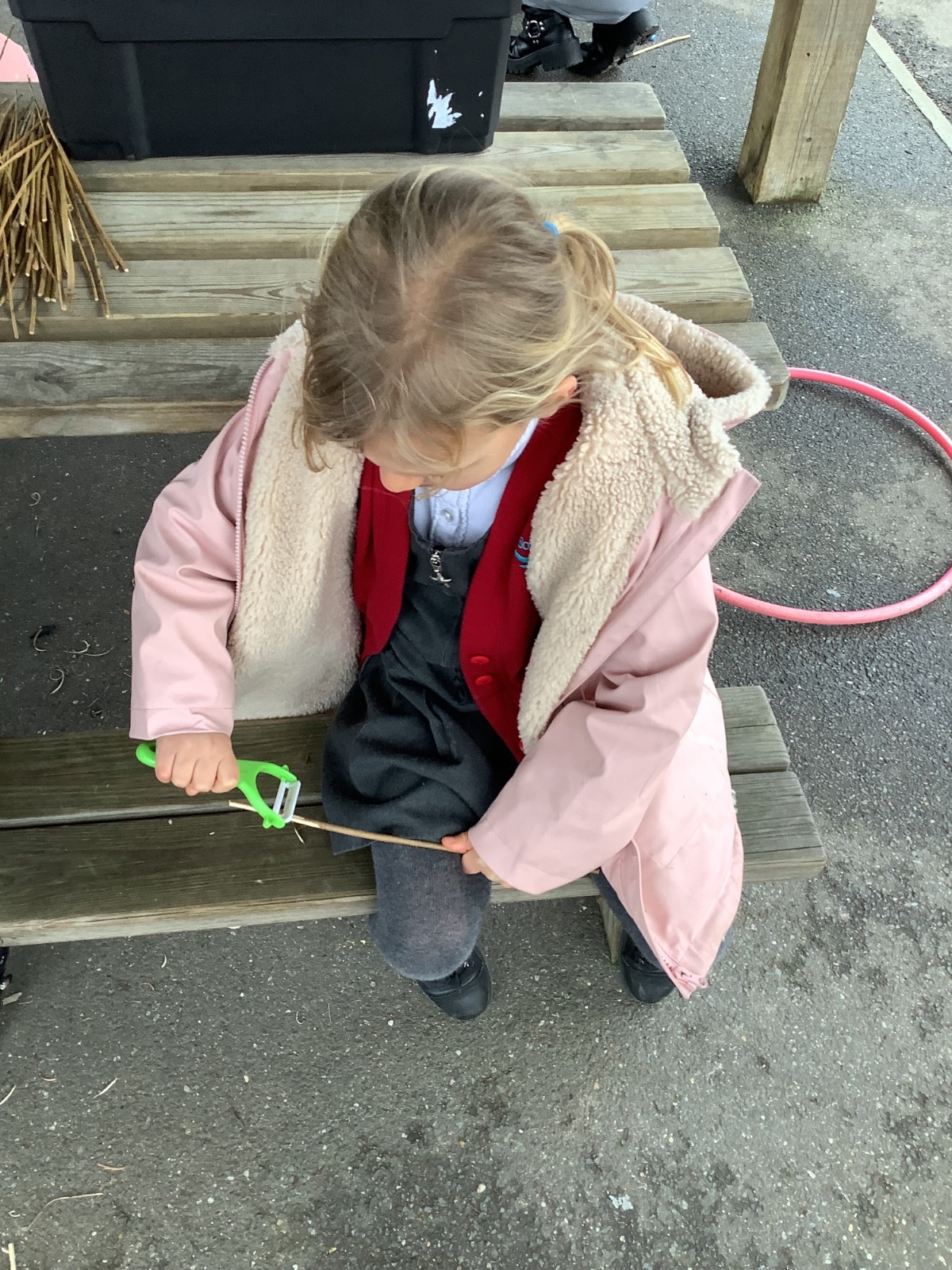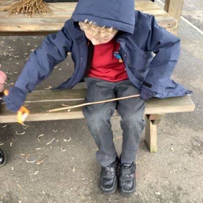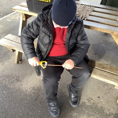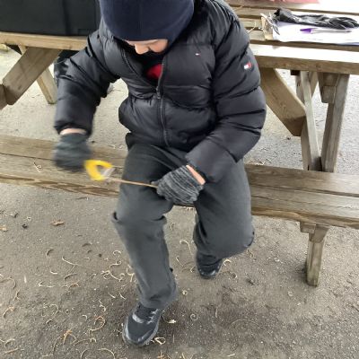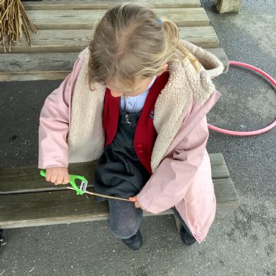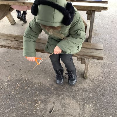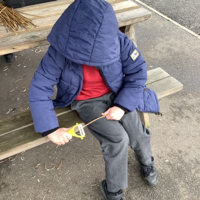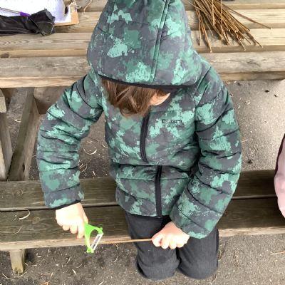 The children in Year 1 practised their whittling skills, using a vegetable peeler to scrape off the bark on a willow stick. They were very careful and listened to advice given on how to improve their technique.