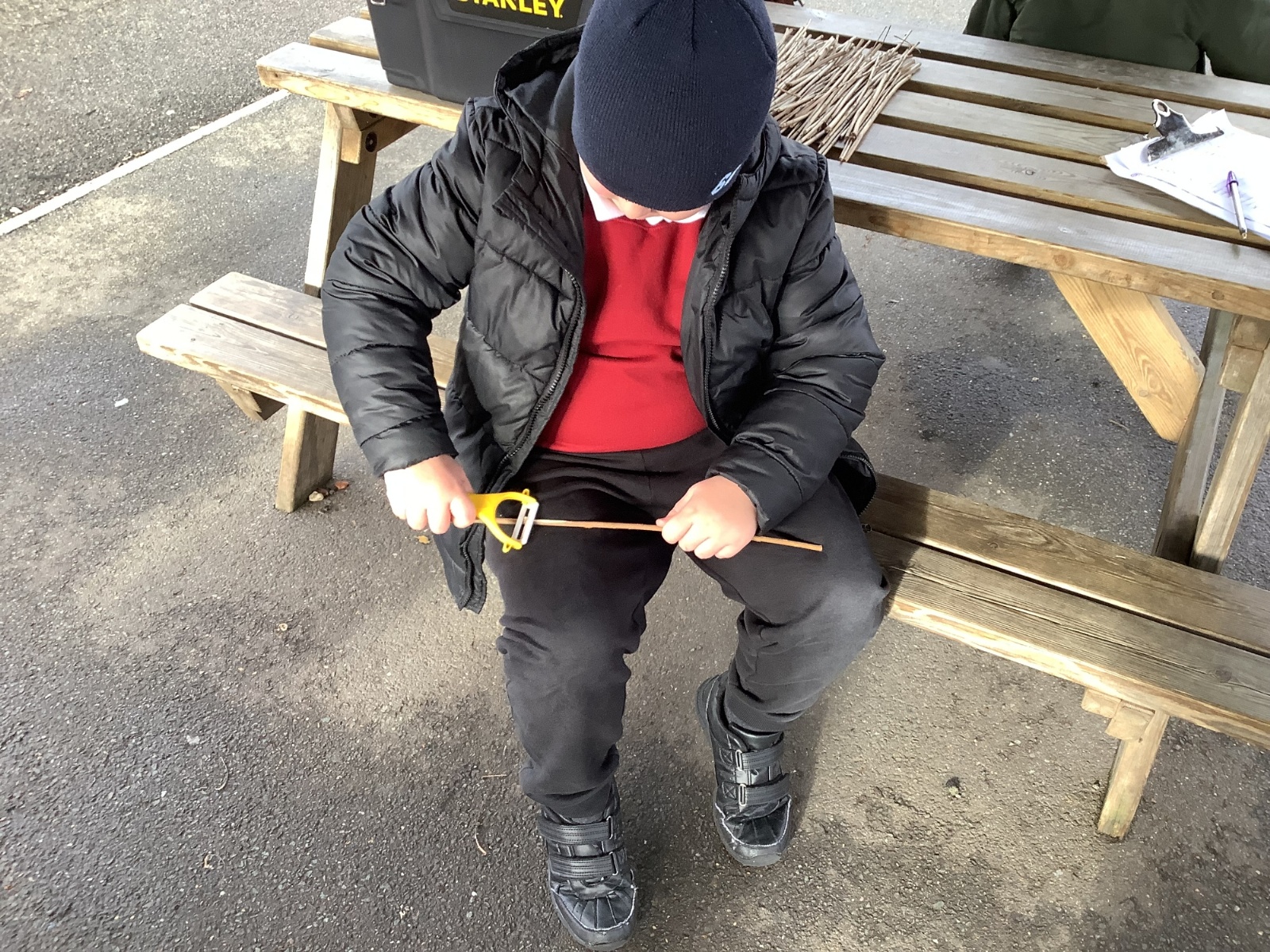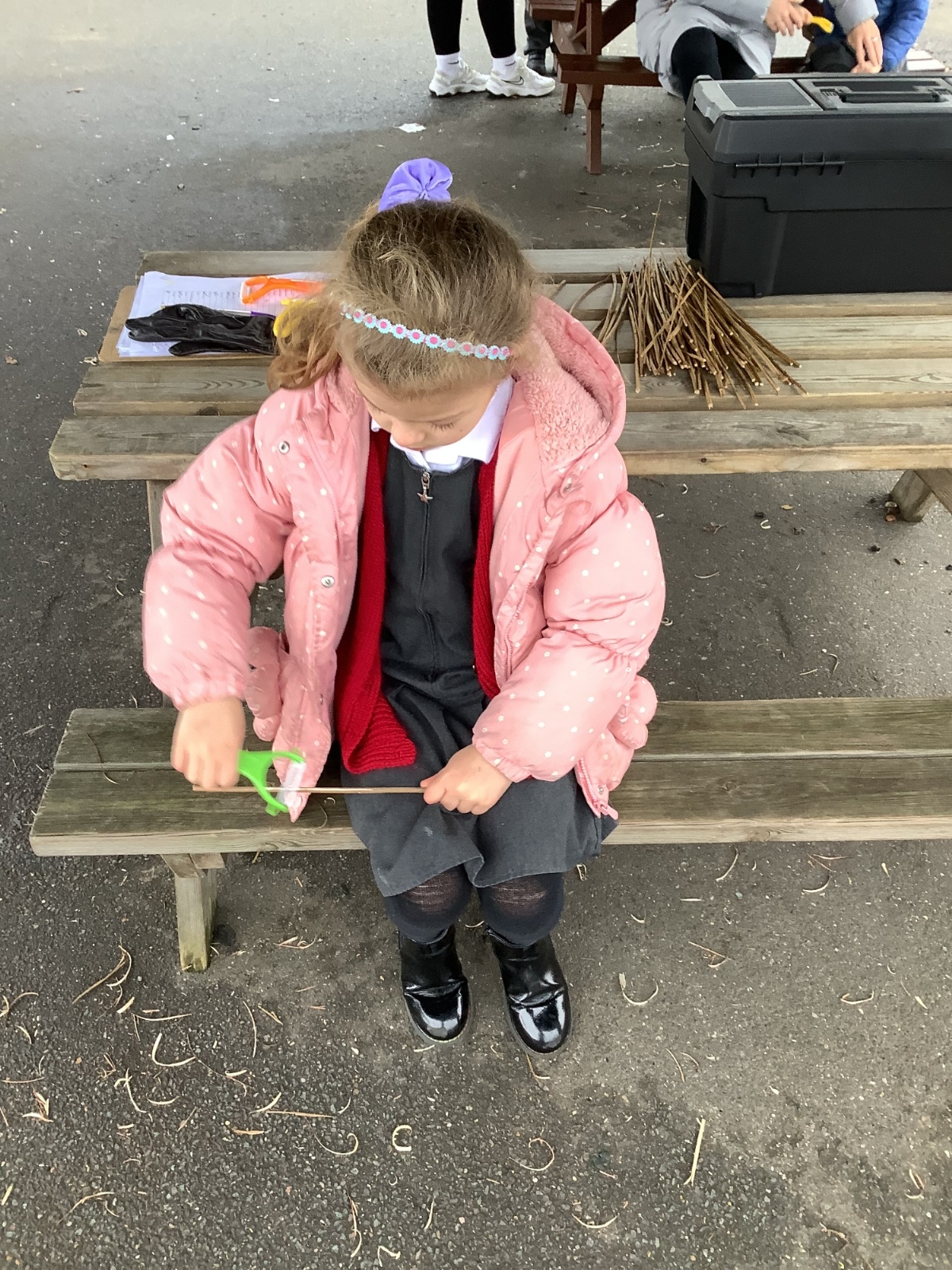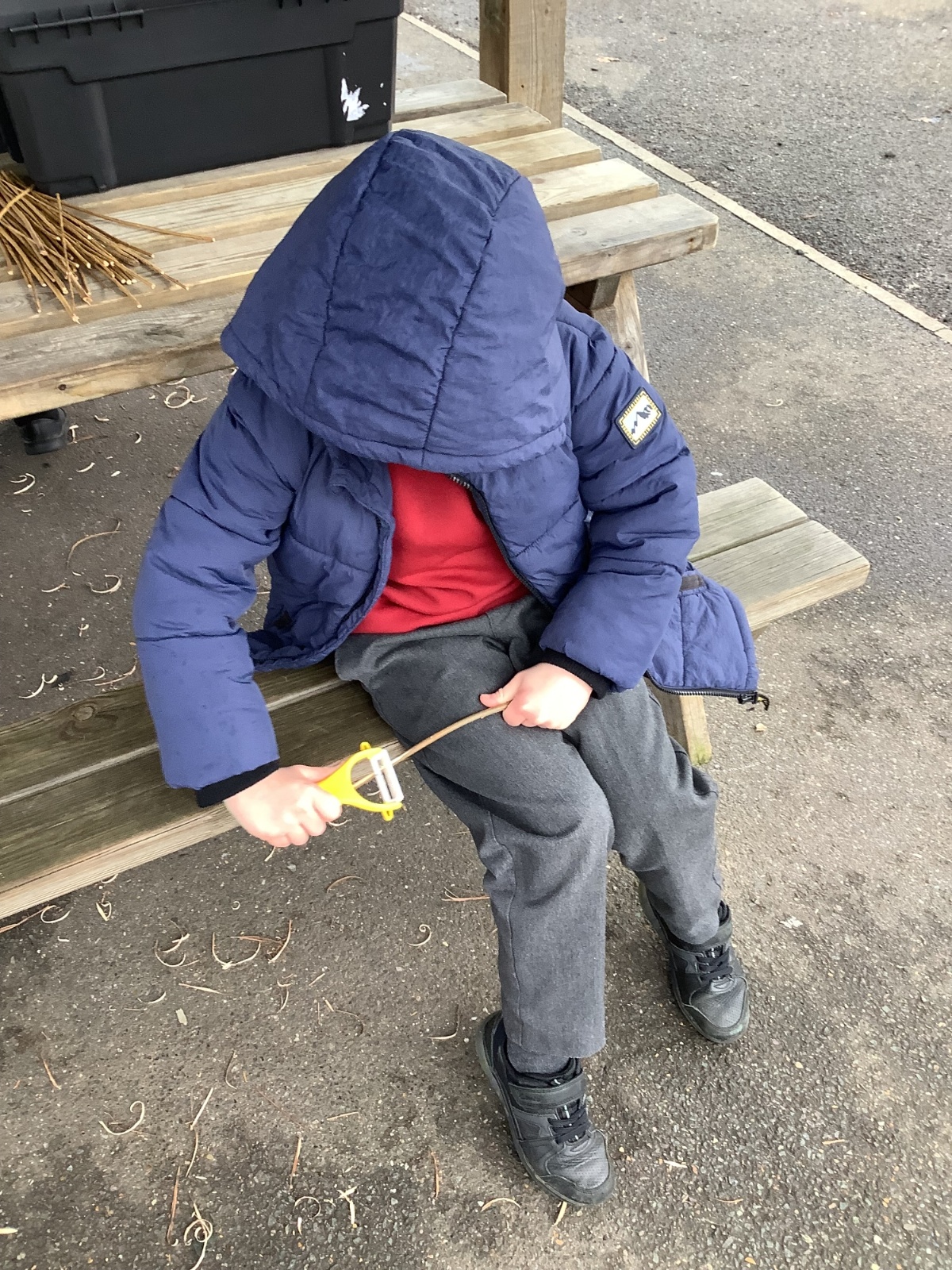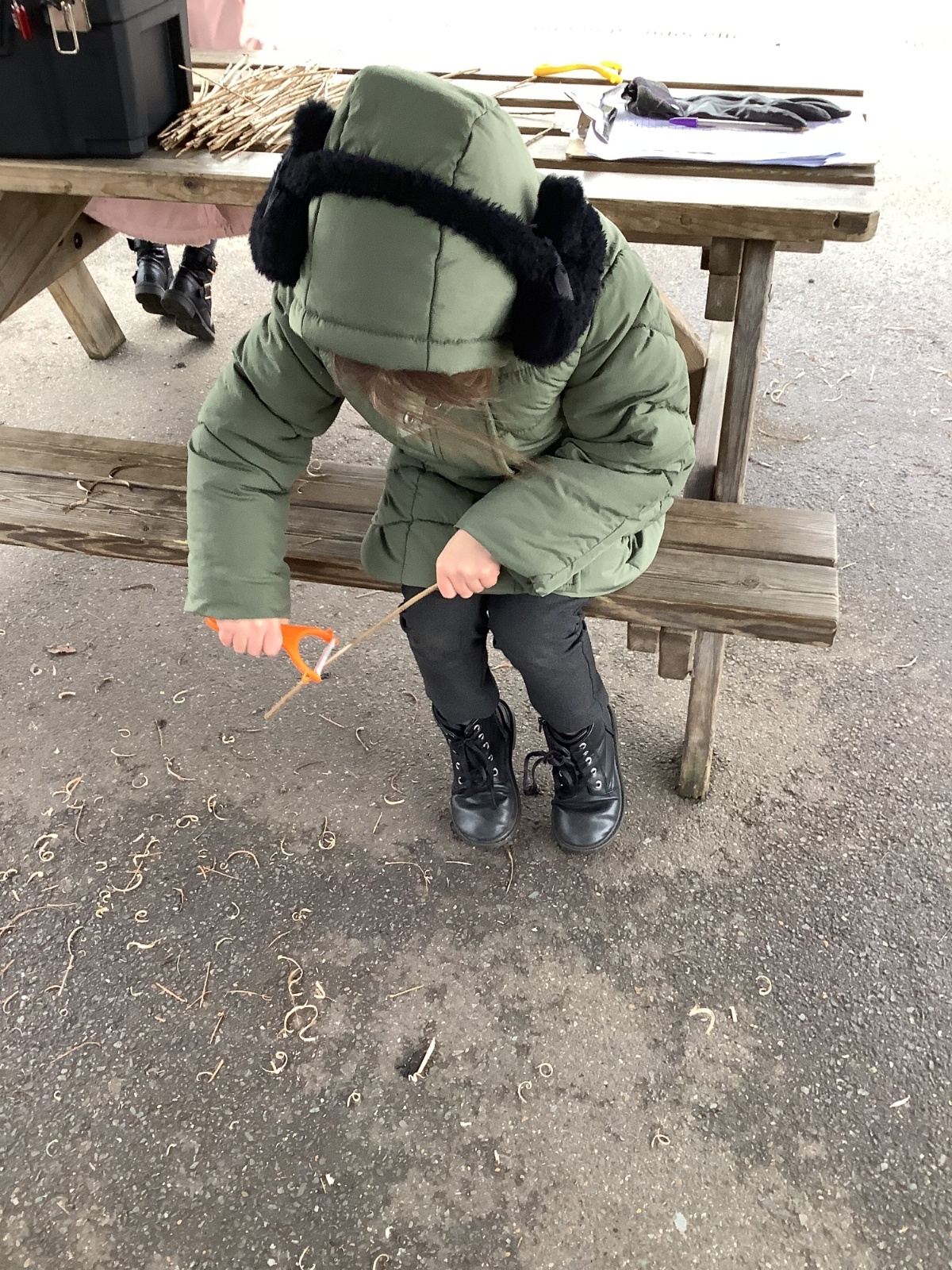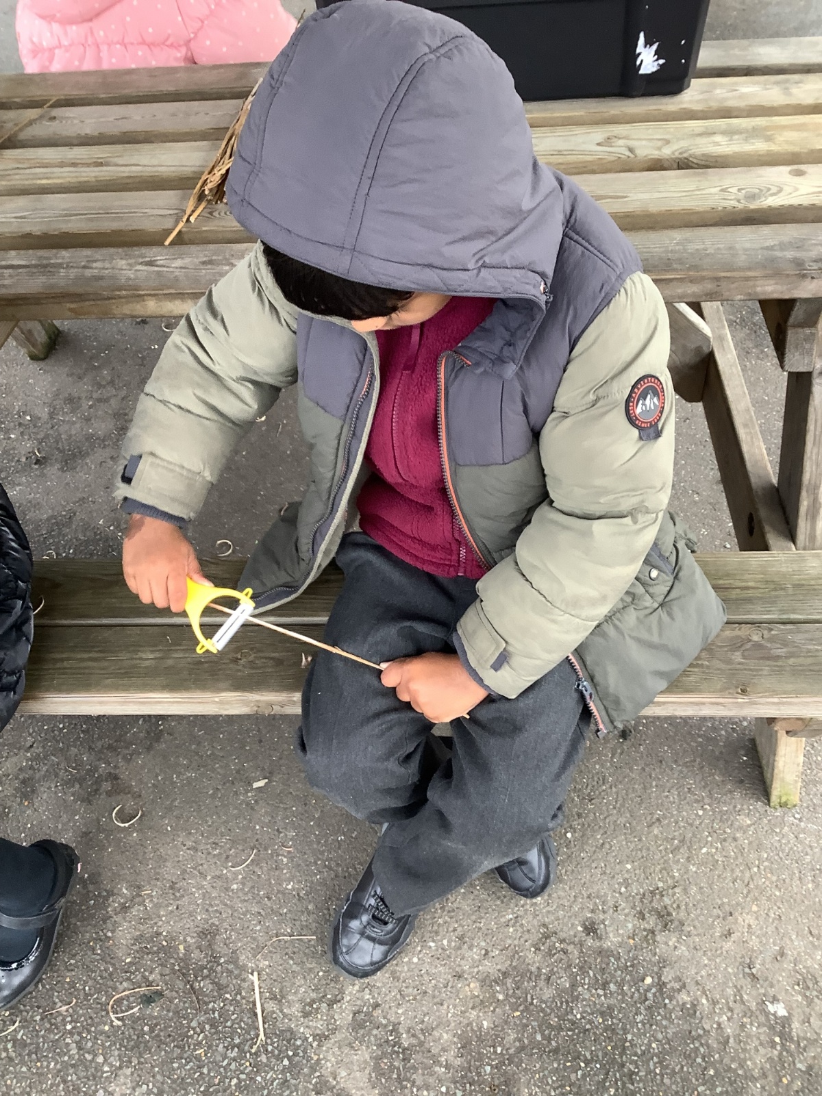The children in Year 1 practised their whittling skills, using a vegetable peeler to scrape off the bark on a willow stick. They were very careful and listened to advice given on how to improve their technique.