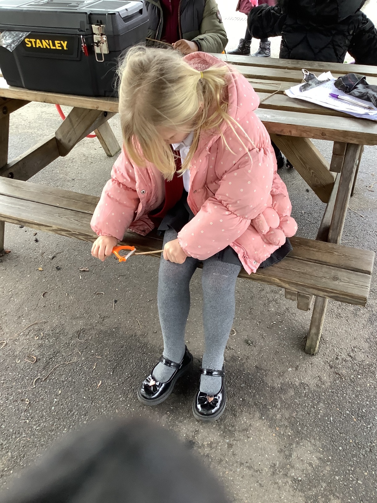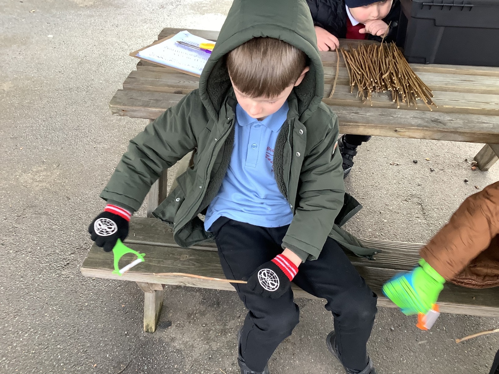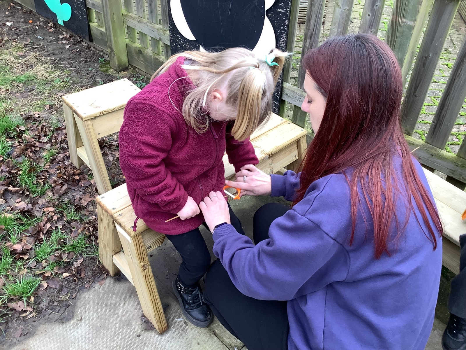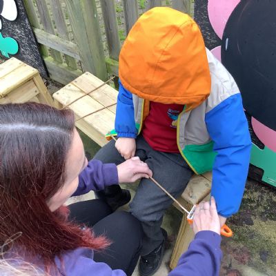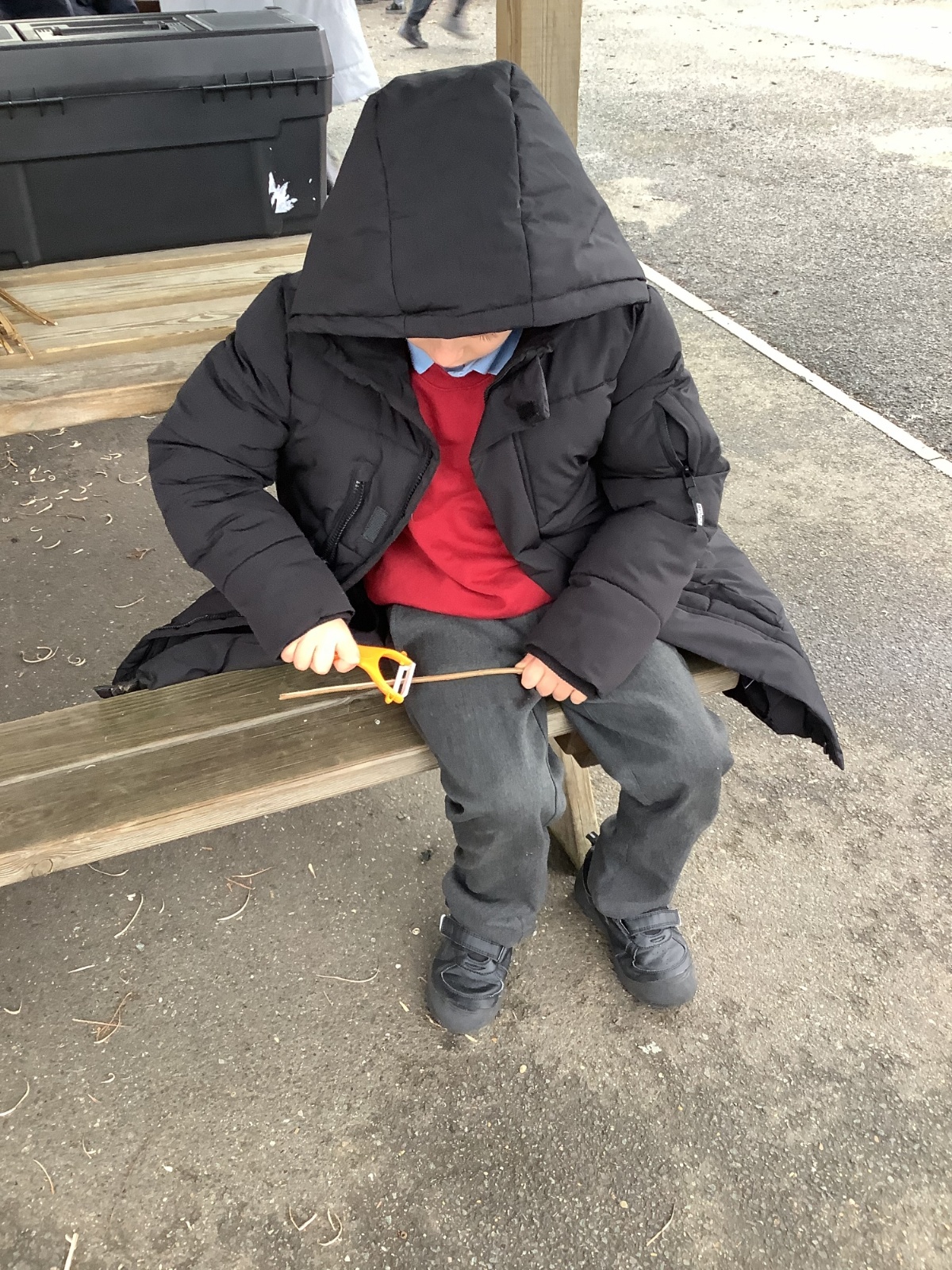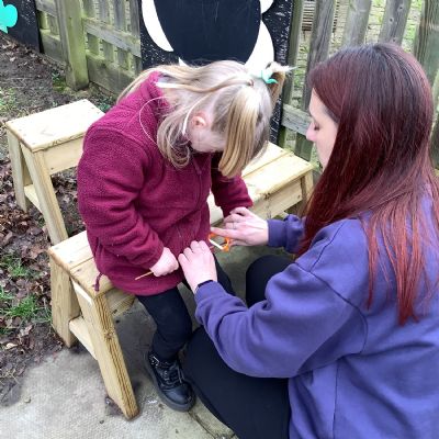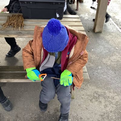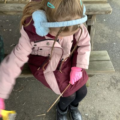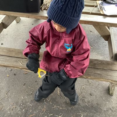 The children in Year 1 practised their whittling skills, using a vegetable peeler to scrape off the bark on a willow stick. They were very careful and listened to advice given on how to improve their technique.