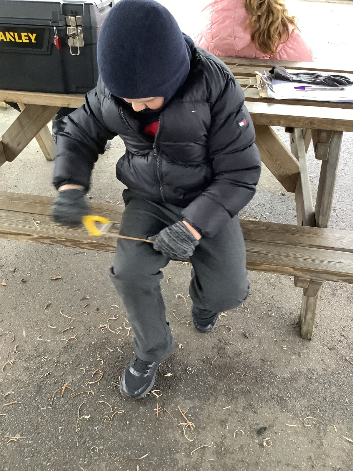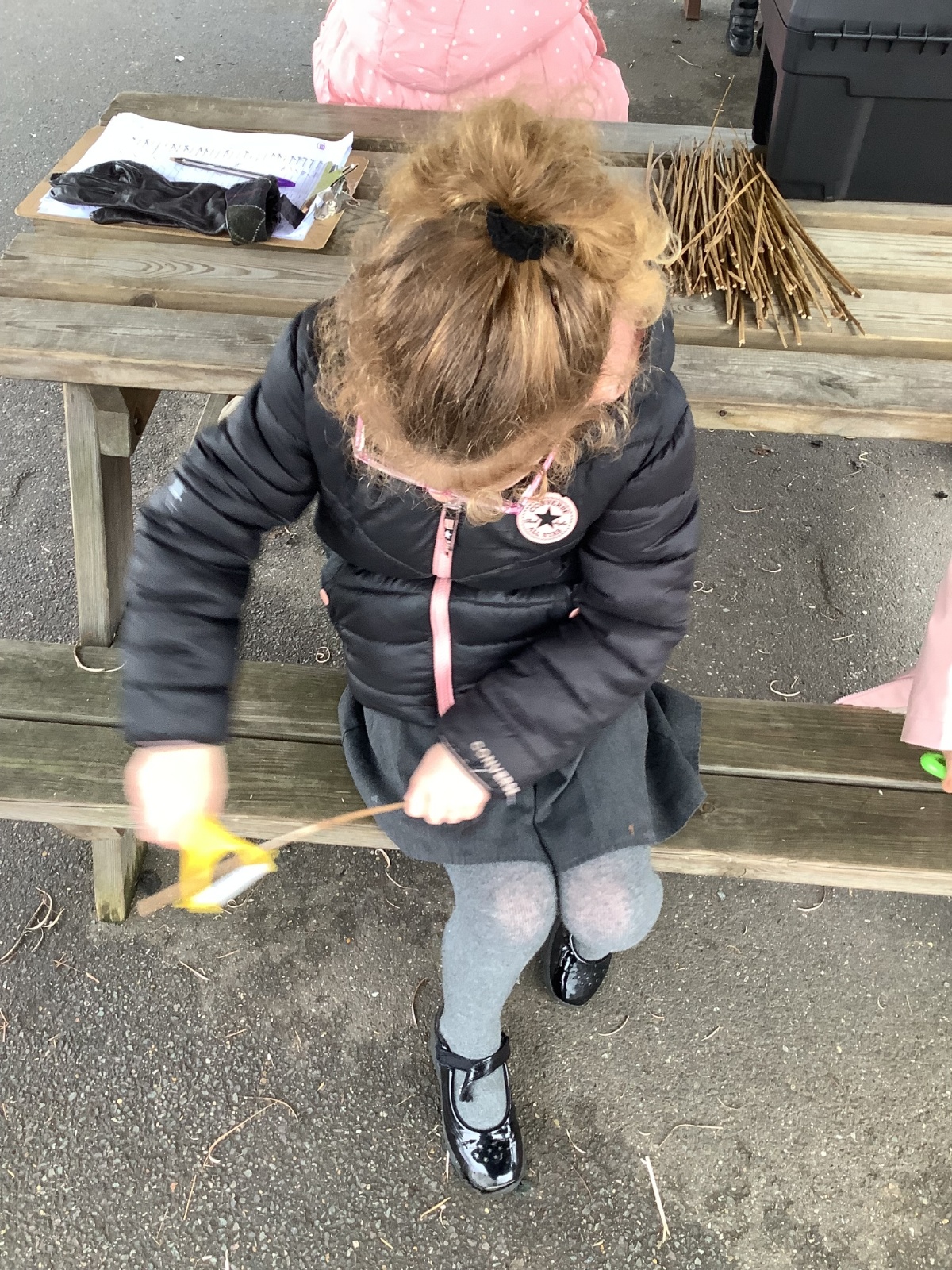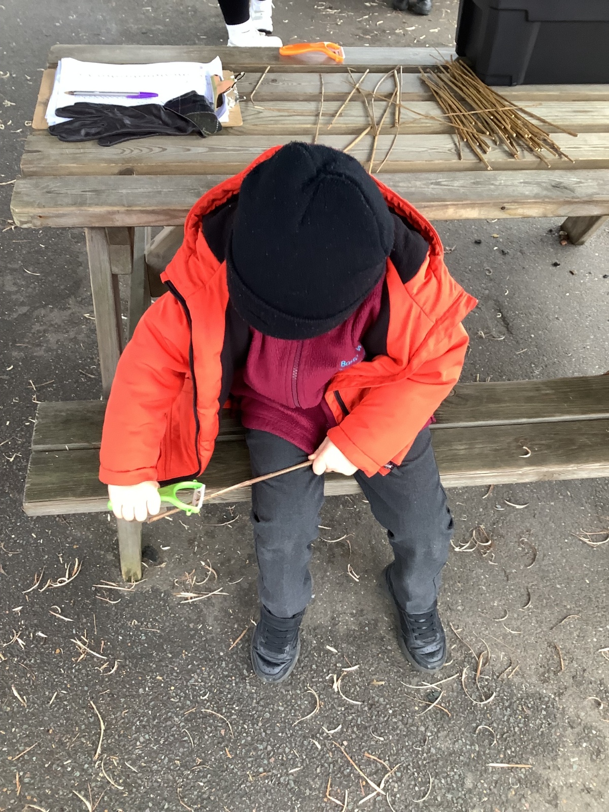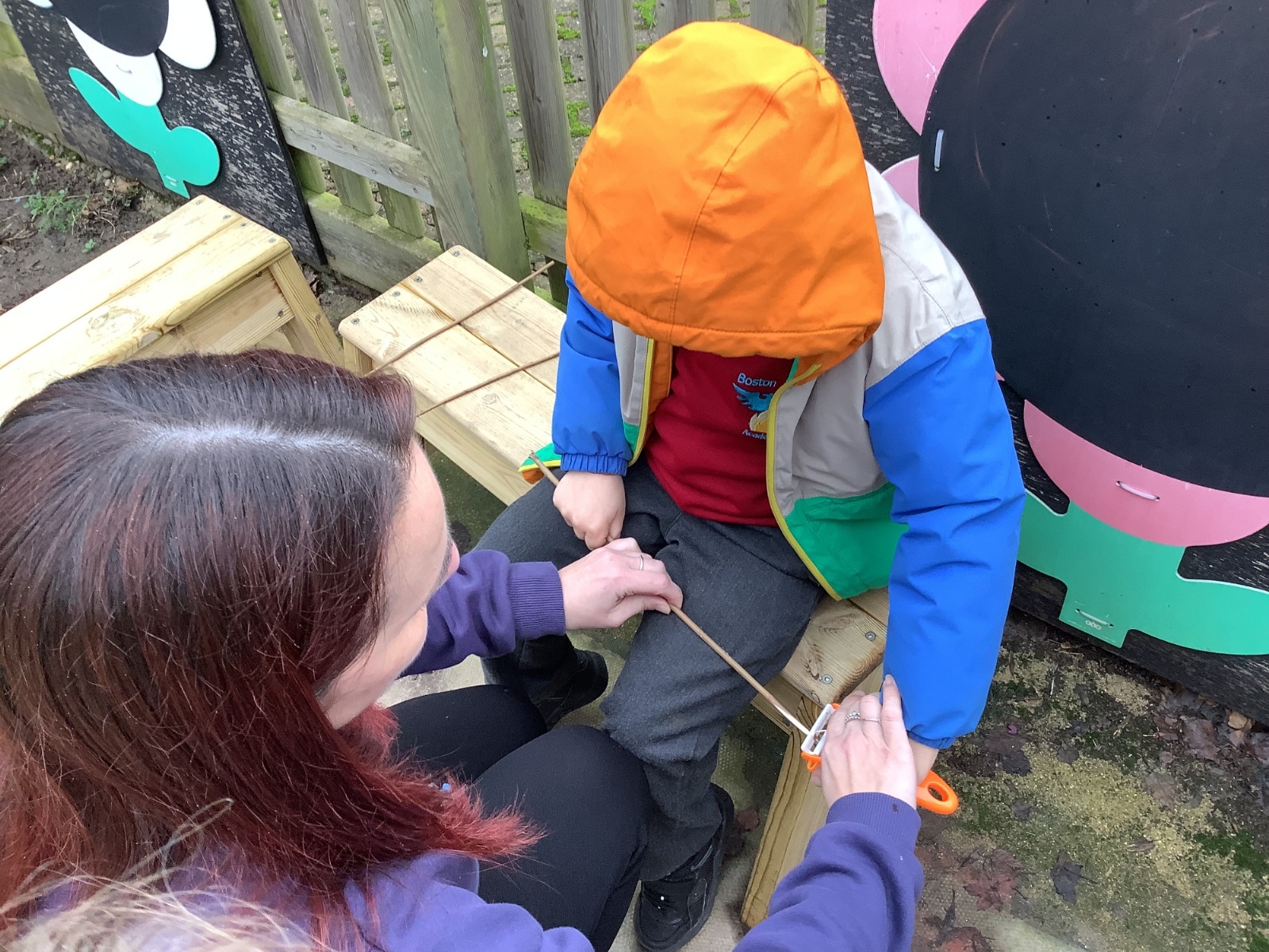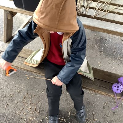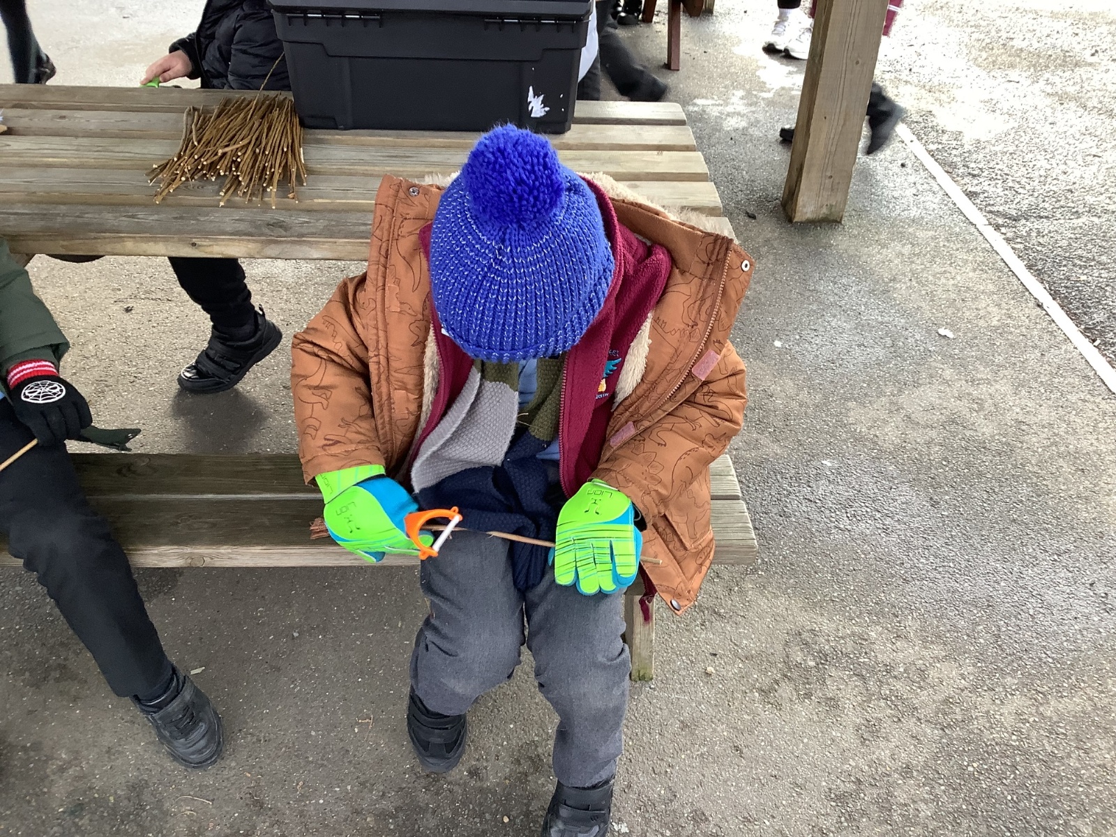 The children in Year 1 practised their whittling skills, using a vegetable peeler to scrape off the bark on a willow stick. They were very careful and listened to advice given on how to improve their technique.