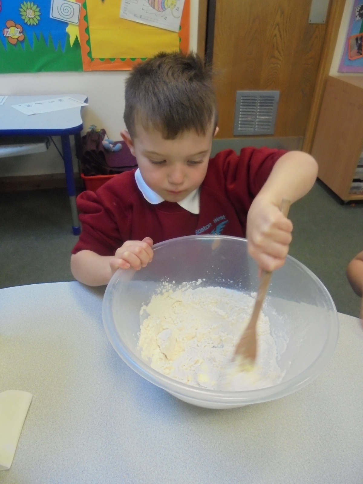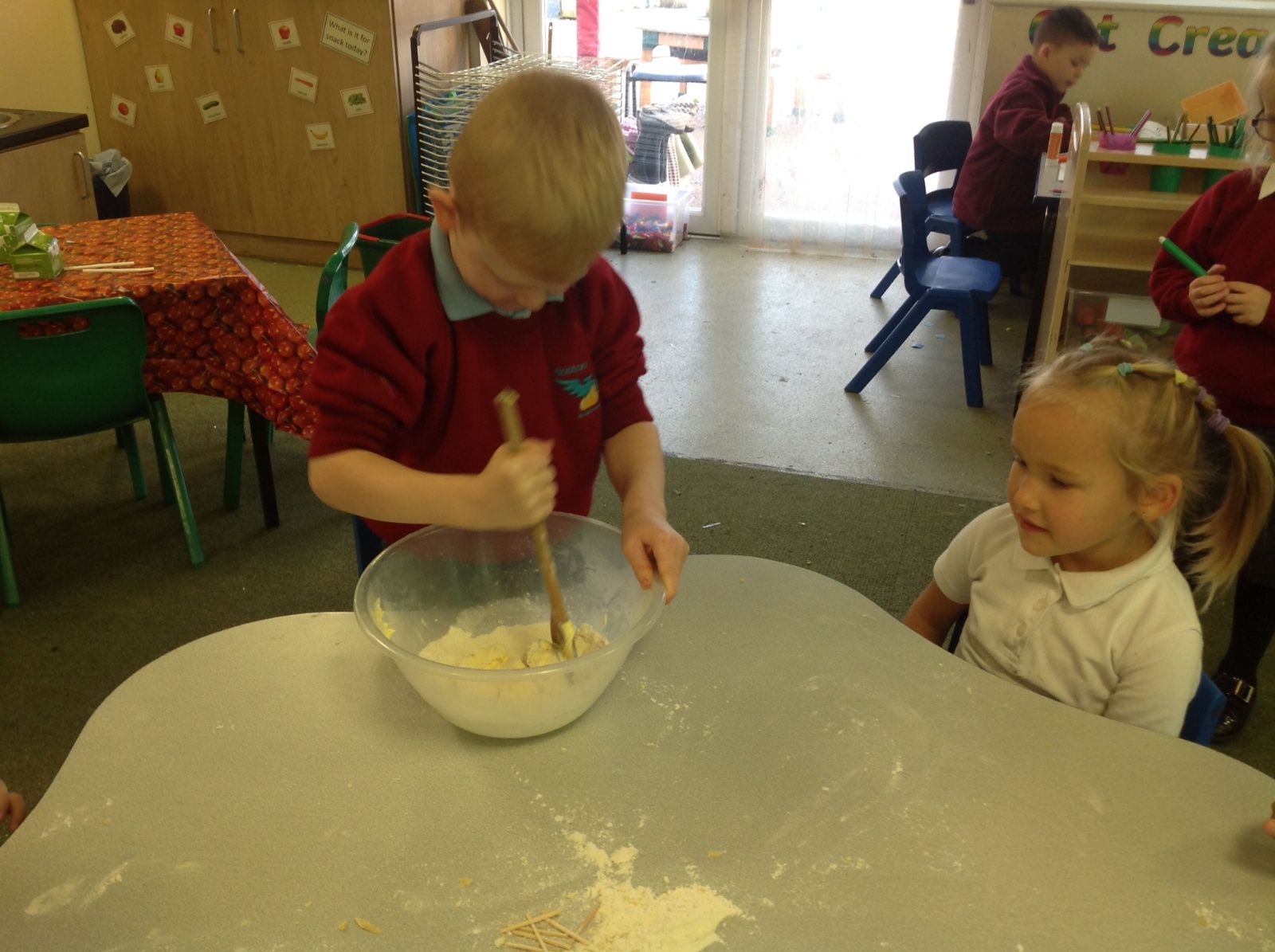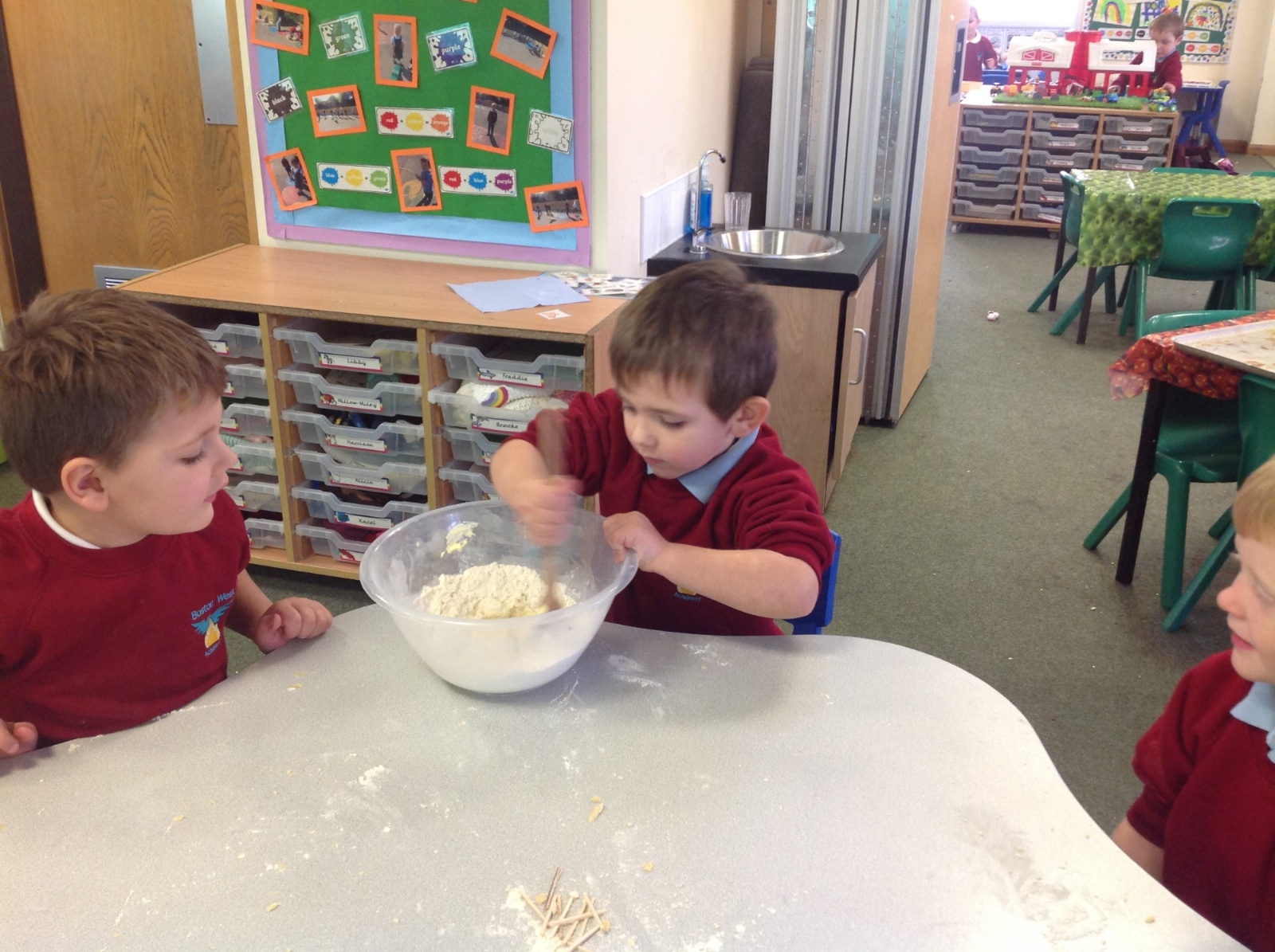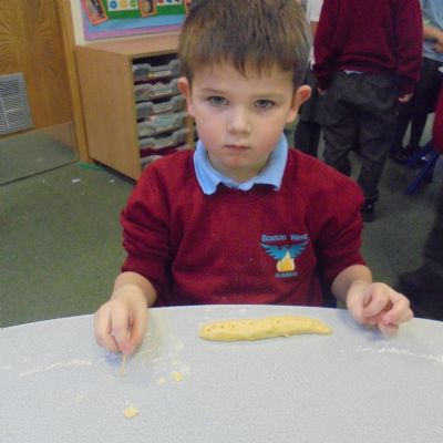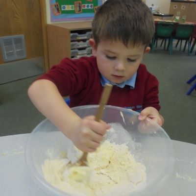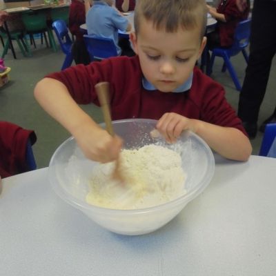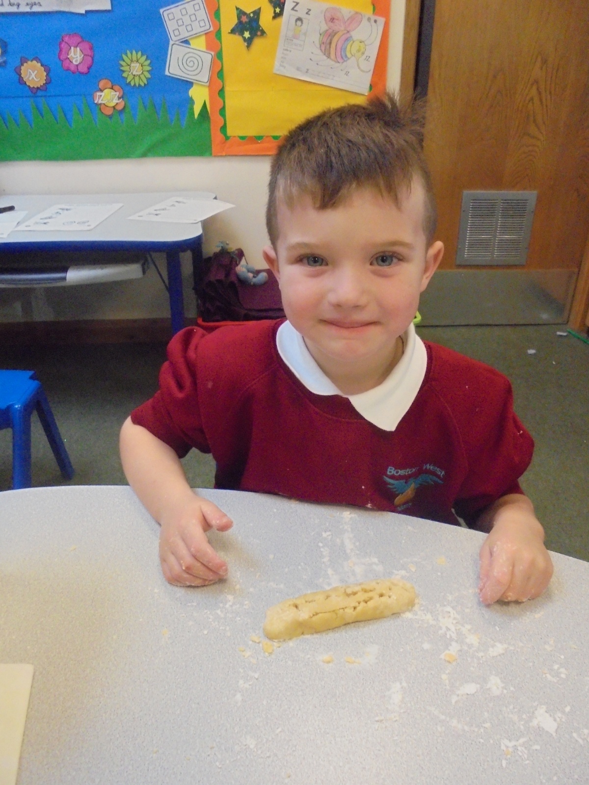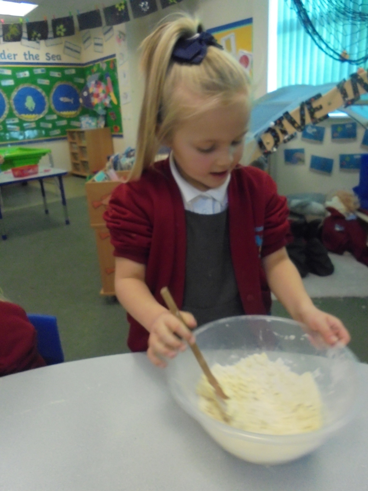 As part of our topic about jungle animals this week, we made some delicious snake biscuits using three ingredients: flour, sugar and butter. We had lots of fun mixing them together and shaping the dough into a snake shape, but best of all we enjoyed eating them!