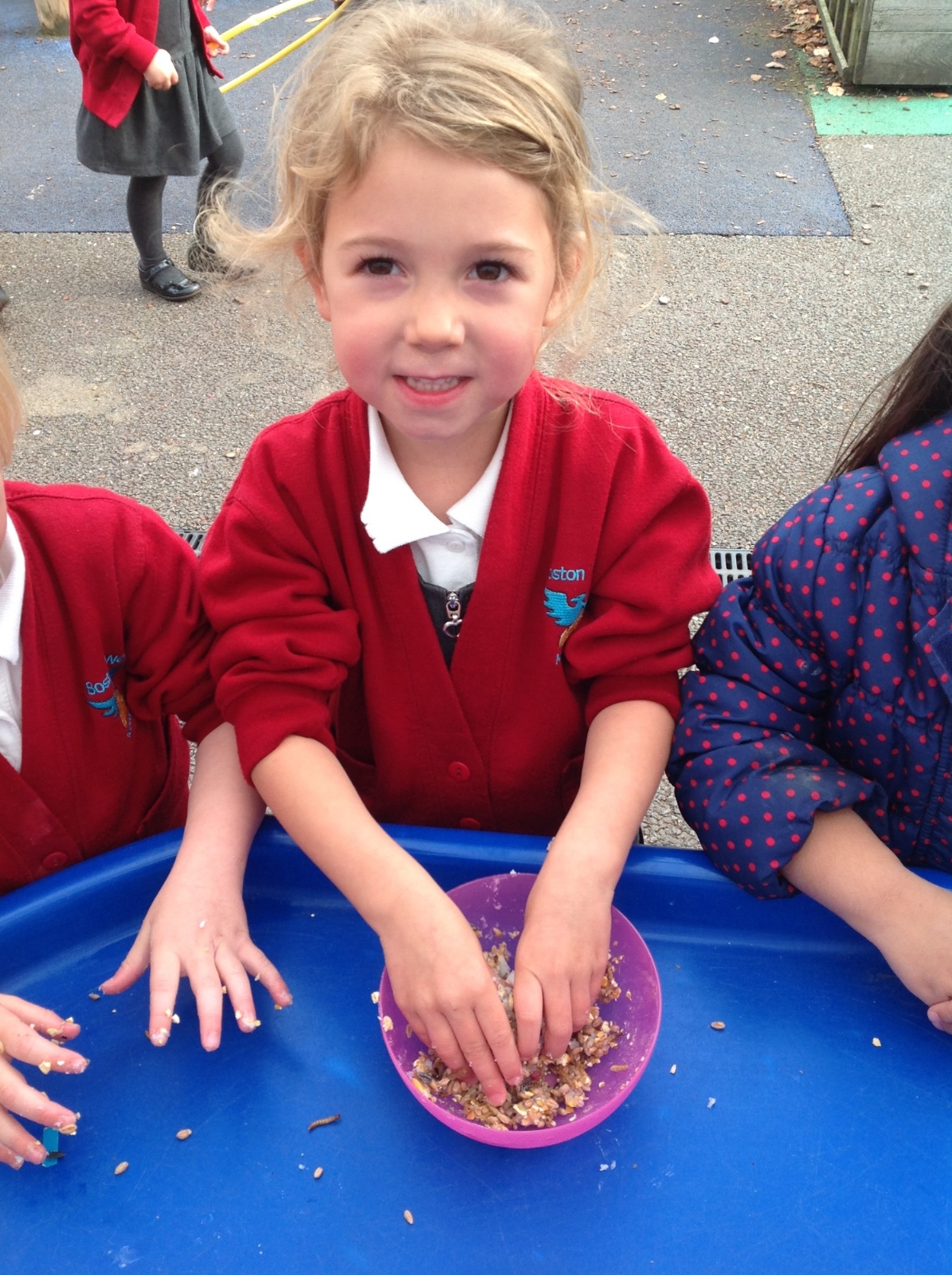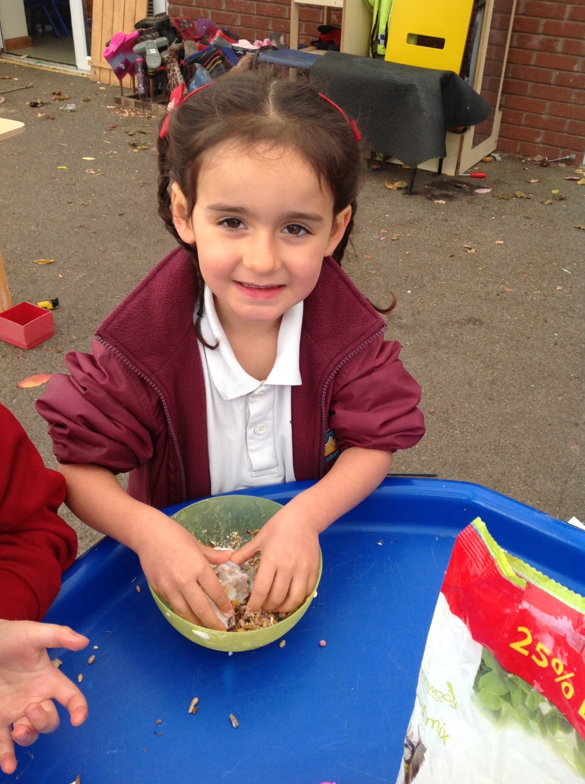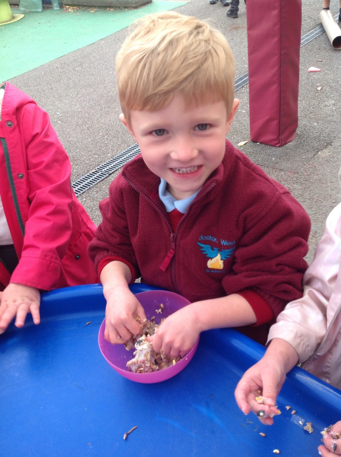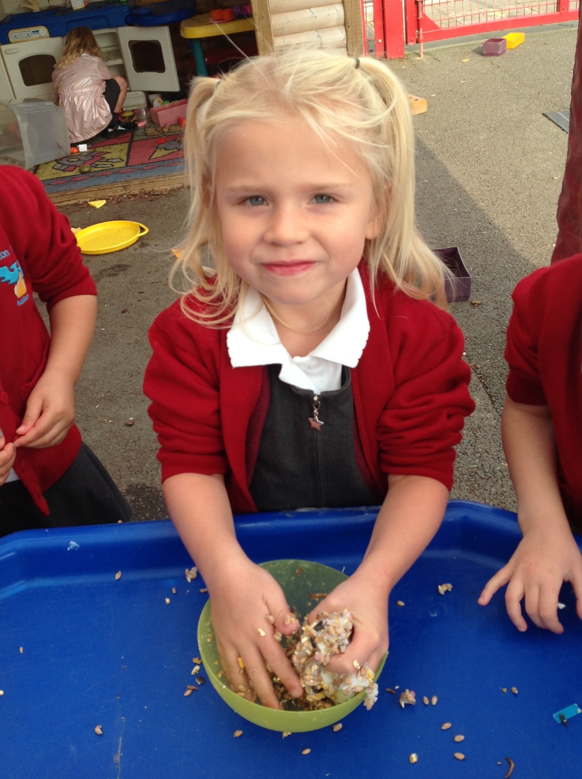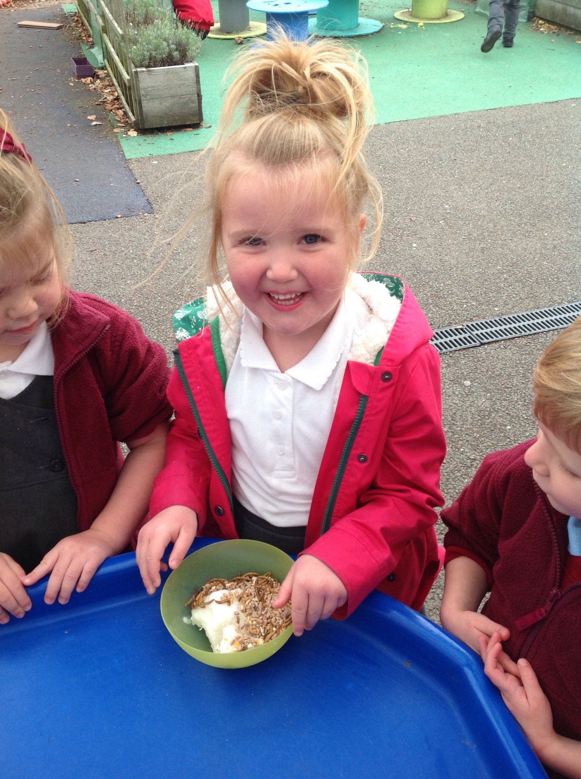 The children enjoyed learning about wildlife in the Autumn time and had great fun making bird feeders, mixing lard with bird seed and dried mealworms.