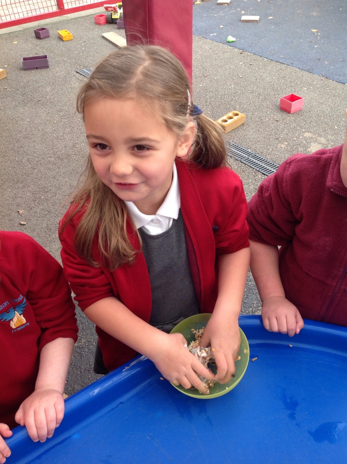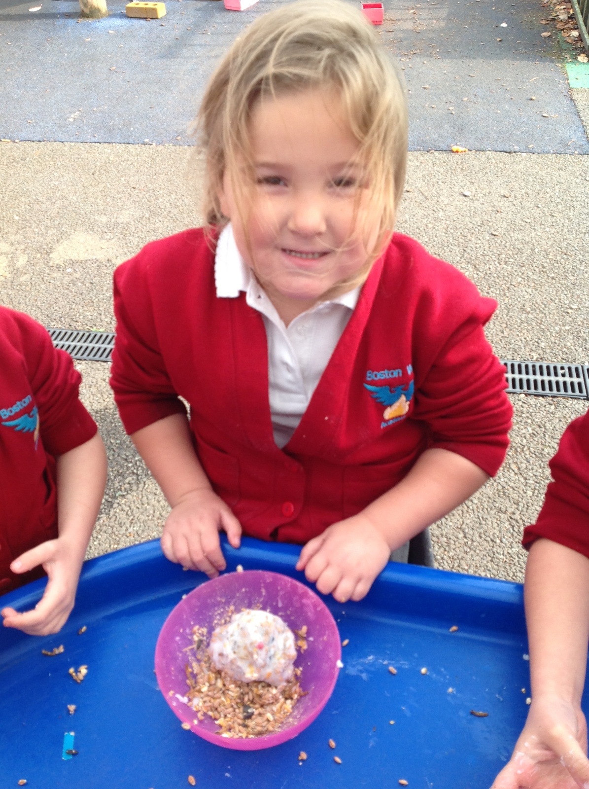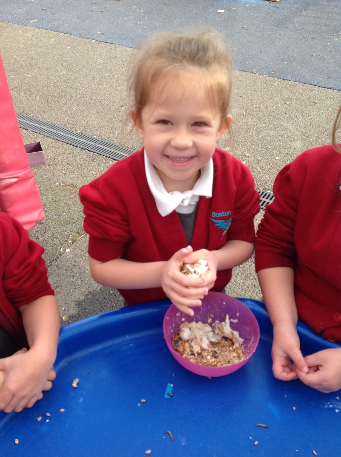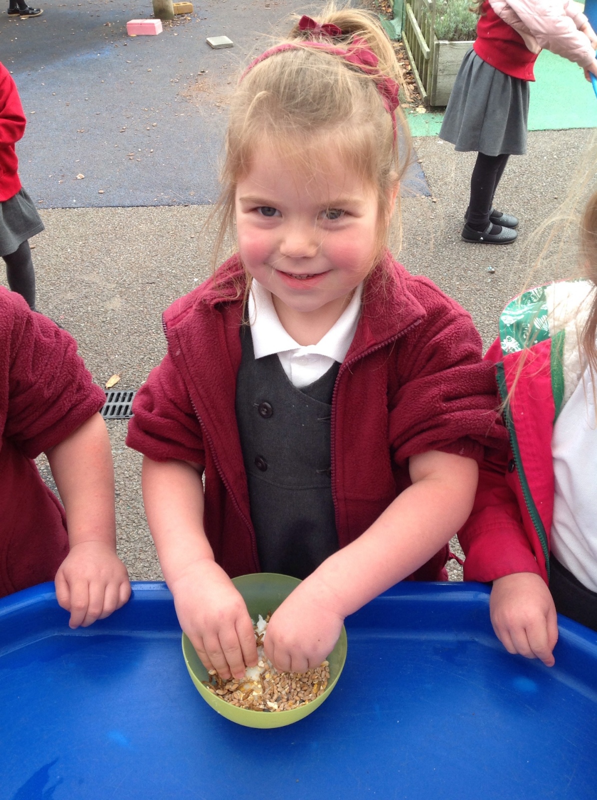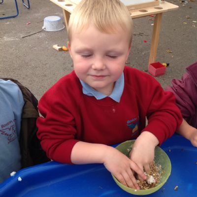 The children enjoyed learning about wildlife in the Autumn time and had great fun making bird feeders, mixing lard with bird seed and dried mealworms.
