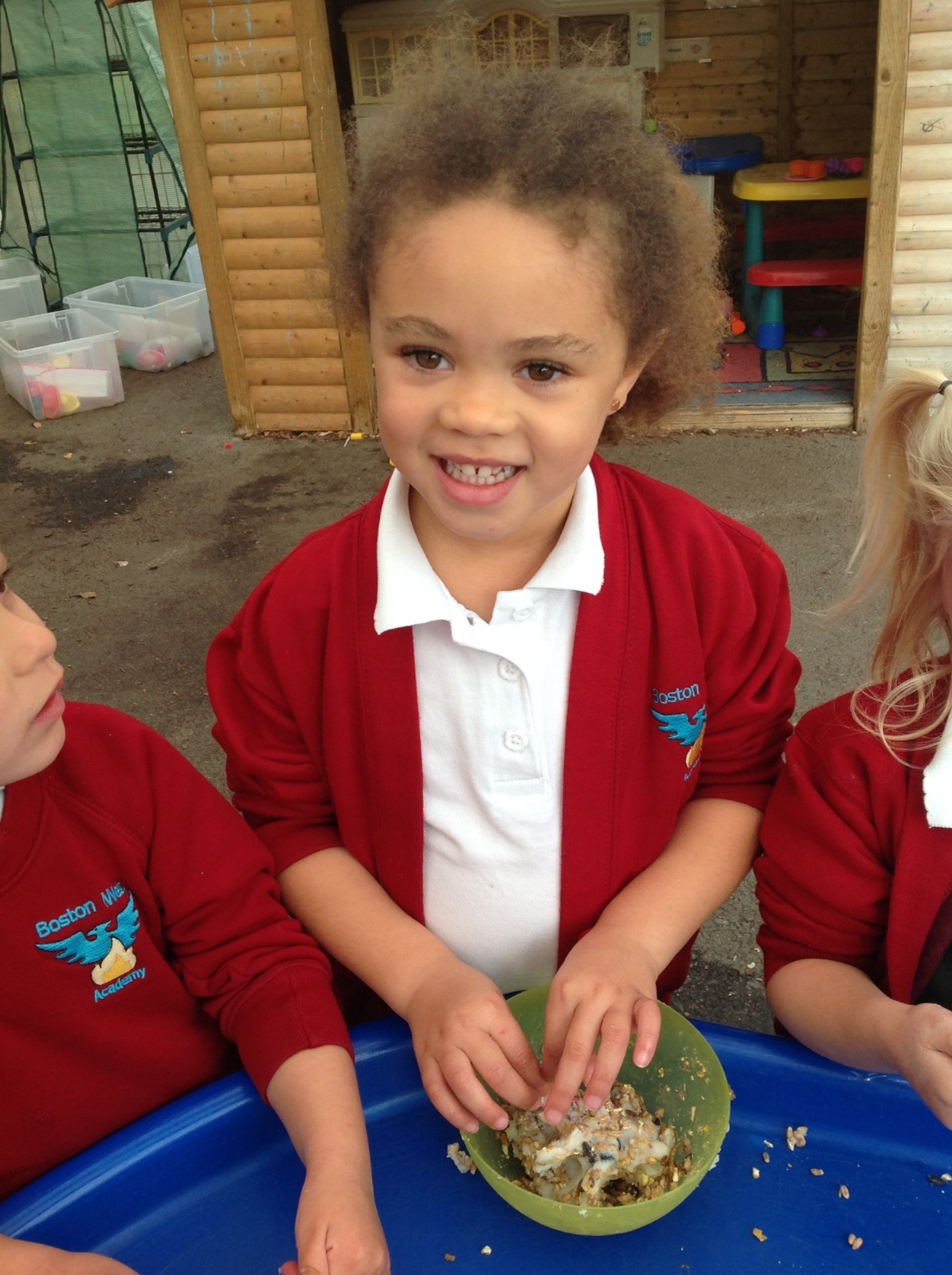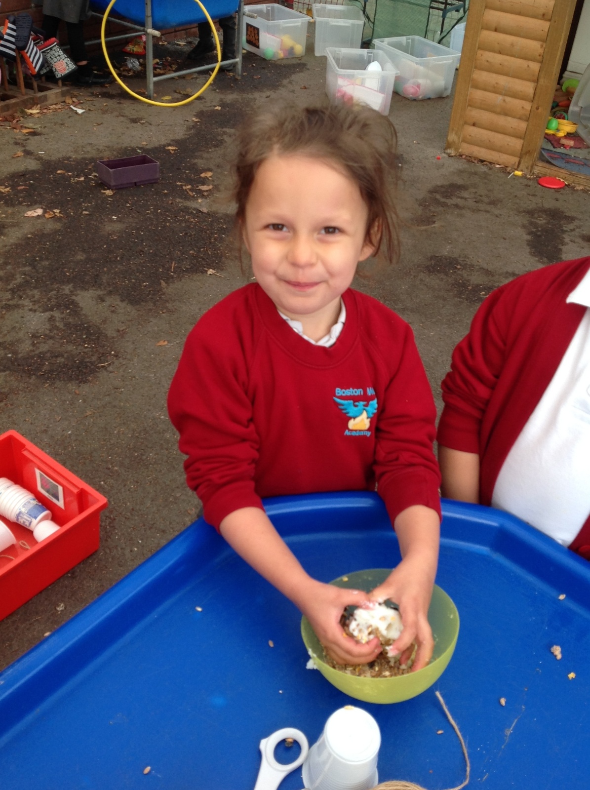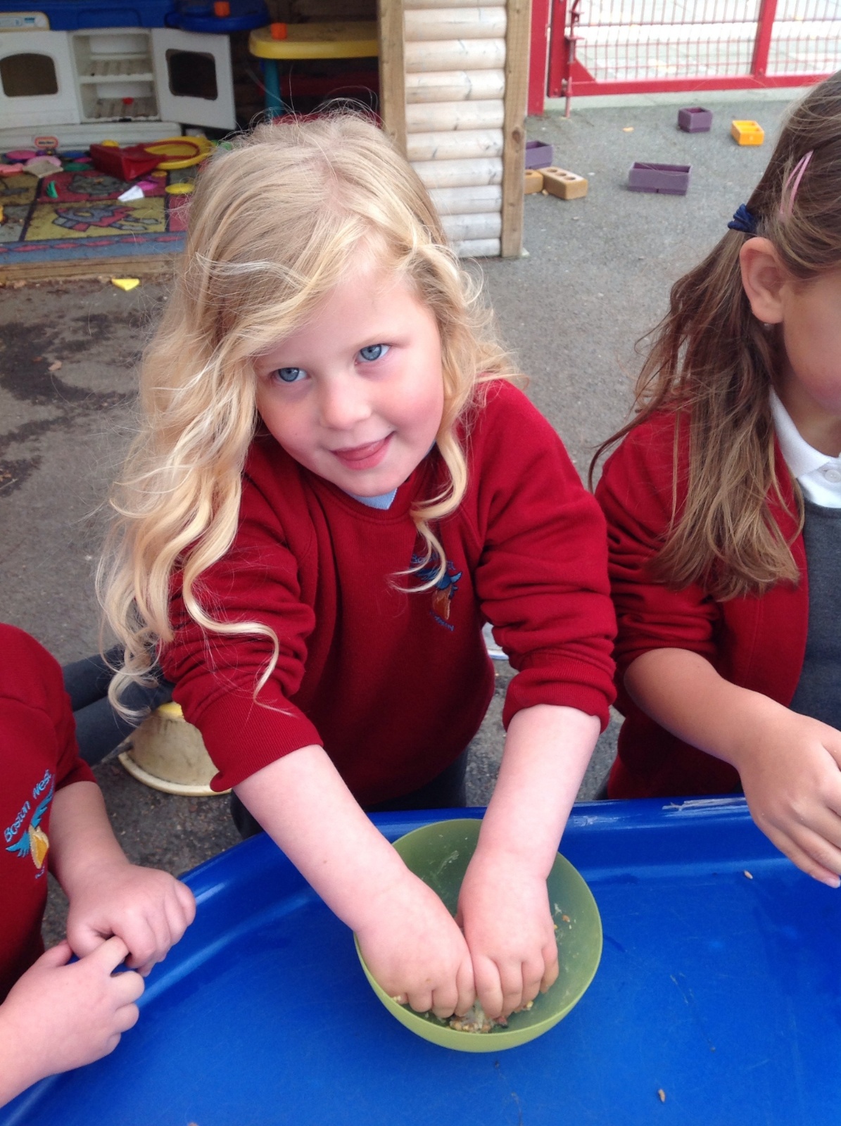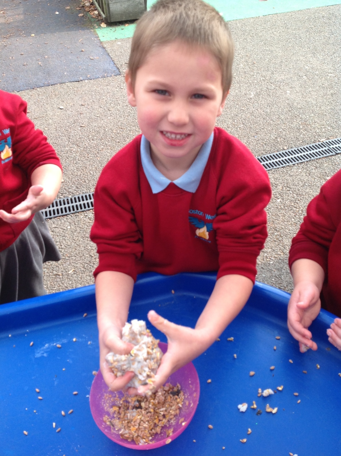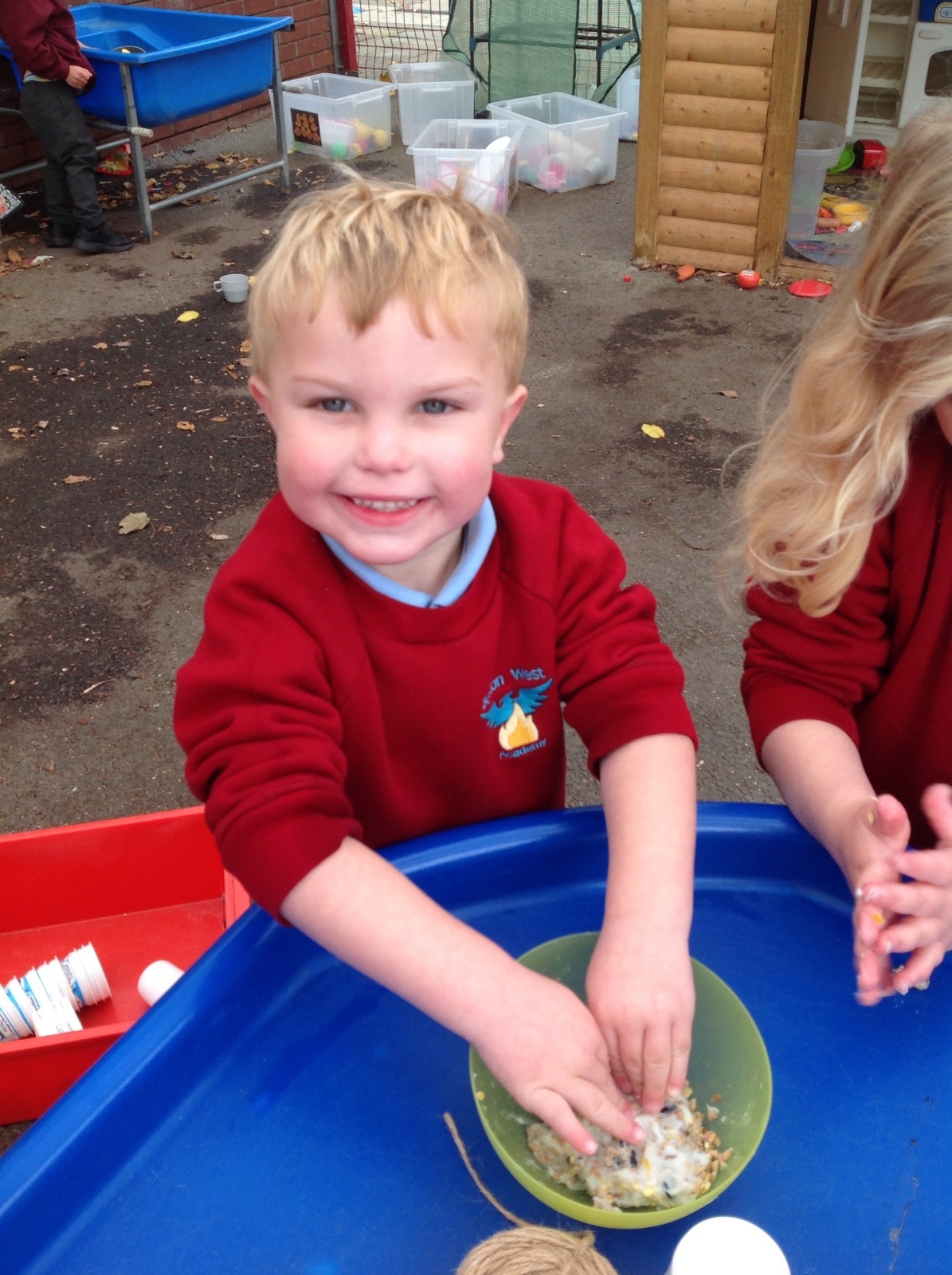 The children enjoyed learning about wildlife in the Autumn time and had great fun making bird feeders, mixing lard with bird seed and dried mealworms.